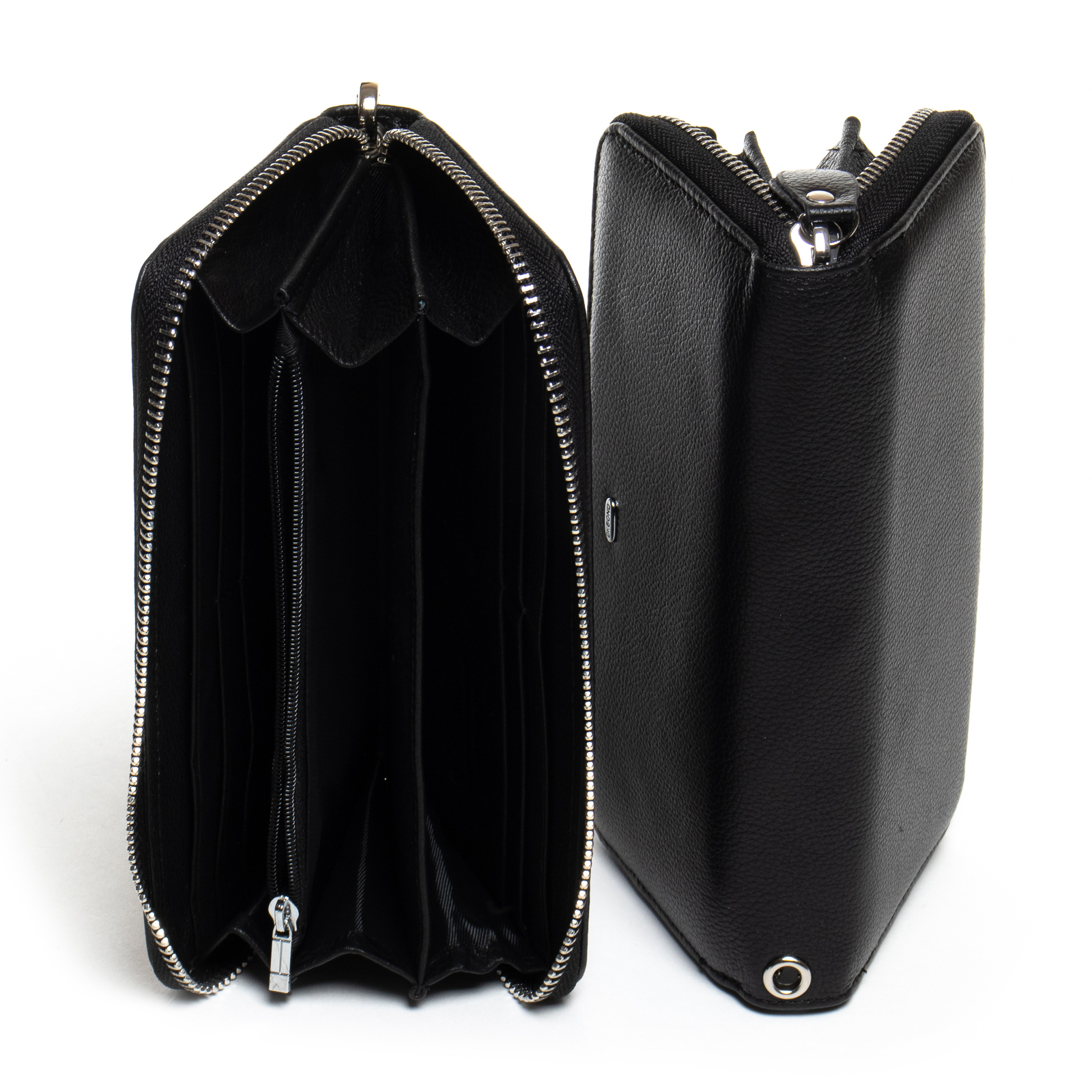 Внутри есть 3 отделения для банкнот, карман для мелочи на молнии, два больших открытых кармана и 8 карманов для визитных карт. В комплекте кистевой ремешок.