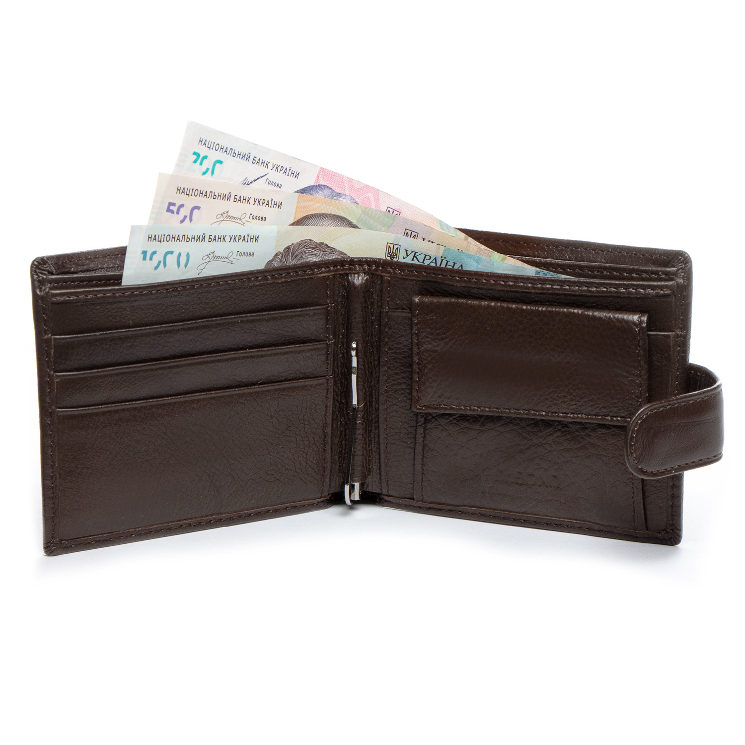 Мужской кожаный кошелек Dr.Bond с зажимом для денег. Изготовлен из мягкой натуральной кожи. Кожаные перегордки в отделениях для банкнот. Три отделения для банкнот, одно из которых закрывается на молнию. Монетница на кнопке и три кармана для карт. Снаружи на обратной стороне открытый карман. Размер (см.) 11,5*9,5*3