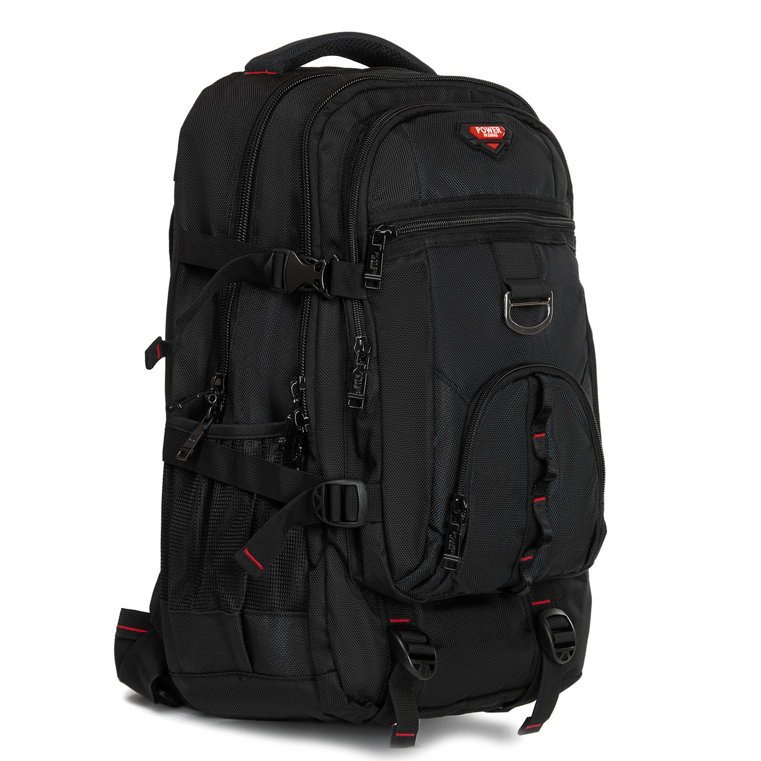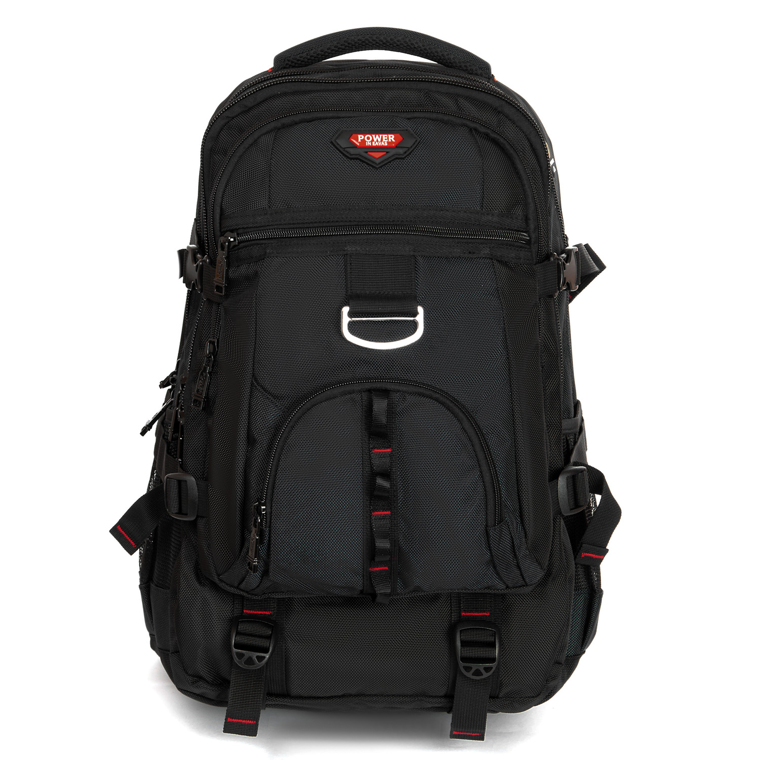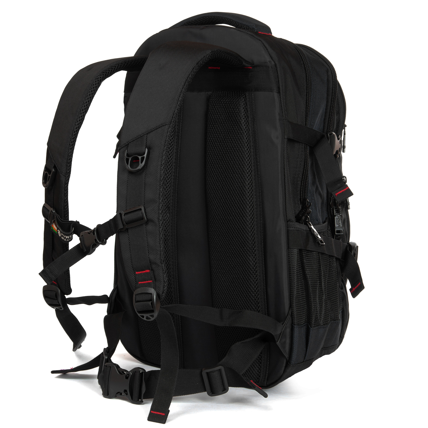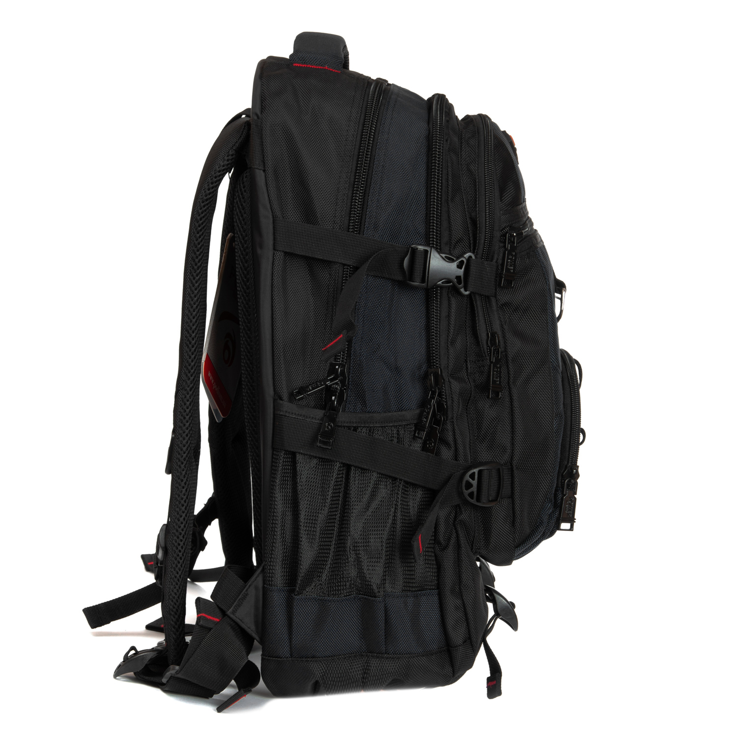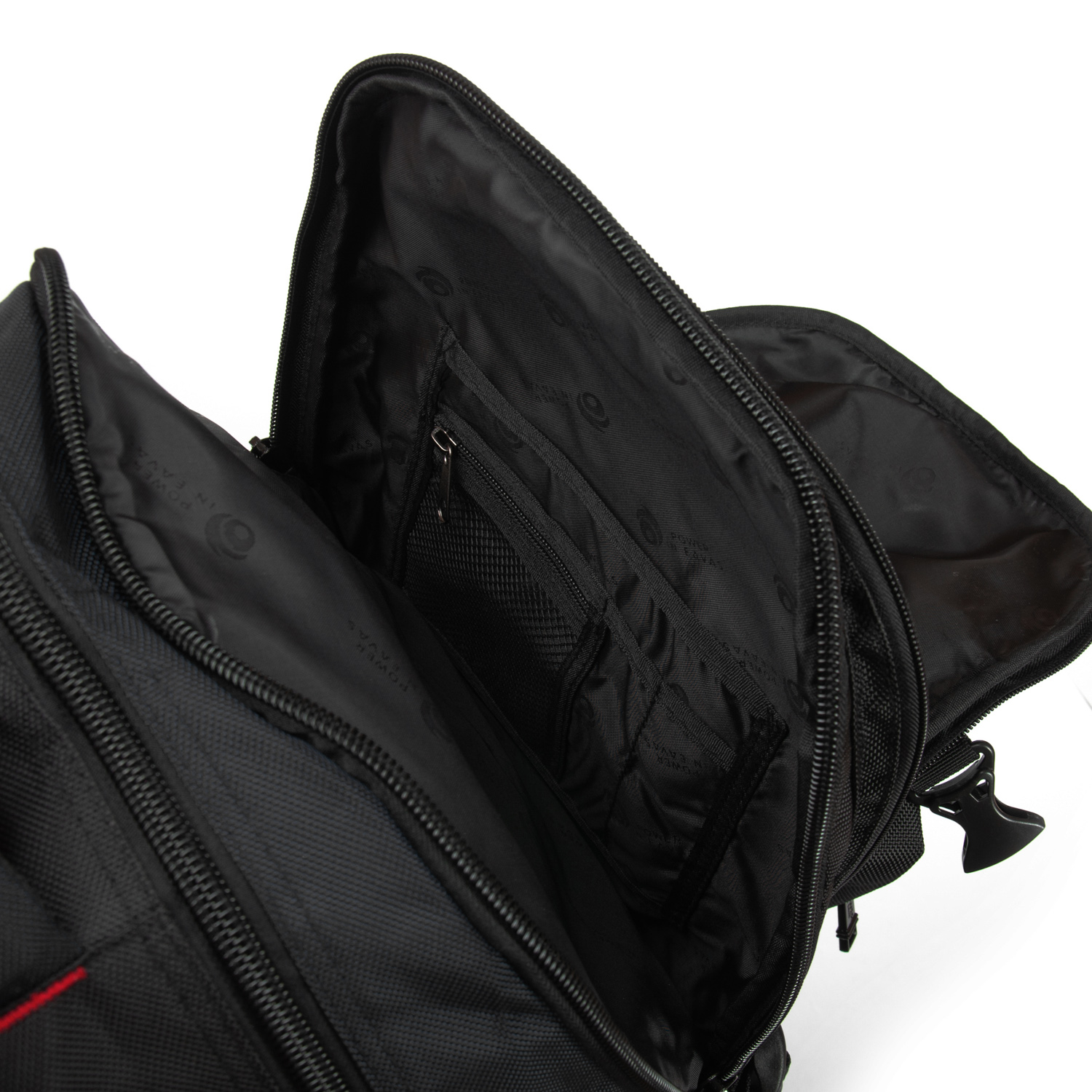 Три отделения, закрываются на молнию. Основное отделение с карманом для ноутбука, среднее отделение без карманов, в переднем отделении есть карман-органайзер. На фасаде рюкзака есть два кармана на молниях. На боковых сторонах рюкзака находятся карманы-сетки. Плечевые лямки регулируются по длине и оснащены грудной стяжкой и поясным ремнем.