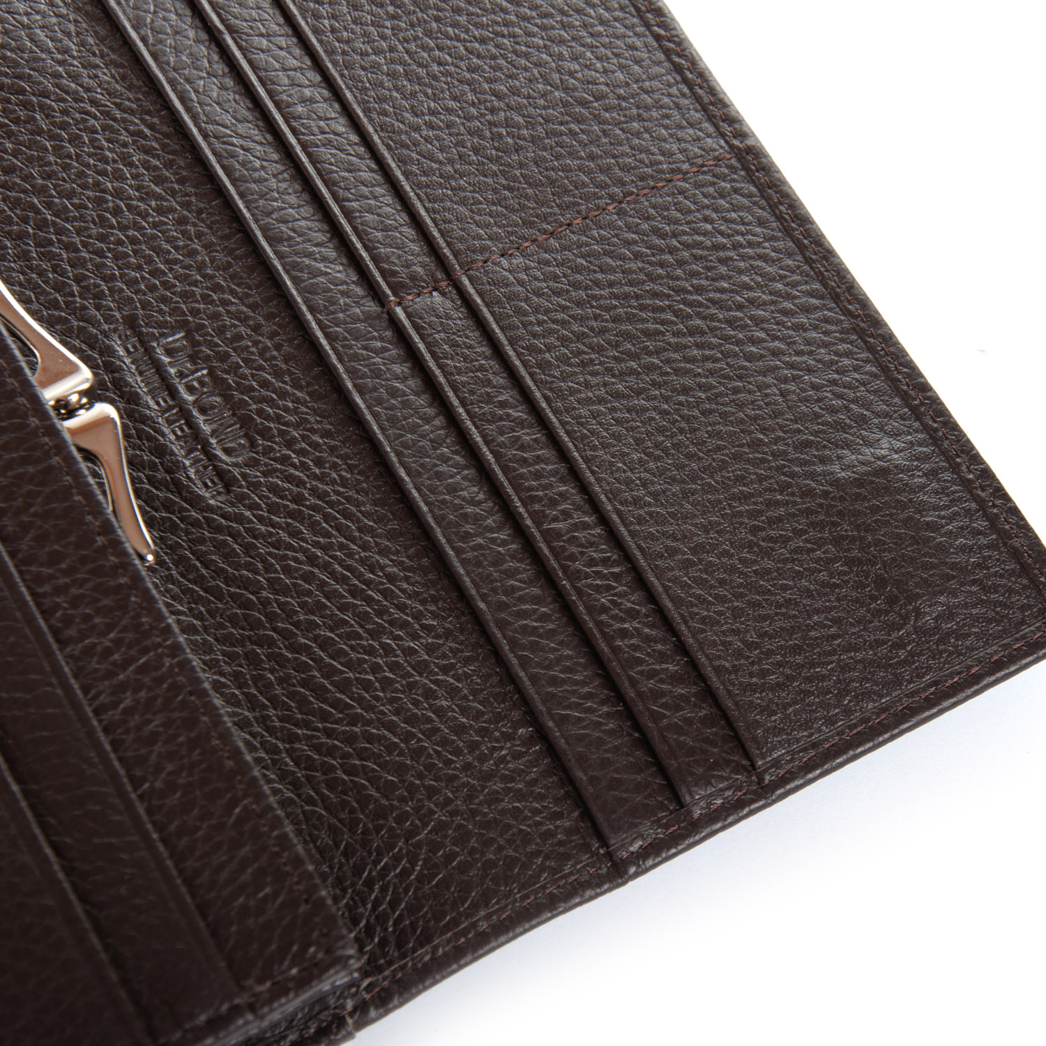 Внутри находятся три отделения для банкнот, монетница на защелке, большой открытый карман и карман на молнии. 8 карманов для визитных карт. Снаружи на обратной стороне расположен открытый карман.