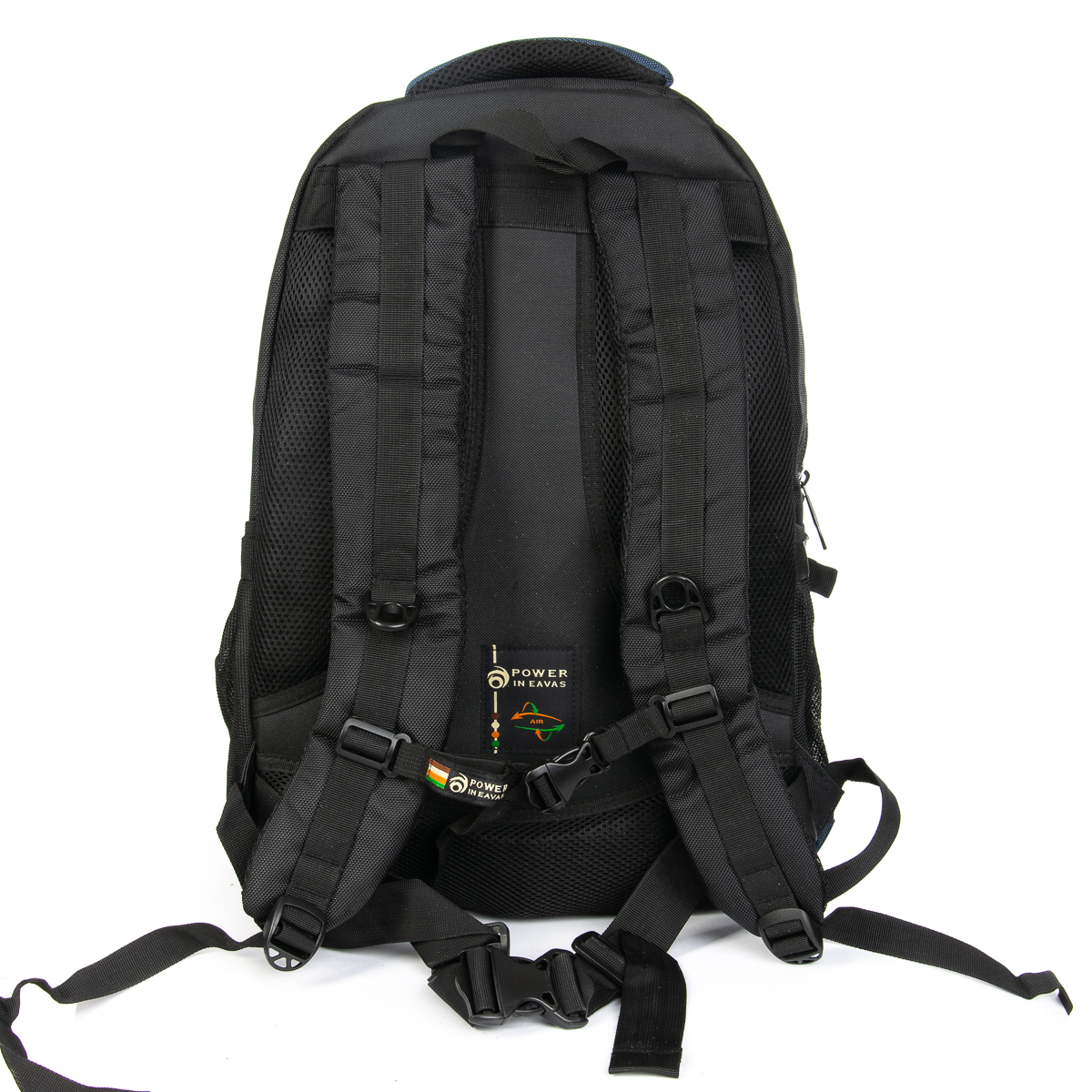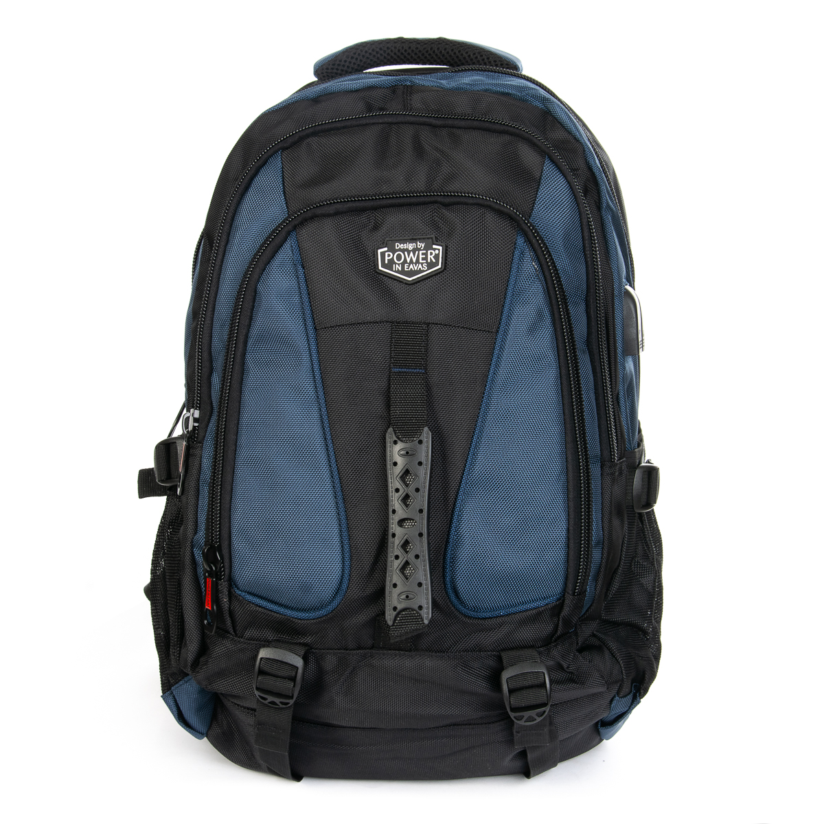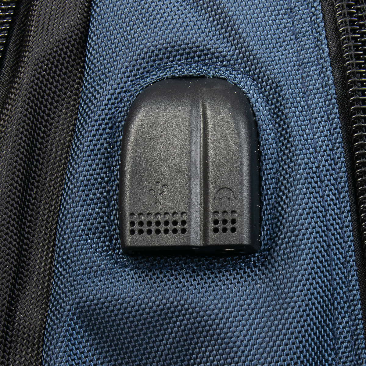 Плотная спинка с мягкими рельефными вставками для вентиляции. Внутри рюкзака находятся два отделения на молнии. В первом отделении расположен карман-органайзер, а во-втором отделении есть карман для ноутбука и карман для телефона. Также, из второго отделения выведены USB и кабель для наушников на внешнюю стенку рюкзака. На фасаде находится большой карман на молнии. Снаружи на боковых сторонах рюкзака расположены карманы-сетки для бутылок воды объемом 0,5 литров. Плечевые лямки регулируются по длине и оснащены грудной стяжкой и поясным ремнем.