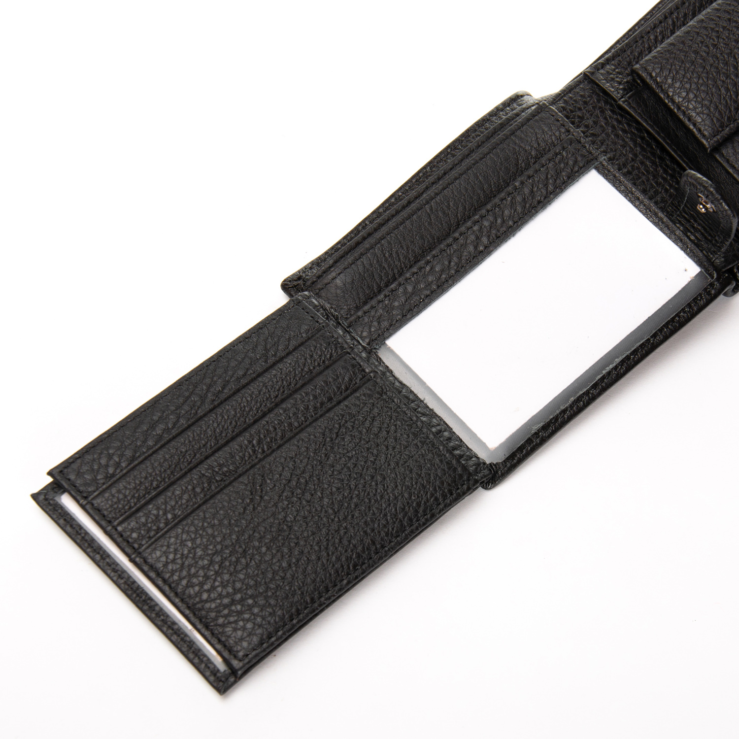 Изготовлен из мягкой натуральной кожи. Внутри есть два открытых и одно на молнии отделения для банкнот, 3 кармана для визитных карт, 4 прозрачных кармана в отдельном блоке и монетница на кнопке.