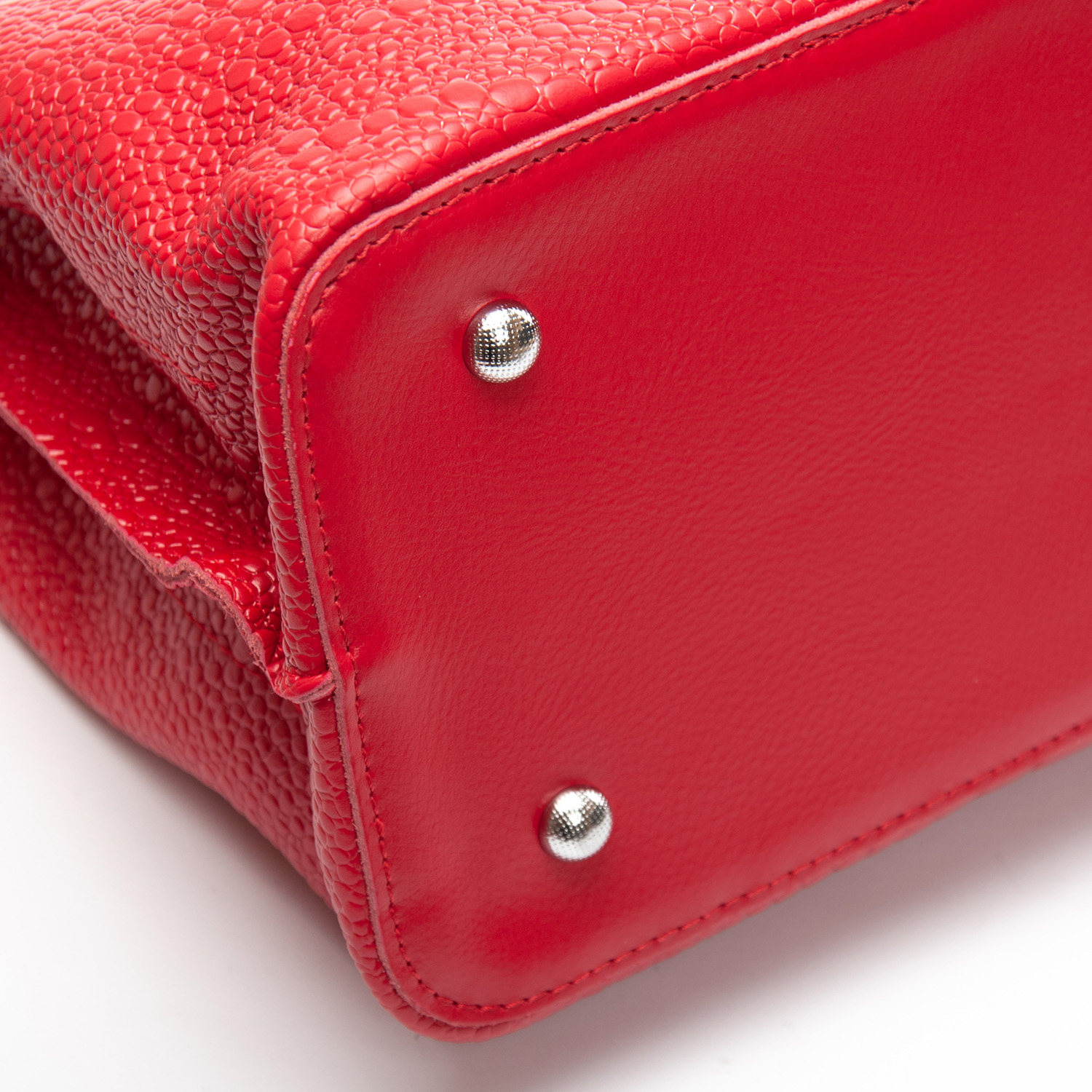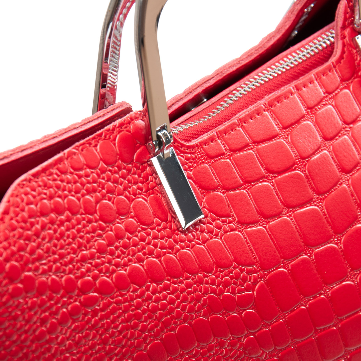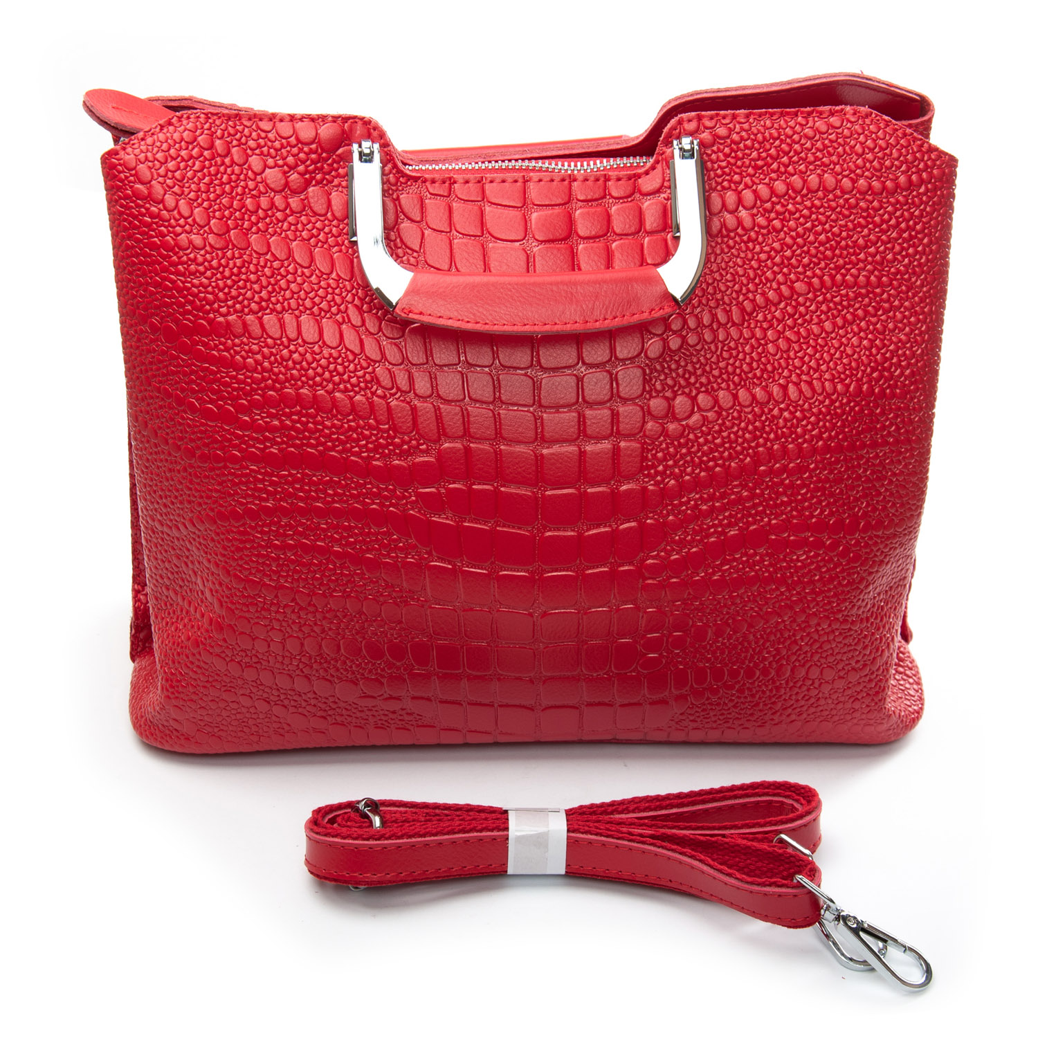 Три отделения: центральное закрывается на молнию, а боковые на магнитные кнопки. Внутри центральное отделение разделено карманом-перегородкой на молнии, также есть двойной открытый карман и карман на молнии. Литые металлические ручки с кожаными вставками. Дно сумки жесткое, с металлическими ножками. В комплекте регулируемый плечевой ремень.