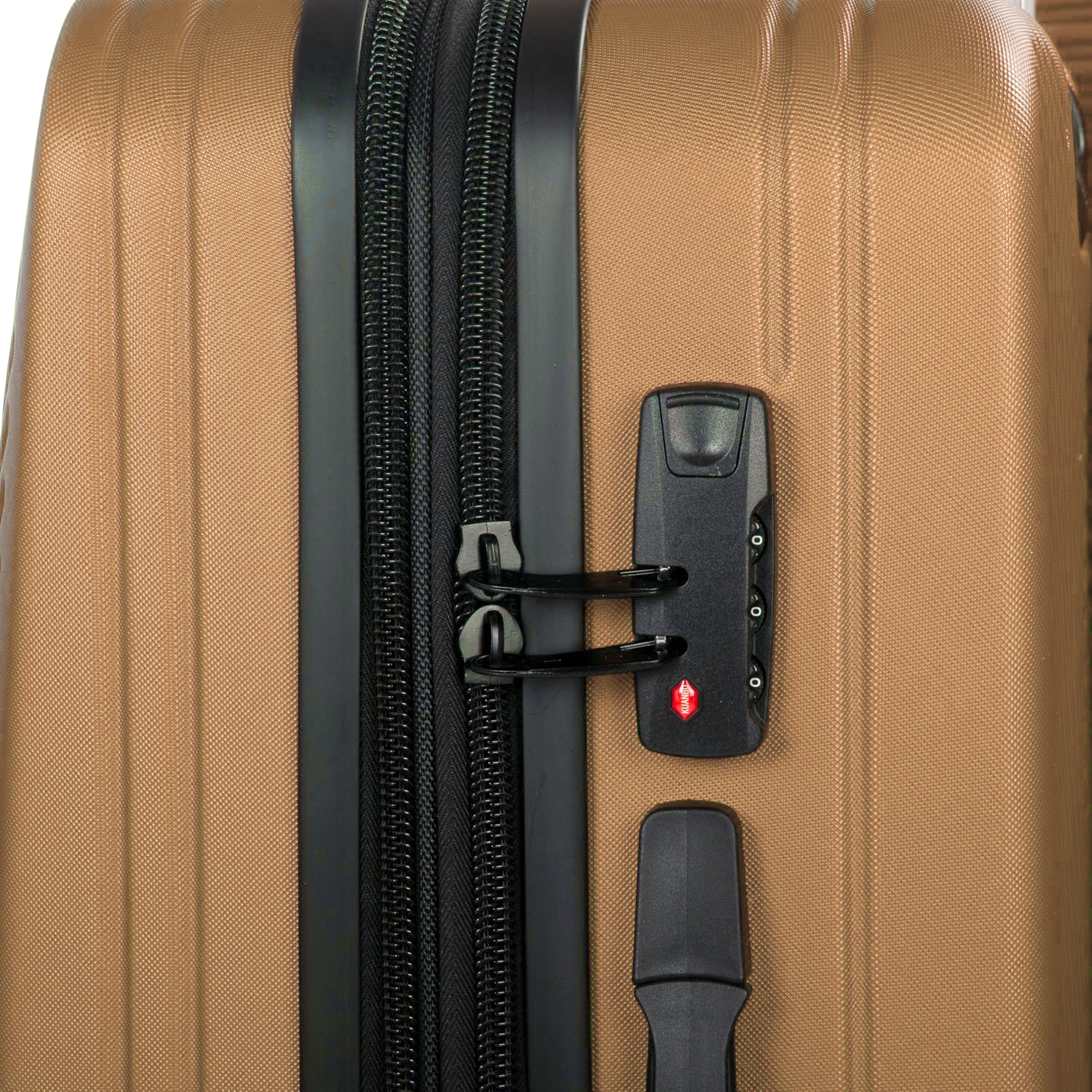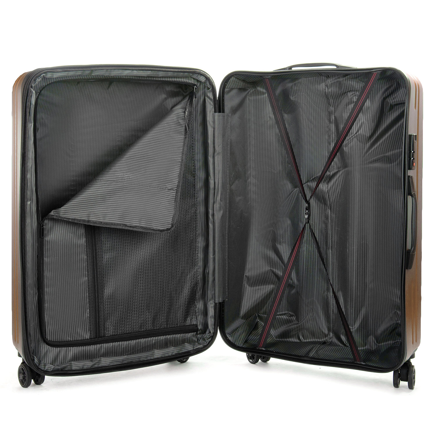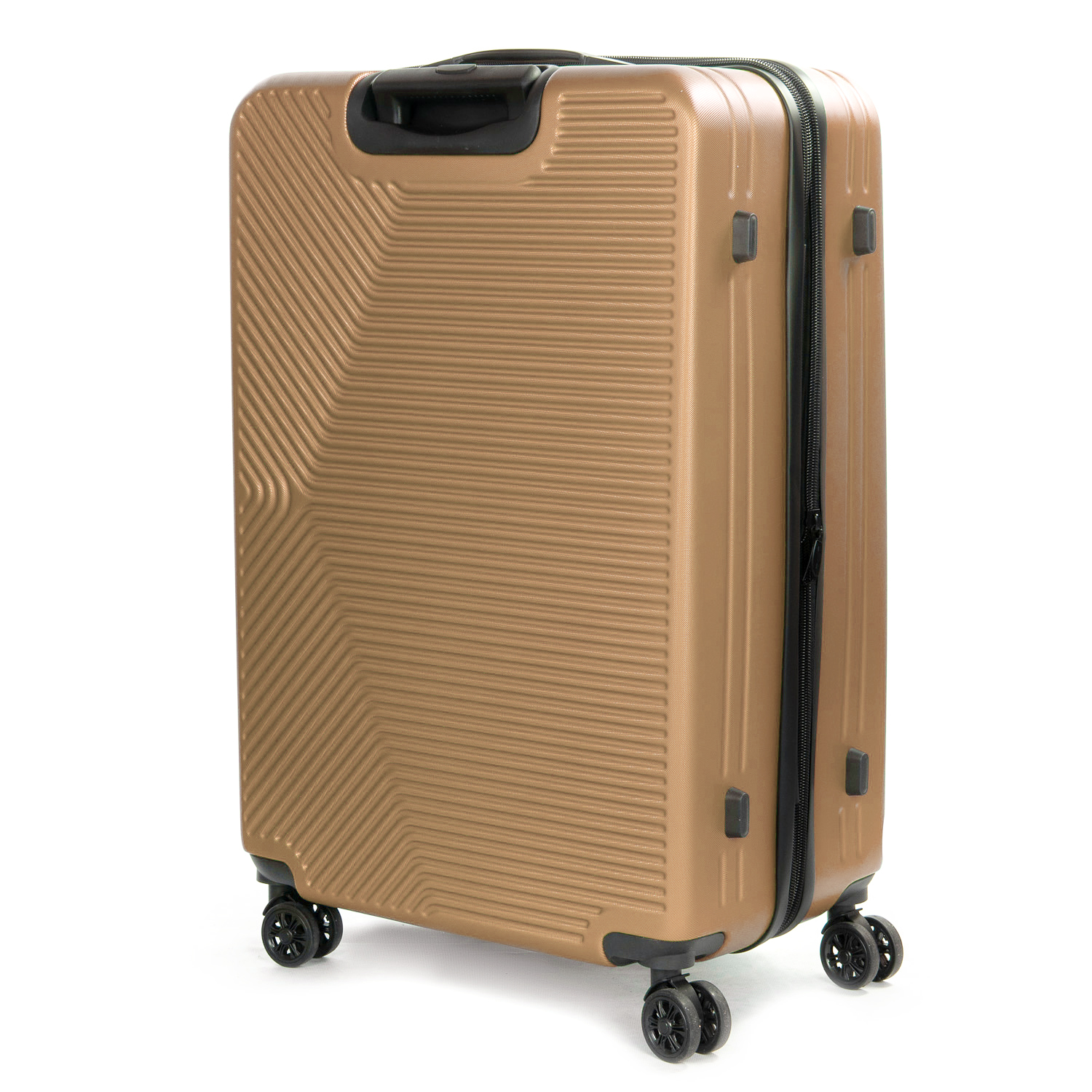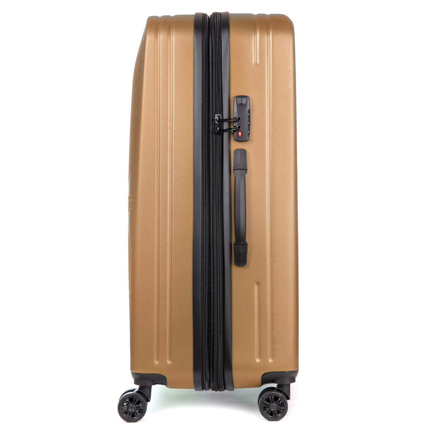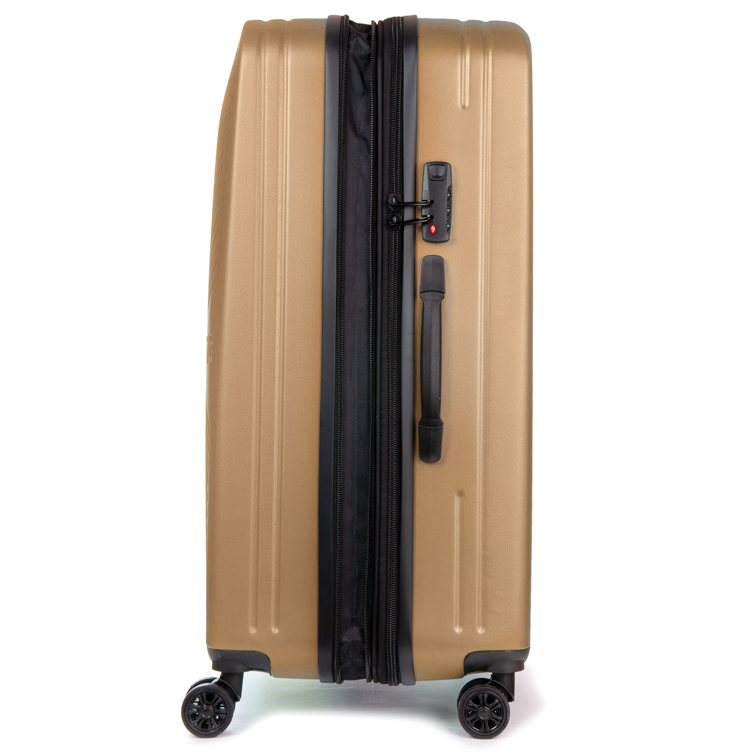 Пластиковый чемодан, выполненный из ударопрочного ABS пластика. Закрывается на молнию с кодовым замком. Объем чемодана можно увеличить используя молнию расширения (увеличивает глубину чемодана на 3см.). 4 полиуретановых двойных колеса. Внутри чемодана есть двойной отделение с карманом-перегородкой на молнии для мелких вещей и стяжки-резинки для фиксации багажа.