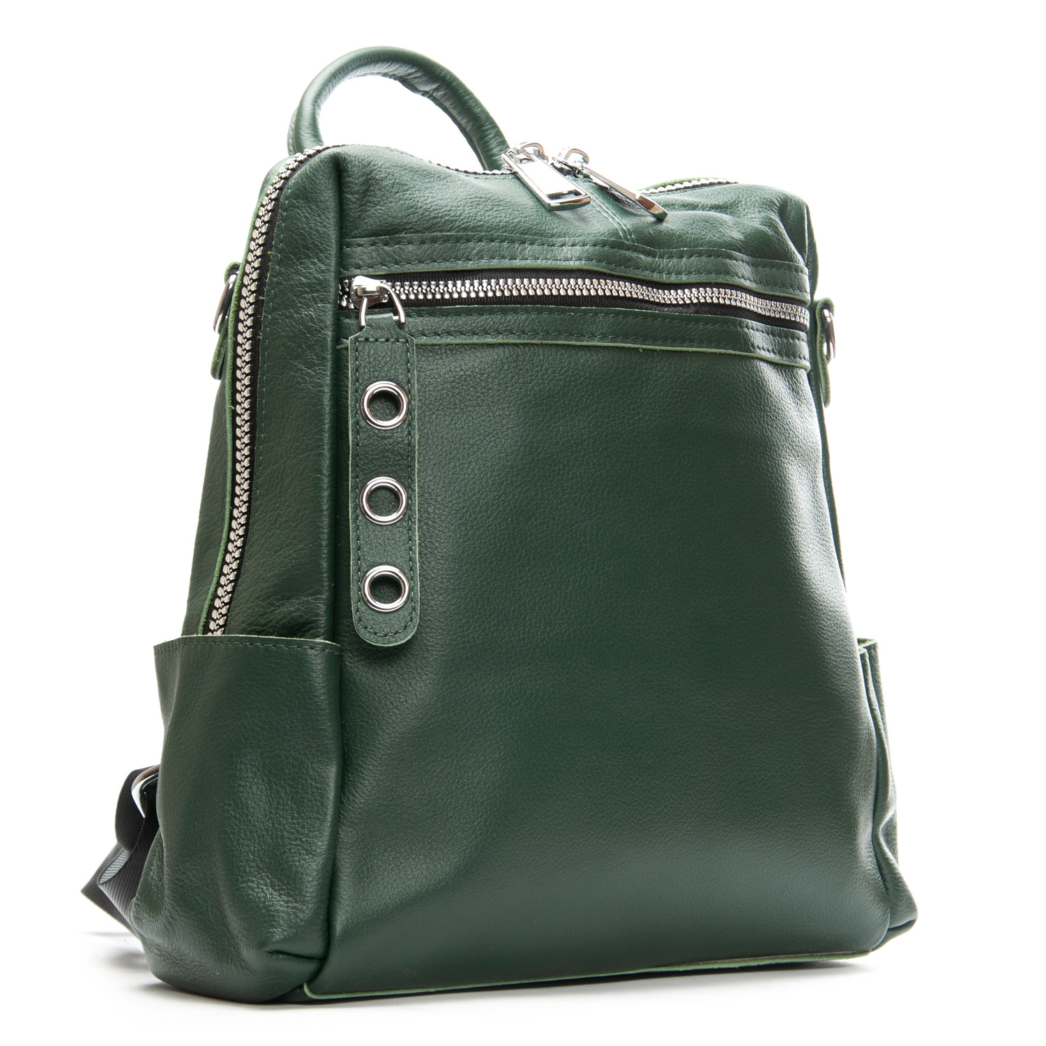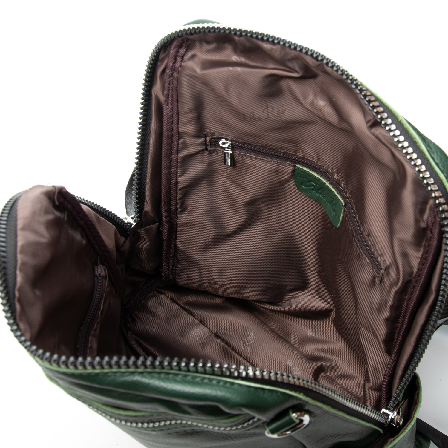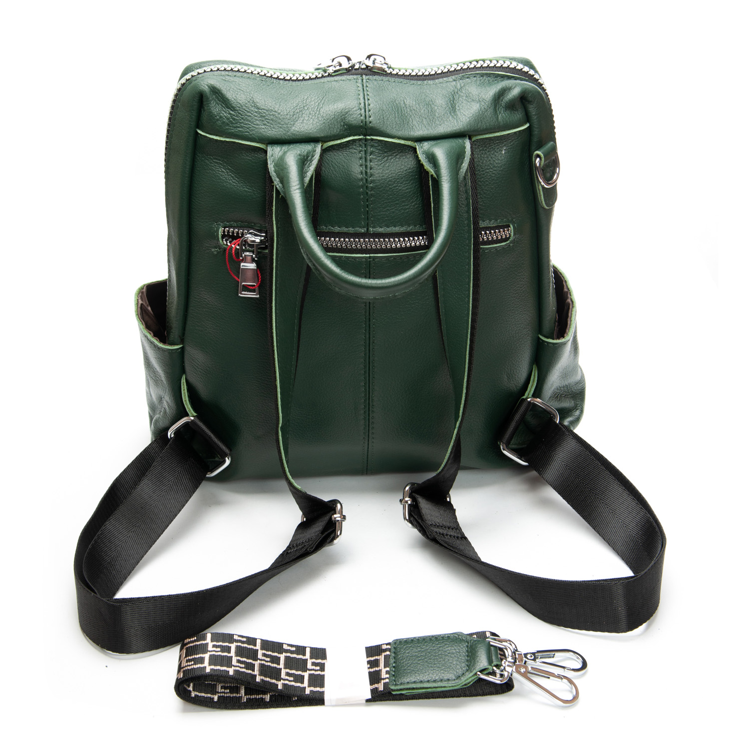 Можно носить на плече на широком ремне. Закрывается на молнию. Внутри находится основное и дополнительное отделение, разделенное карманом-перегородкой на молнии и карман на молнии. Снаружи рюкзака на фасаде и обратной стороне расположены карманы на молнии. На торцах рюкзака есть небольшие открытые карманы. Плечевые лямки регулируются по длине.