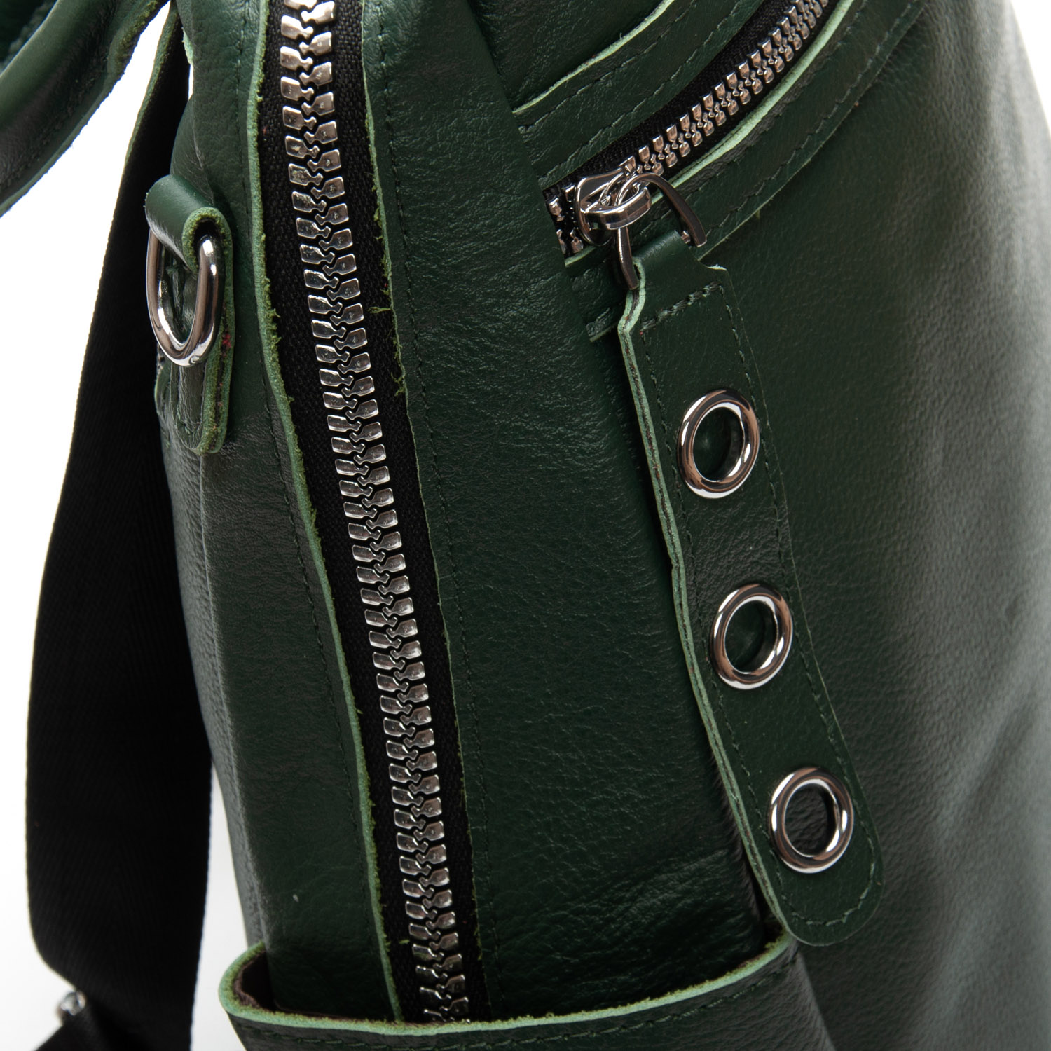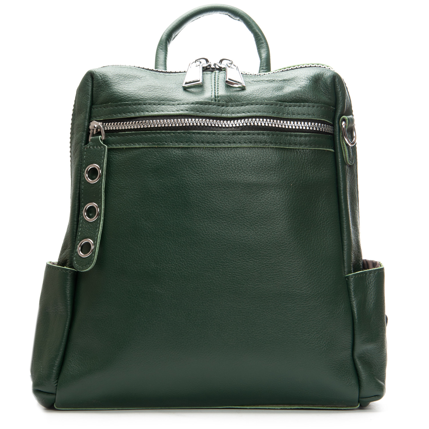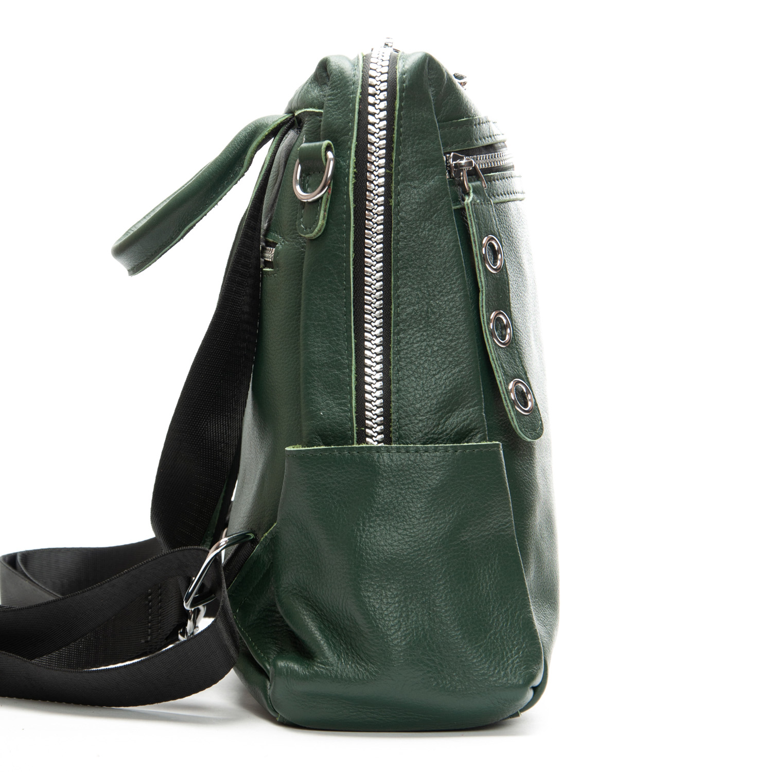 Можно носить на плече на широком ремне. Закрывается на молнию. Внутри находится основное и дополнительное отделение, разделенное карманом-перегородкой на молнии и карман на молнии. Снаружи рюкзака на фасаде и обратной стороне расположены карманы на молнии. На торцах рюкзака есть небольшие открытые карманы. Плечевые лямки регулируются по длине.