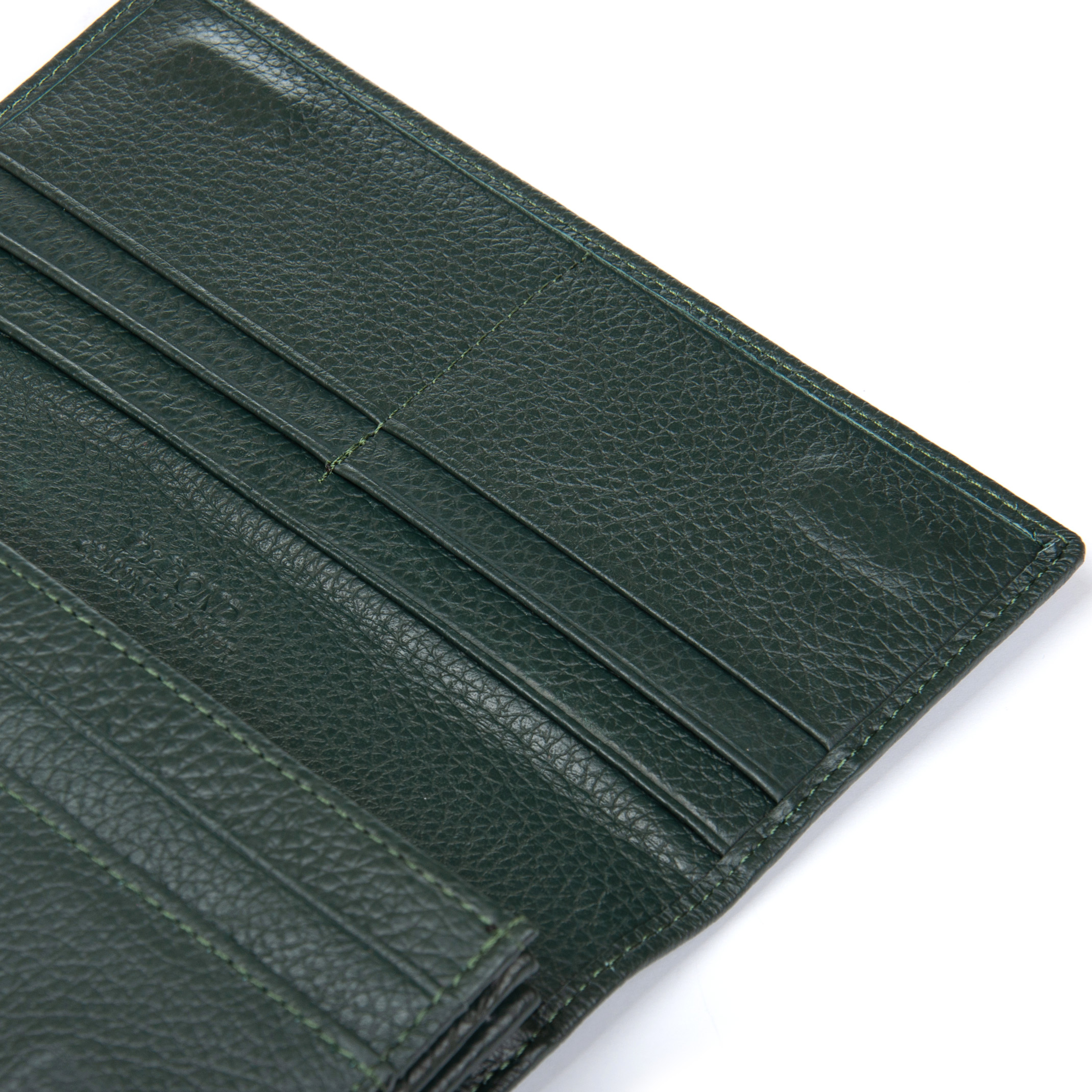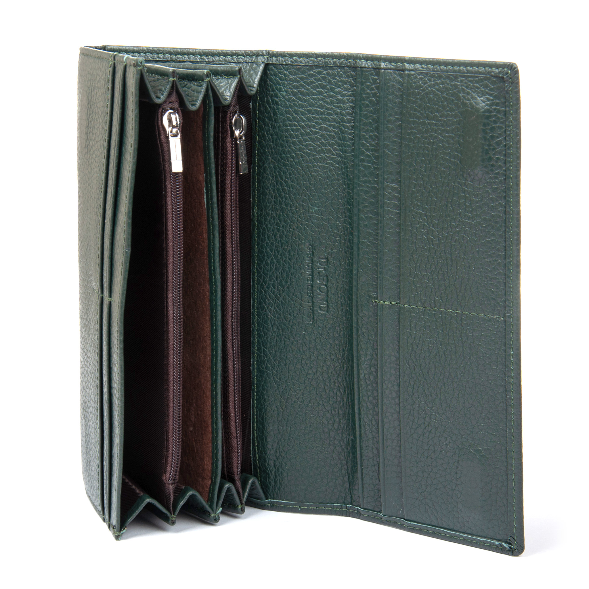 Внутри находятся 4 отделения для банкнот, два кармана-монетницы на молнии, большой открытый карман и 8 карманов для карт и визиток. Снаружи кошелька на обратной стороне есть карман на молнии.