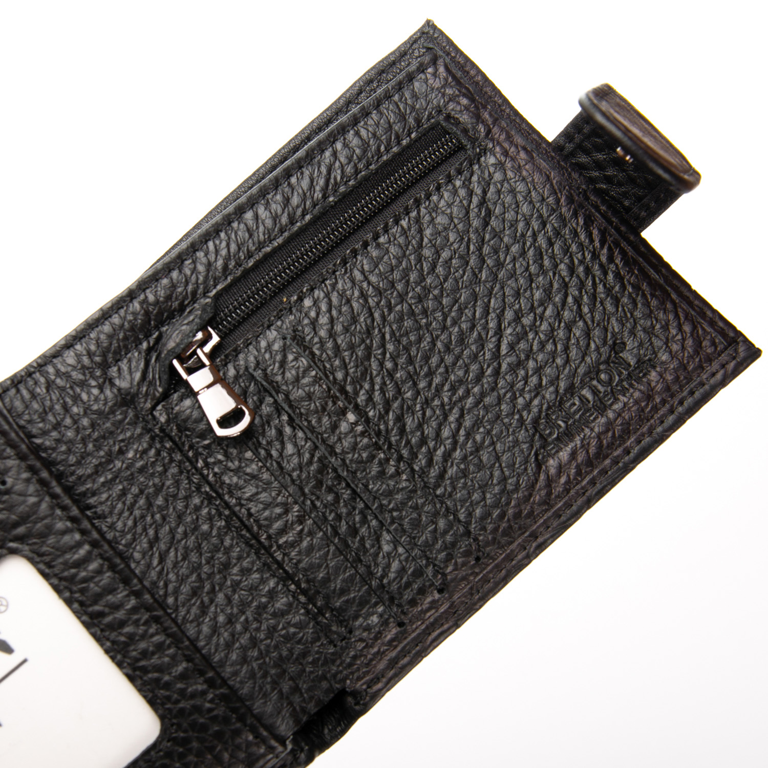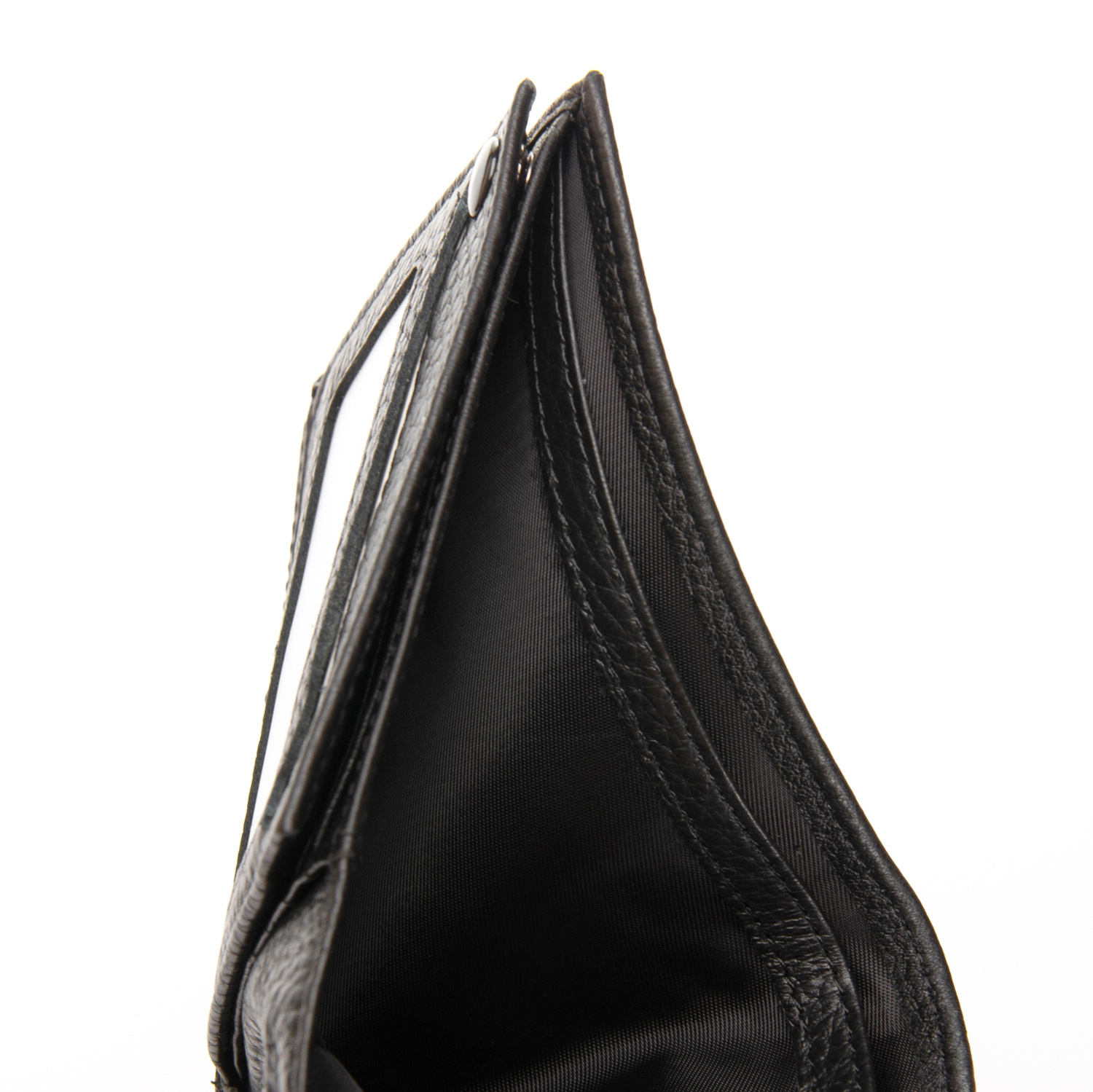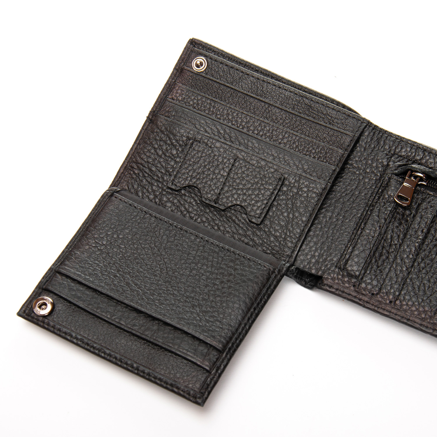 Изготовлен из мягкой натуральной кожи. Внутри есть: два открытых отделения для банкнот, 7 карманов для визитных карт на откидном блоке и монетница на молнии.