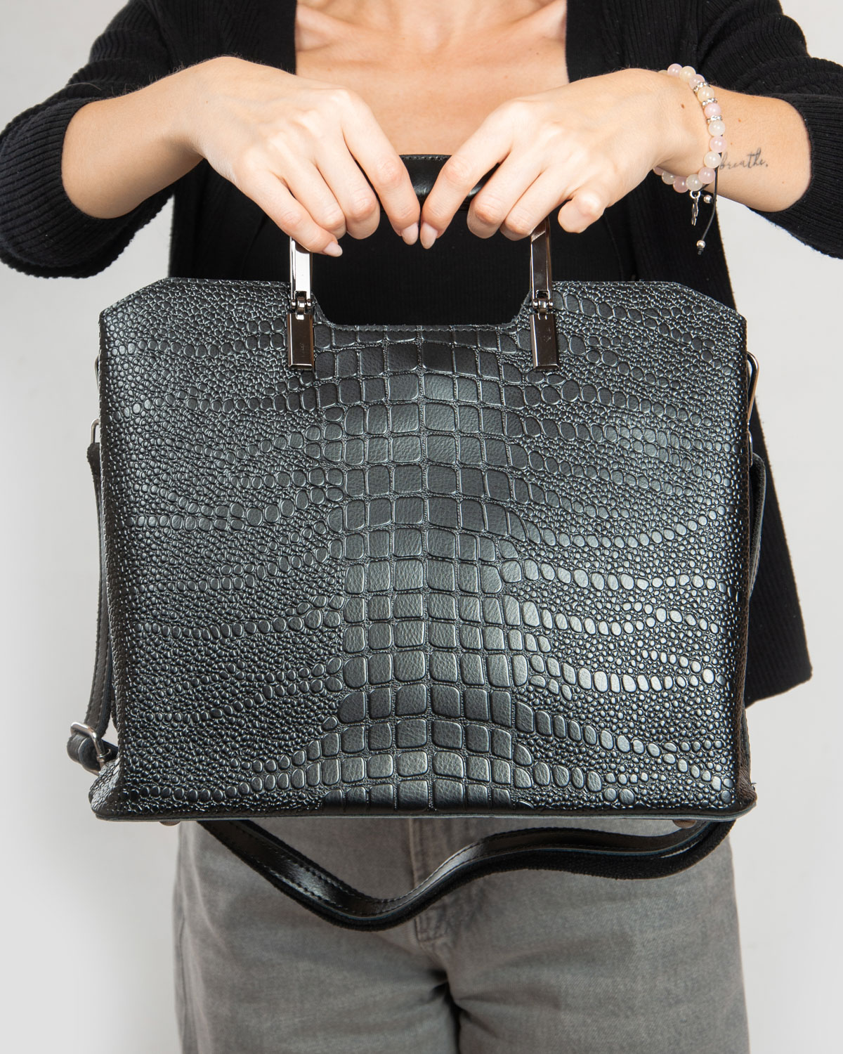 Три отделения: центральное закрывается на молнию, а боковые на магнитные кнопки. Внутри центральное отделение разделено карманом-перегородкой на молнии, также есть двойной открытый карман и карман на молнии. Литые металлические ручки с кожаными вставками. Дно сумки жесткое, с металлическими ножками.