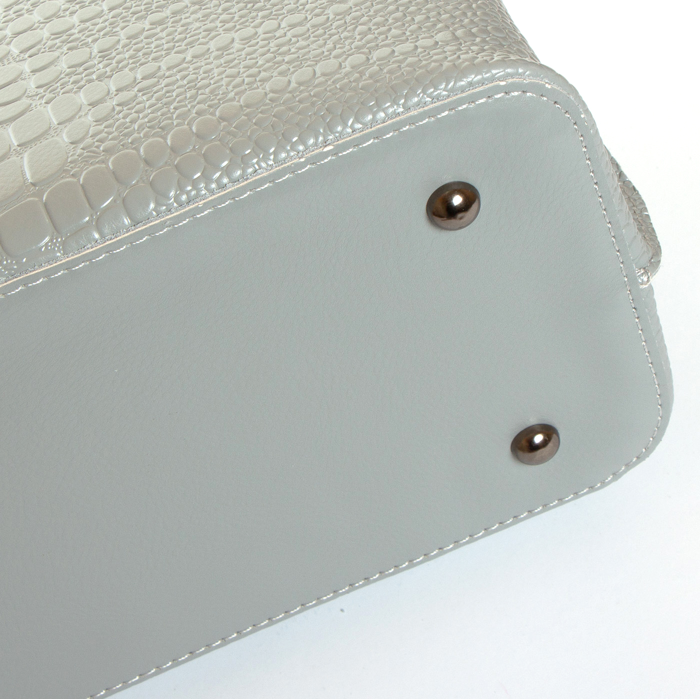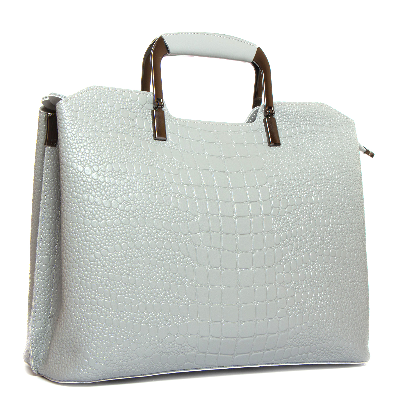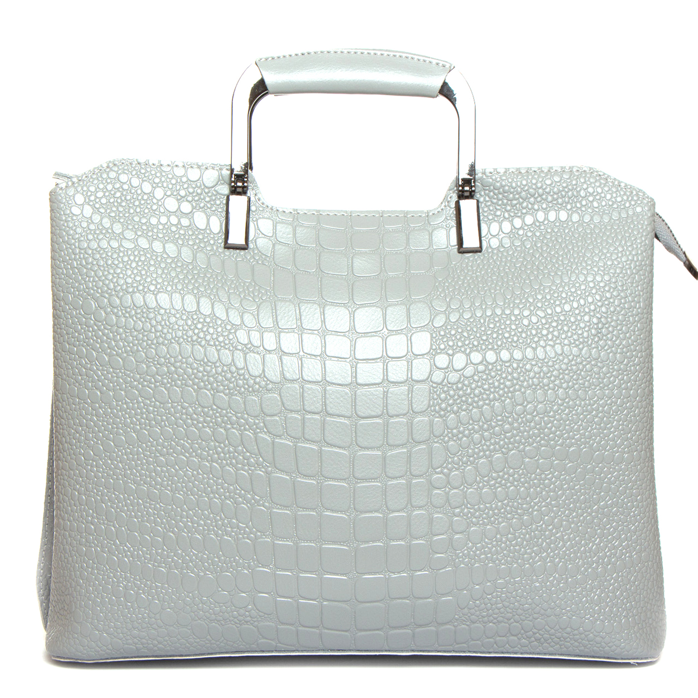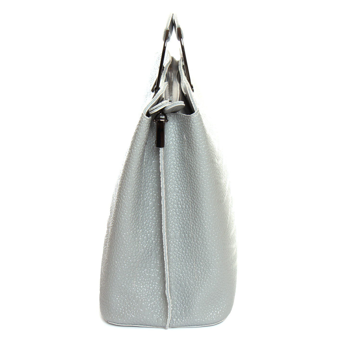 Три отделения: центральное закрывается на молнию, а боковые на магнитные кнопки. Внутри центральное отделение разделено карманом-перегородкой на молнии, также есть двойной открытый карман и карман на молнии. Литые металлические ручки с кожаными вставками. Дно сумки жесткое, с металлическими ножками.