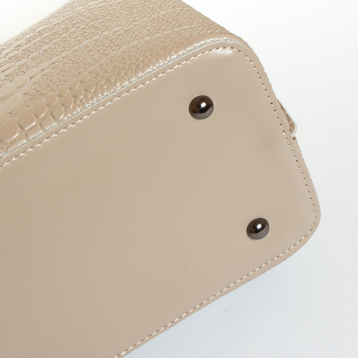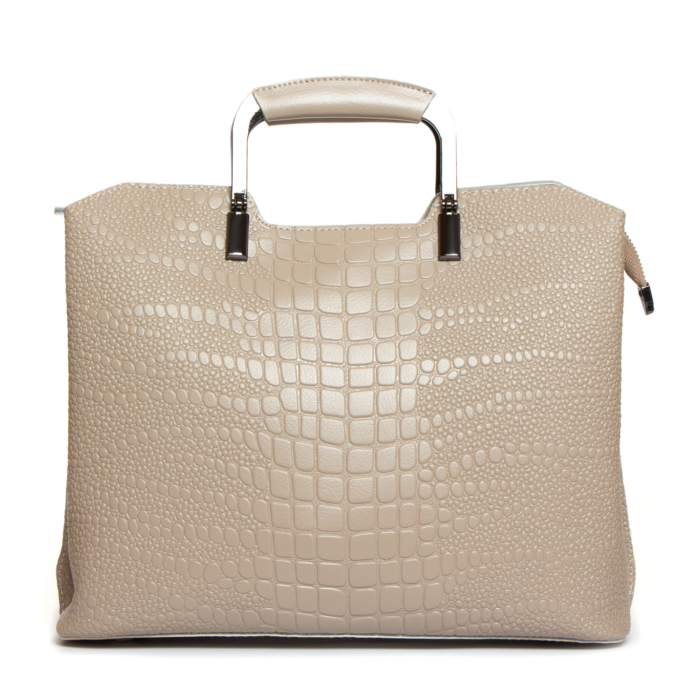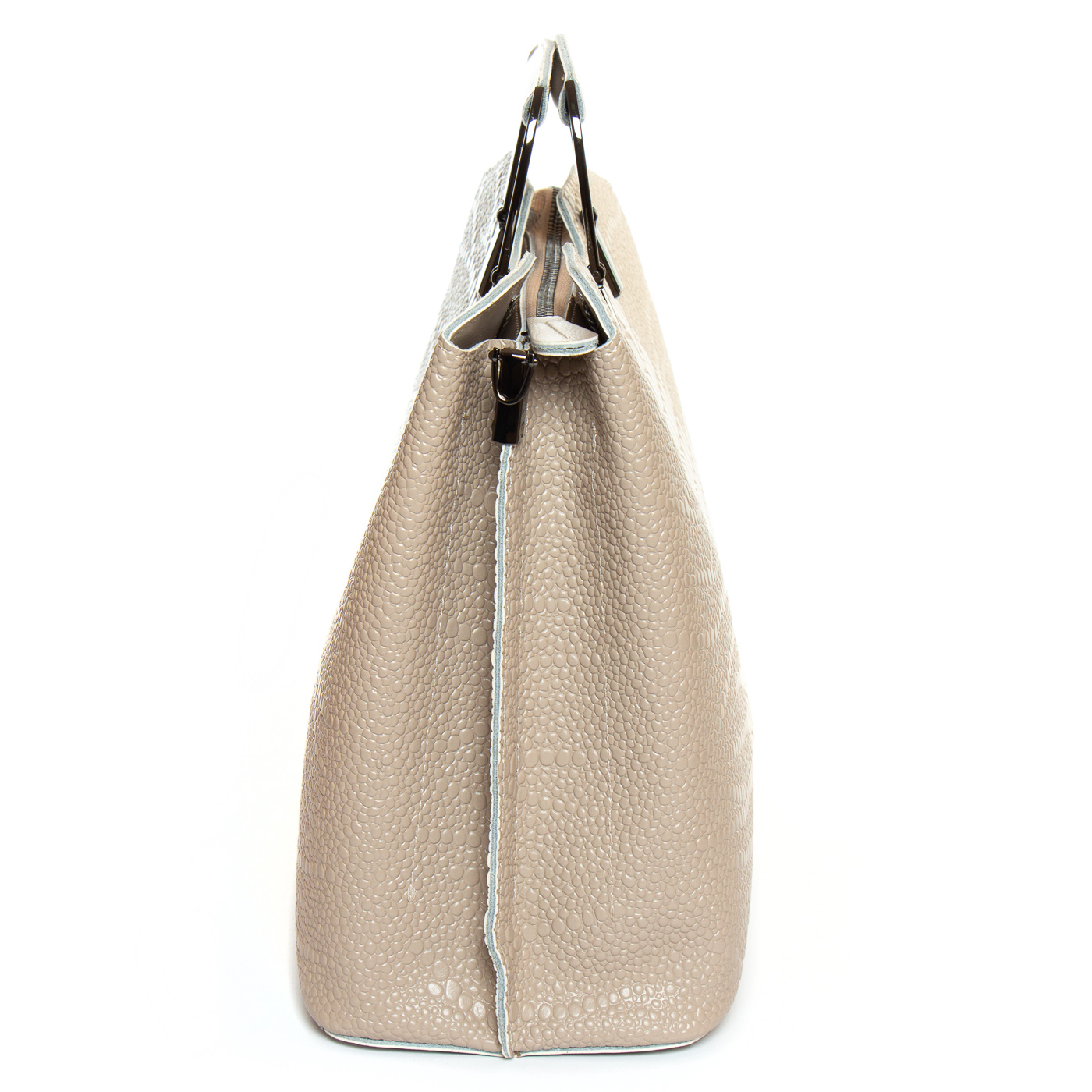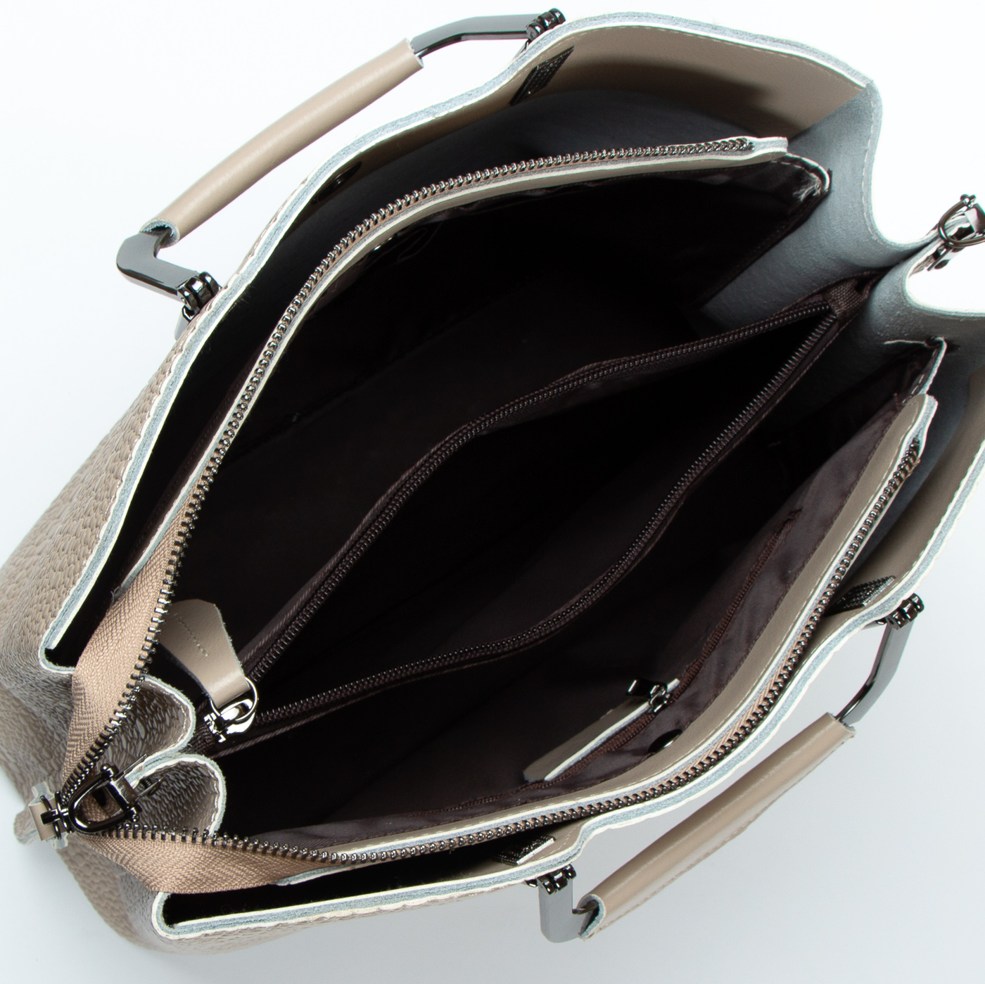 Три отделения: центральное закрывается на молнию, а боковые на магнитные кнопки. Внутри центральное отделение разделено карманом-перегородкой на молнии, также есть двойной открытый карман и карман на молнии. Литые металлические ручки с кожаными вставками. Дно сумки жесткое, с металлическими ножками.