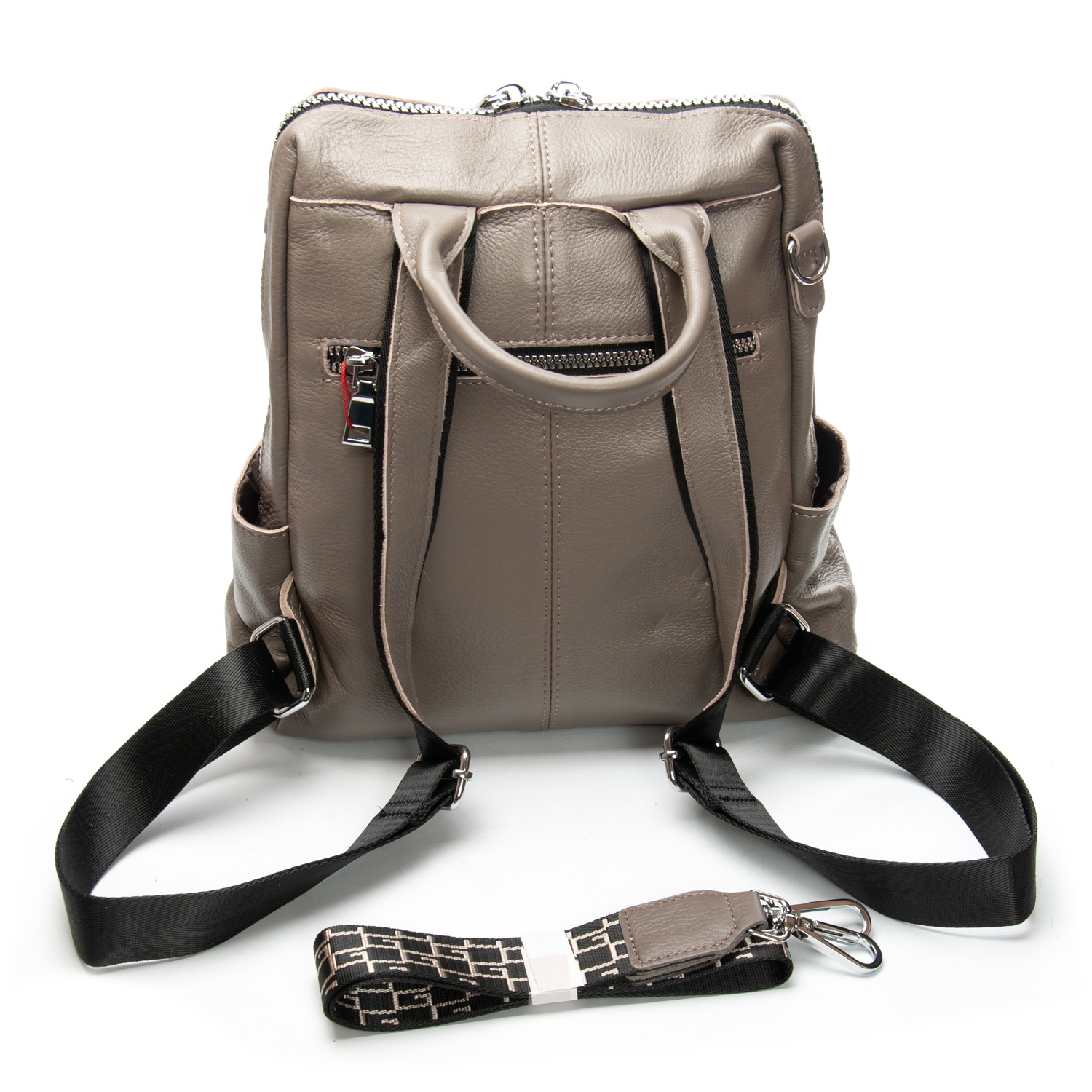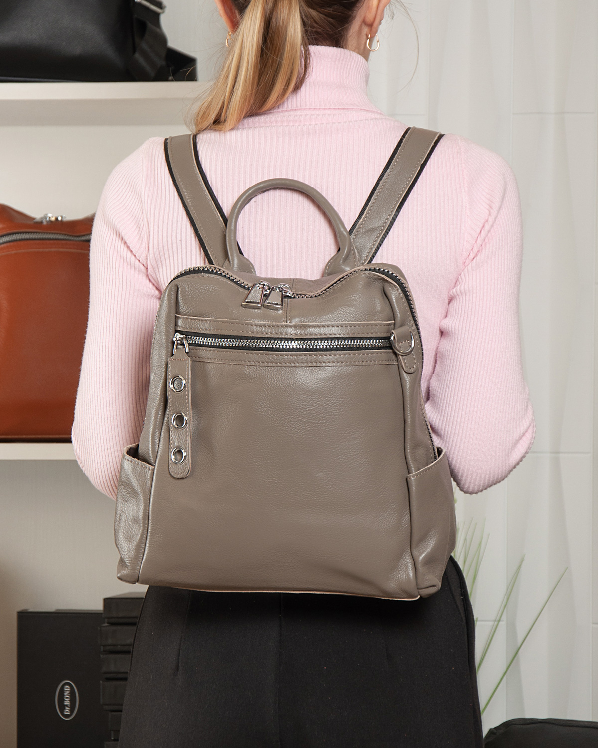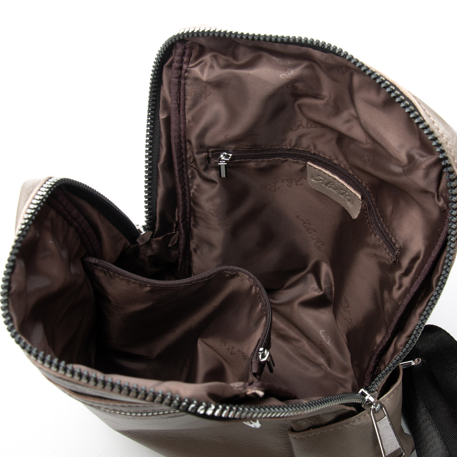 Можно носить на плече на широком ремне. Закрывается на молнию. Внутри находится основное и дополнительное отделение, разделенное карманом-перегородкой на молнии и карман на молнии. Снаружи рюкзака на фасаде и обратной стороне расположены карманы на молнии. На торцах рюкзака есть небольшие открытые карманы. Плечевые лямки регулируются по длине.