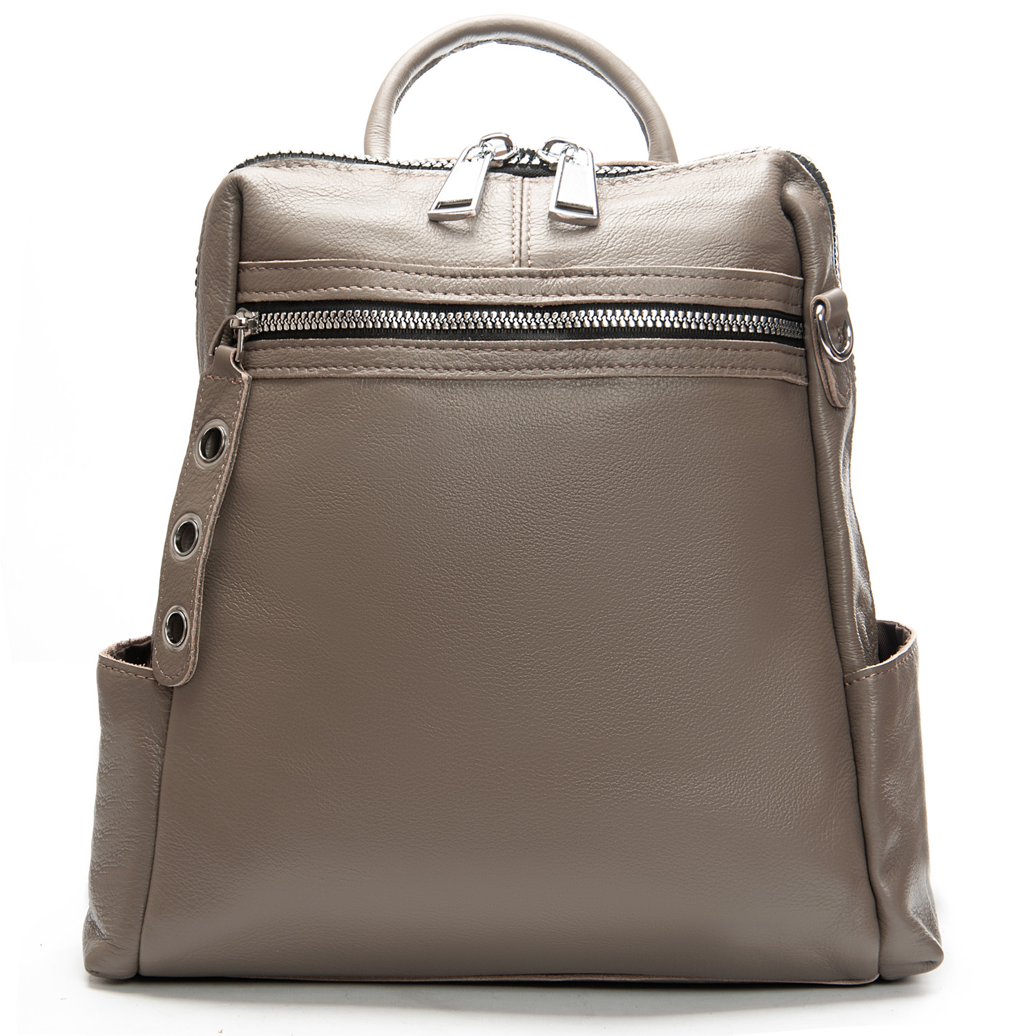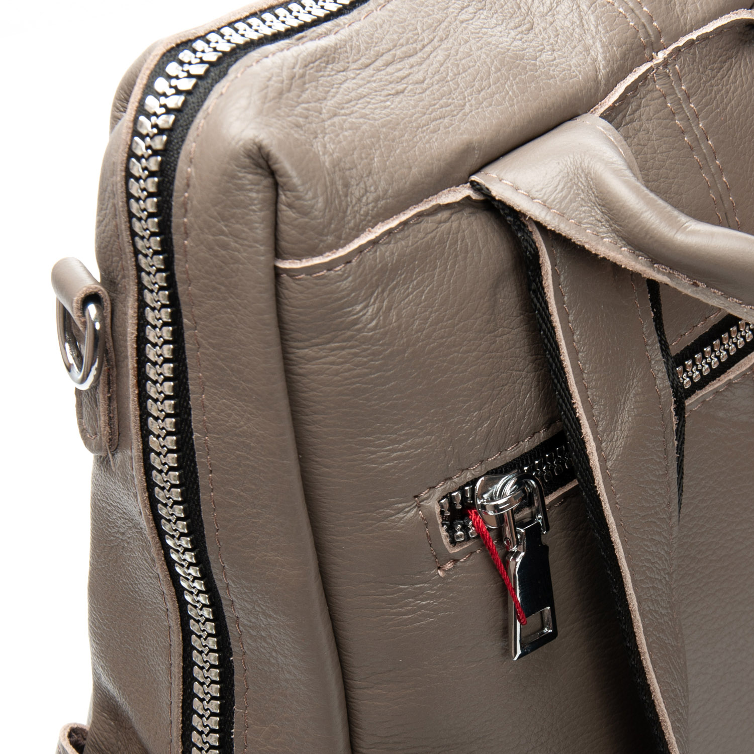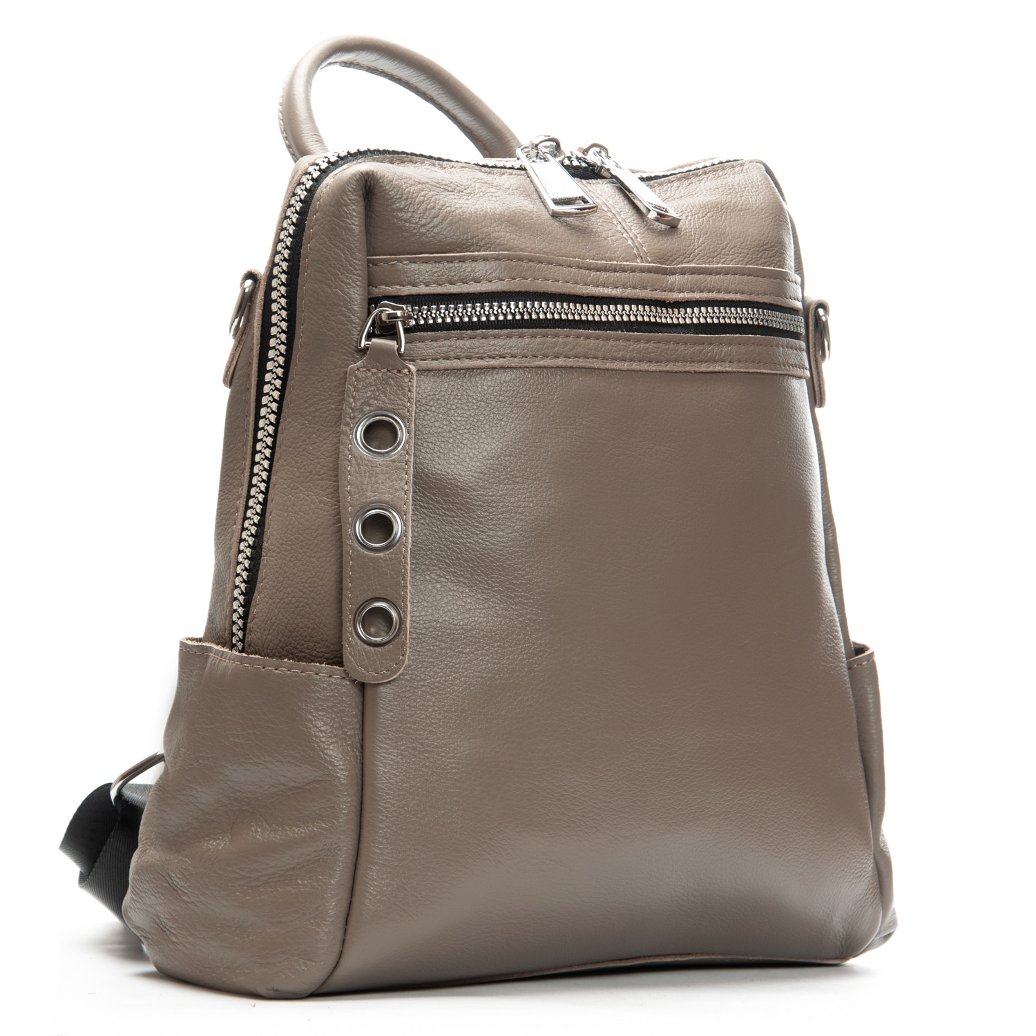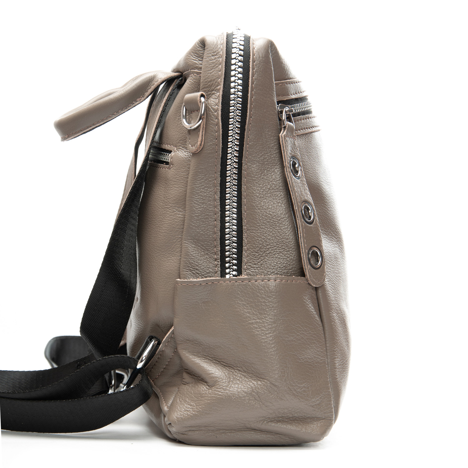 Можно носить на плече на широком ремне. Закрывается на молнию. Внутри находится основное и дополнительное отделение, разделенное карманом-перегородкой на молнии и карман на молнии. Снаружи рюкзака на фасаде и обратной стороне расположены карманы на молнии. На торцах рюкзака есть небольшие открытые карманы. Плечевые лямки регулируются по длине.
