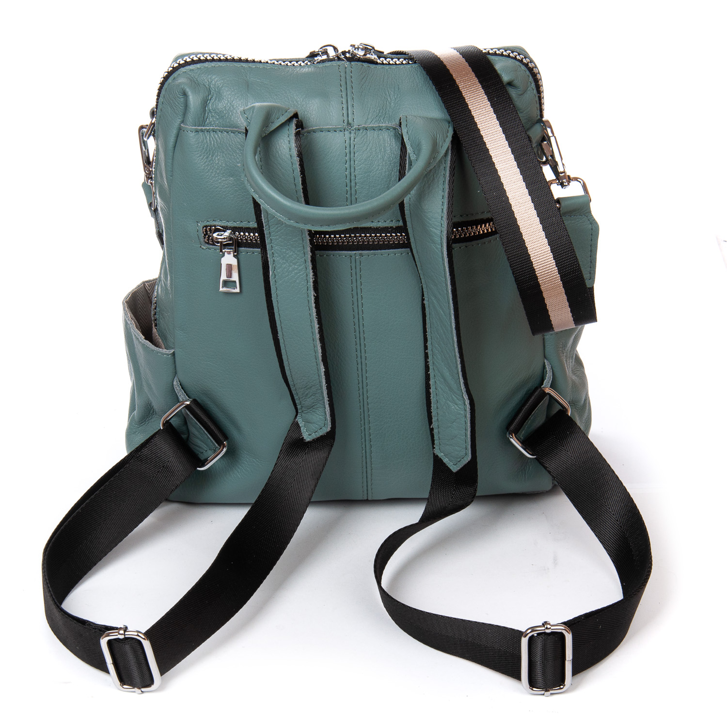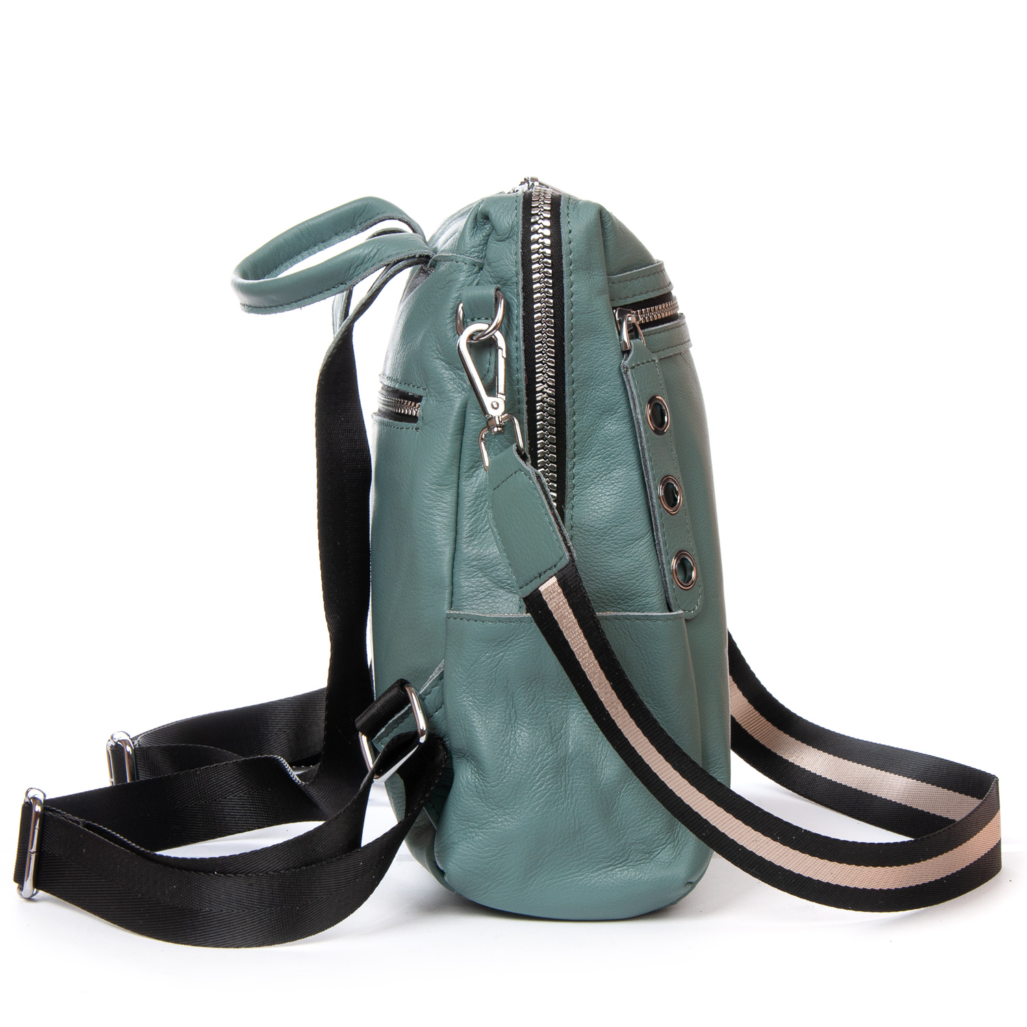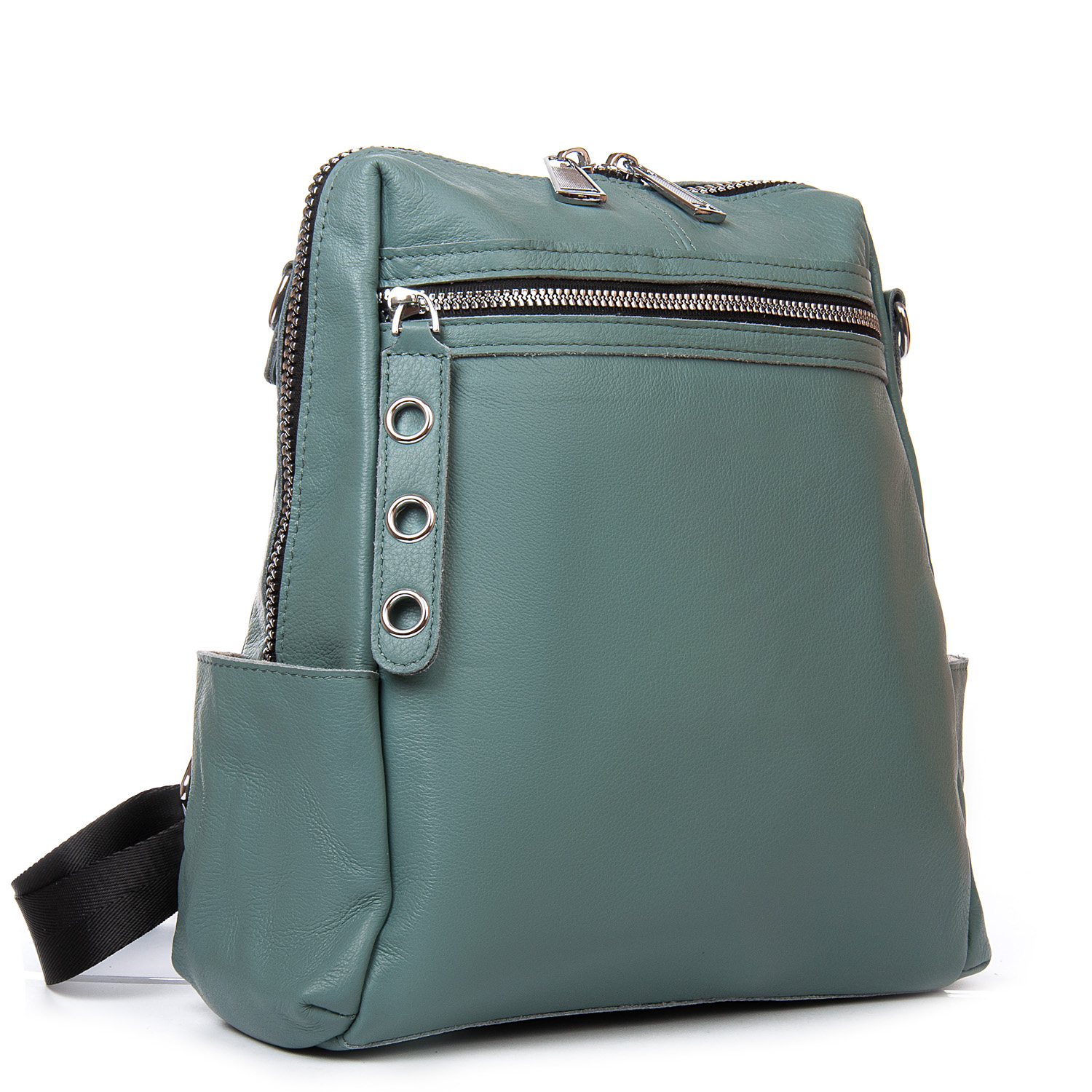 Можно носить на плече на широком ремне. Закрывается на молнию. Внутри находится основное и дополнительное отделение, разделенное карманом-перегородкой на молнии и карман на молнии. Снаружи рюкзака на фасаде и обратной стороне расположены карманы на молнии. На торцах рюкзака есть небольшие открытые карманы. Плечевые лямки регулируются по длине.