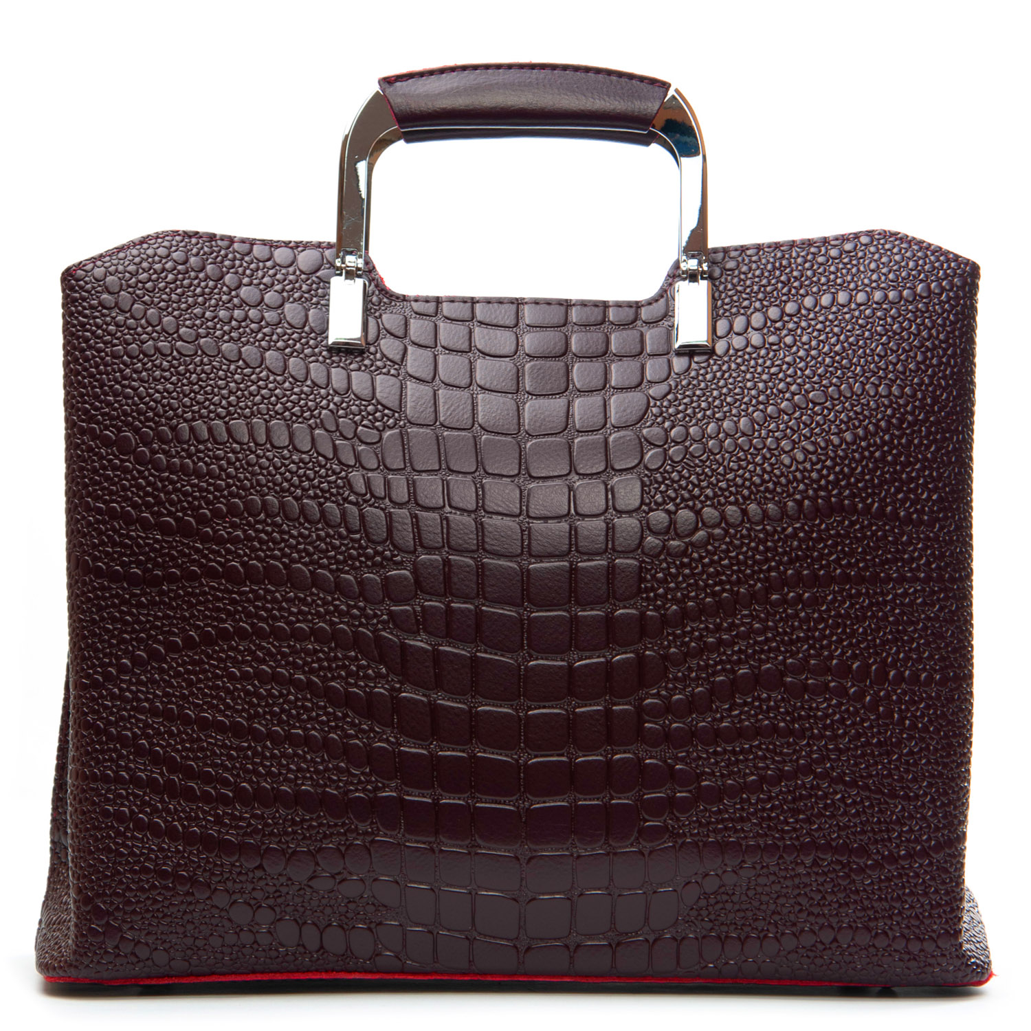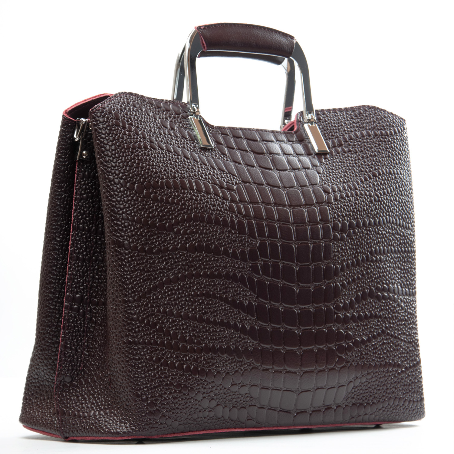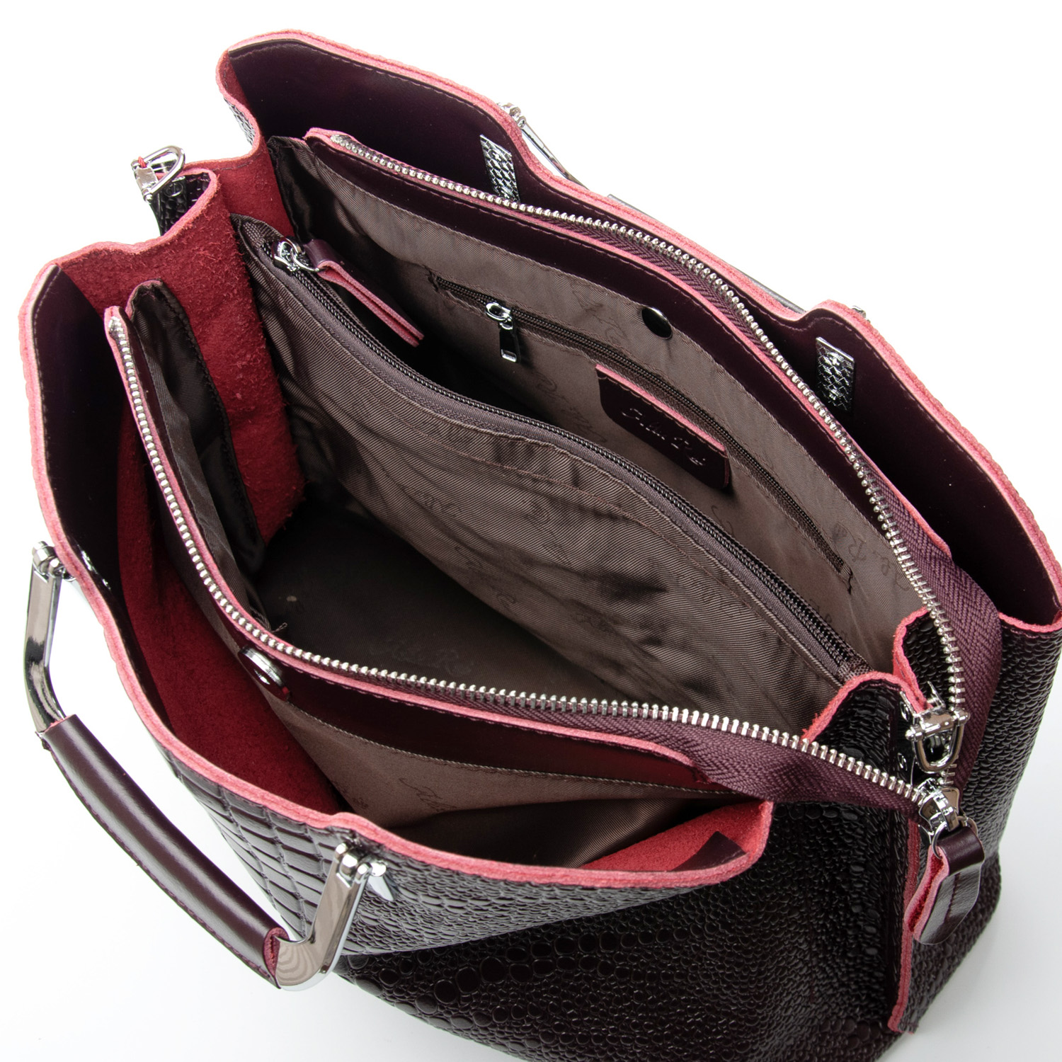 Три отделения: центральное закрывается на молнию, а боковые на магнитные кнопки. Внутри центральное отделение разделено карманом-перегородкой на молнии, также есть двойной открытый карман и карман на молнии. Литые металлические ручки с кожаными вставками. Дно сумки жесткое, с металлическими ножками.
