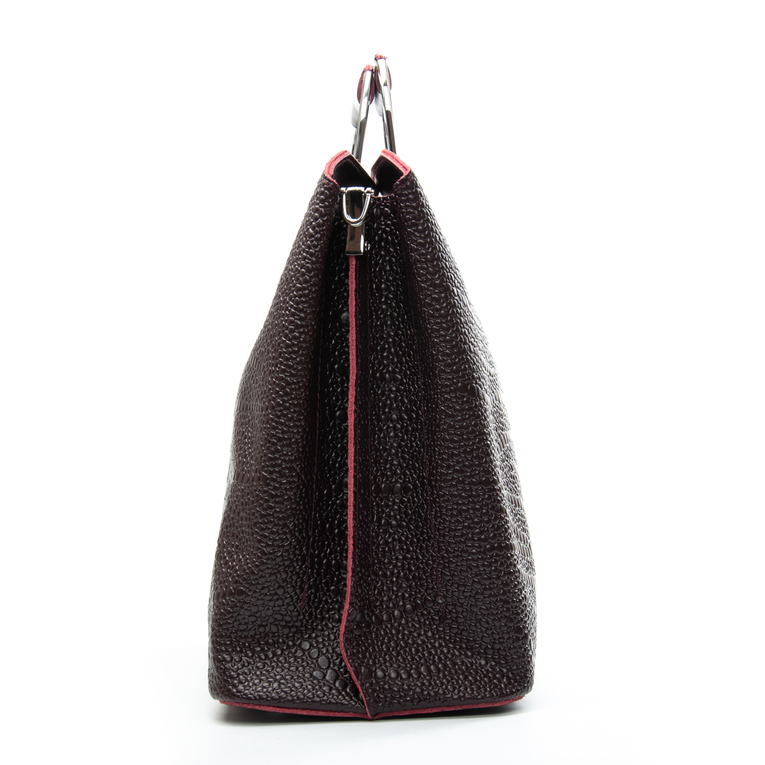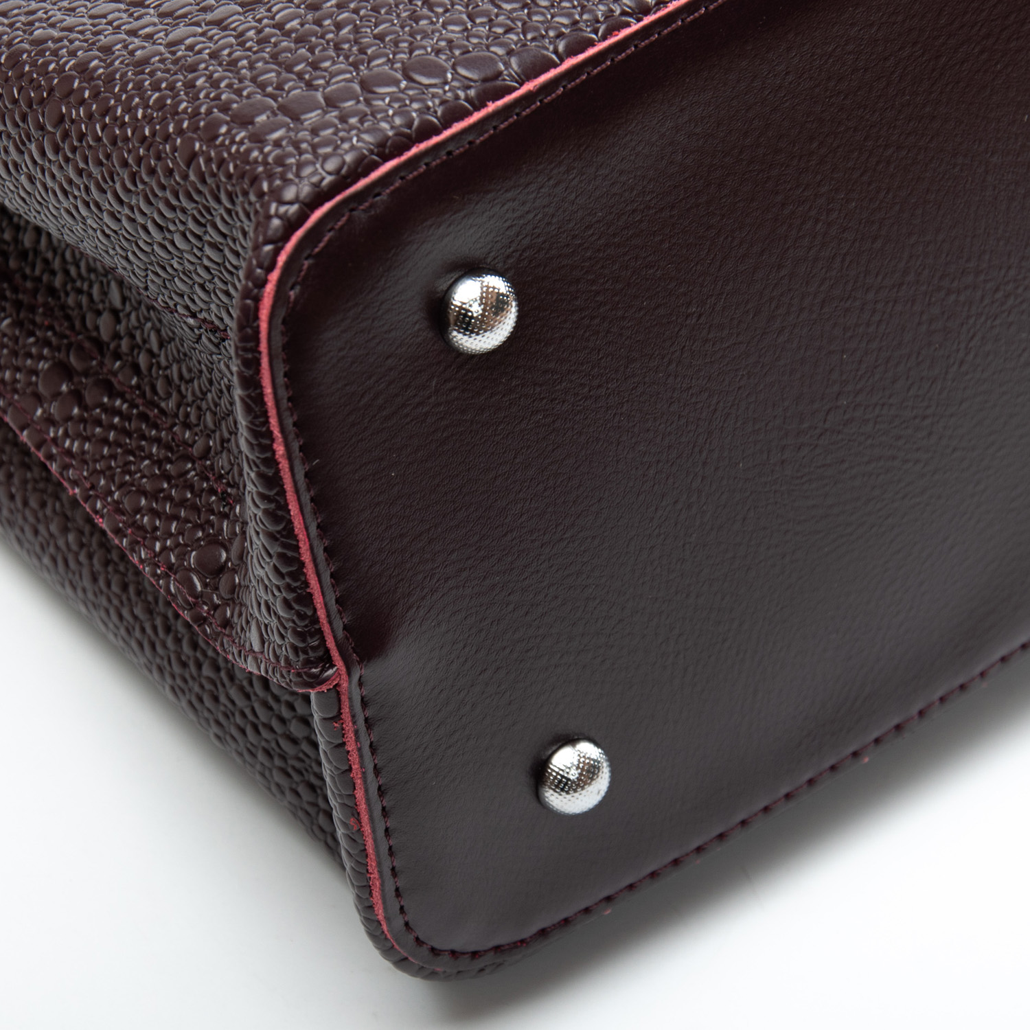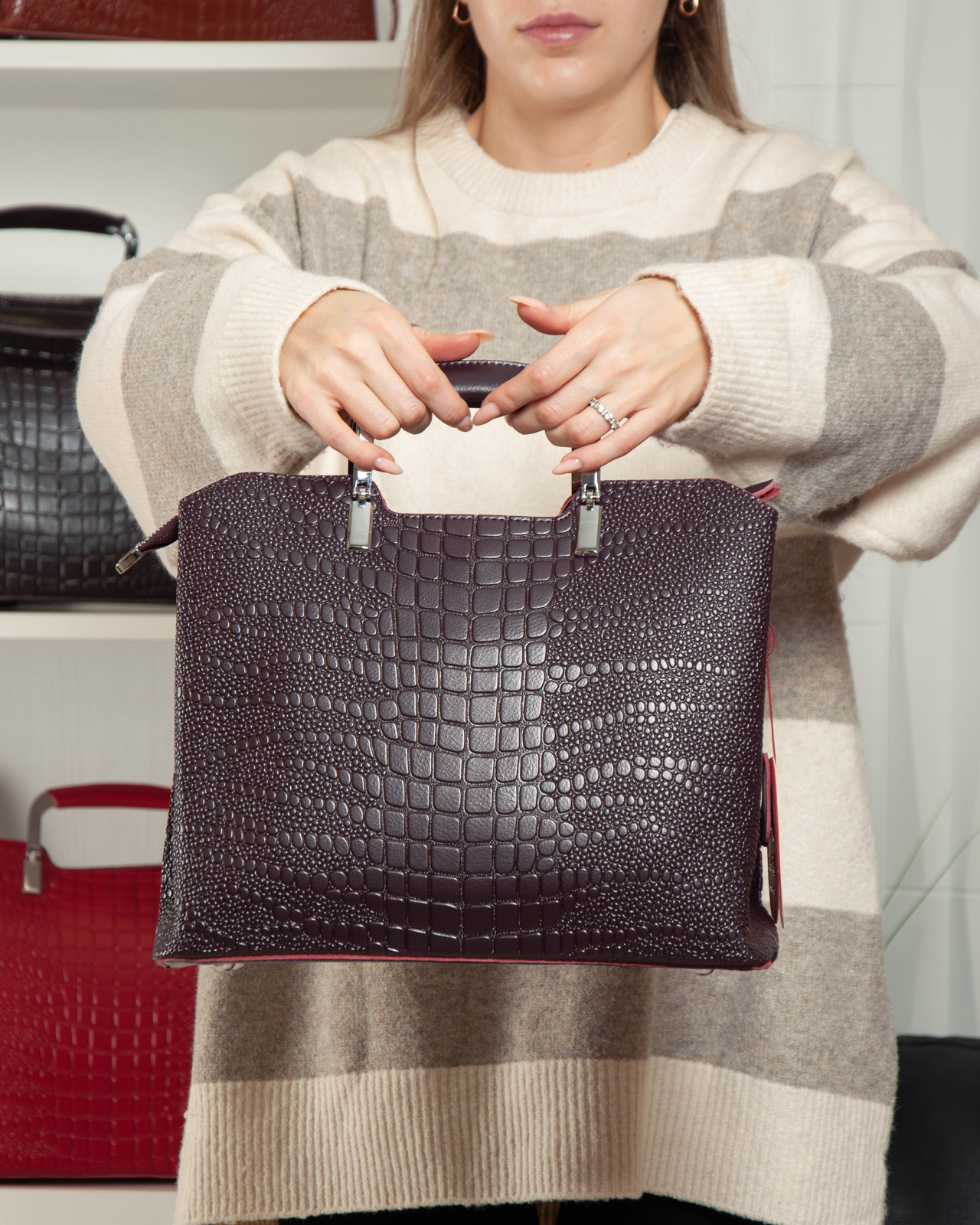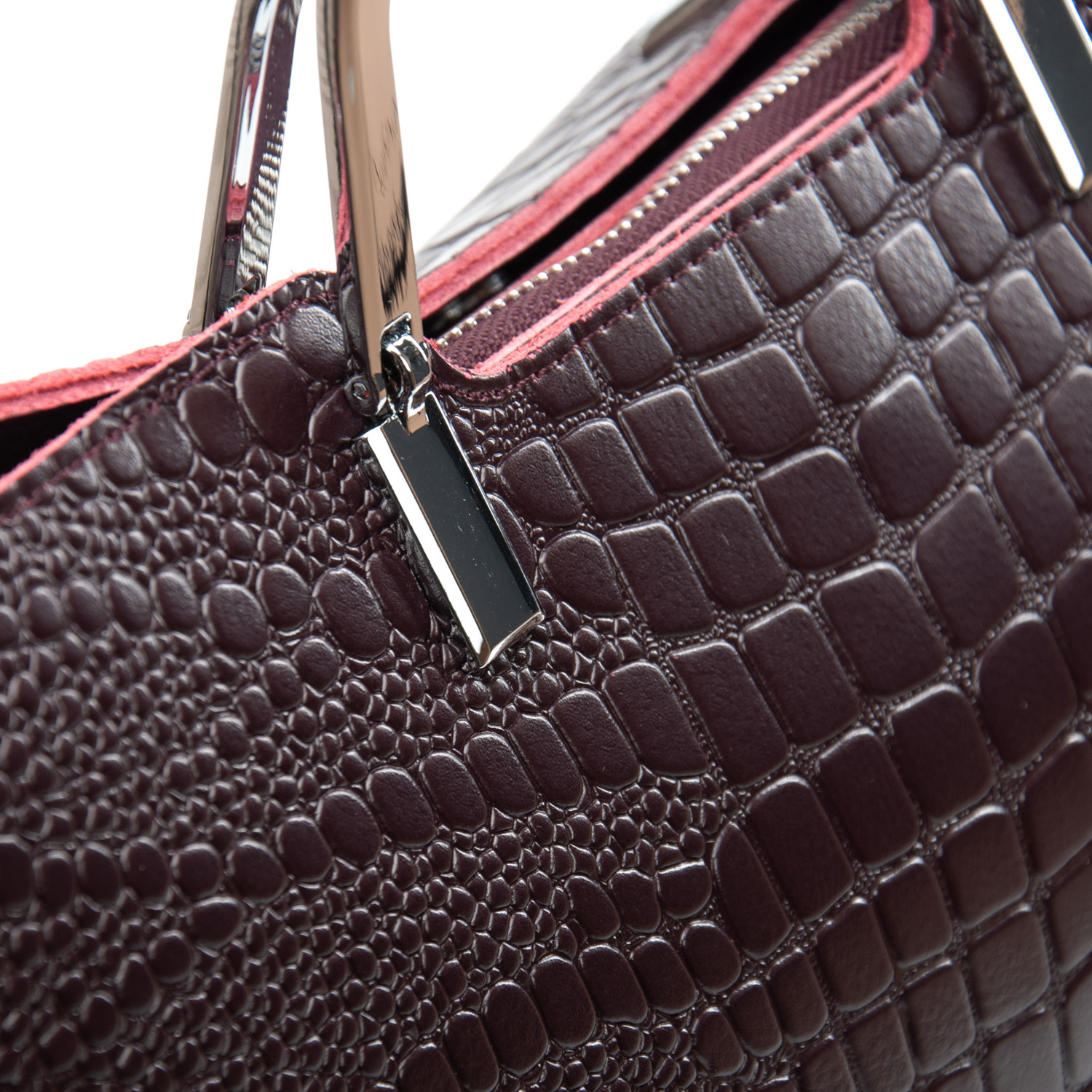 Три отделения: центральное закрывается на молнию, а боковые на магнитные кнопки. Внутри центральное отделение разделено карманом-перегородкой на молнии, также есть двойной открытый карман и карман на молнии. Литые металлические ручки с кожаными вставками. Дно сумки жесткое, с металлическими ножками.