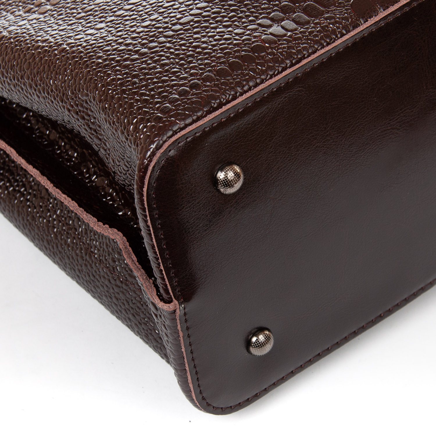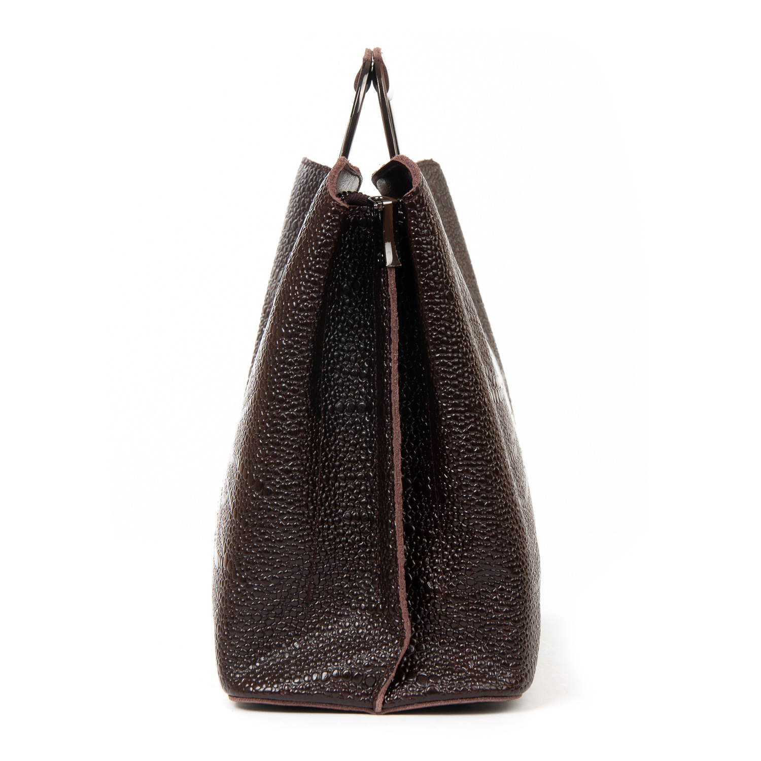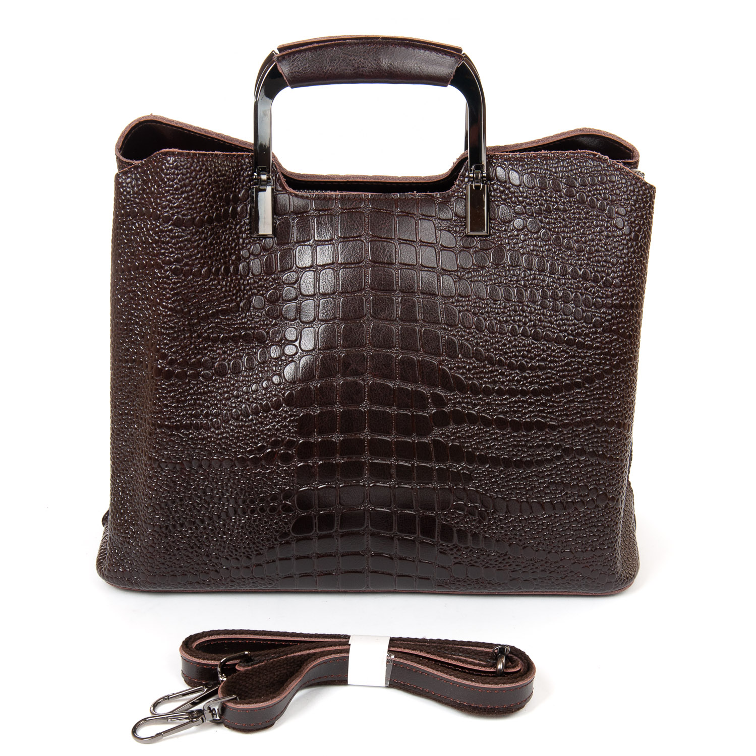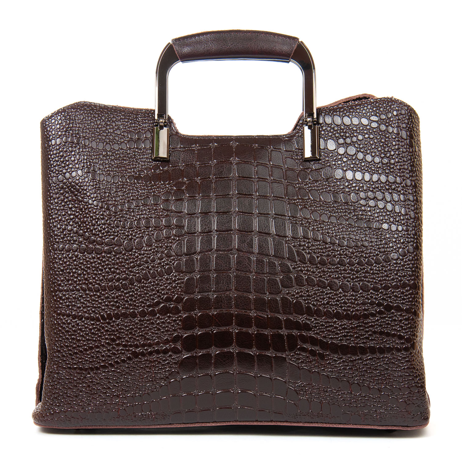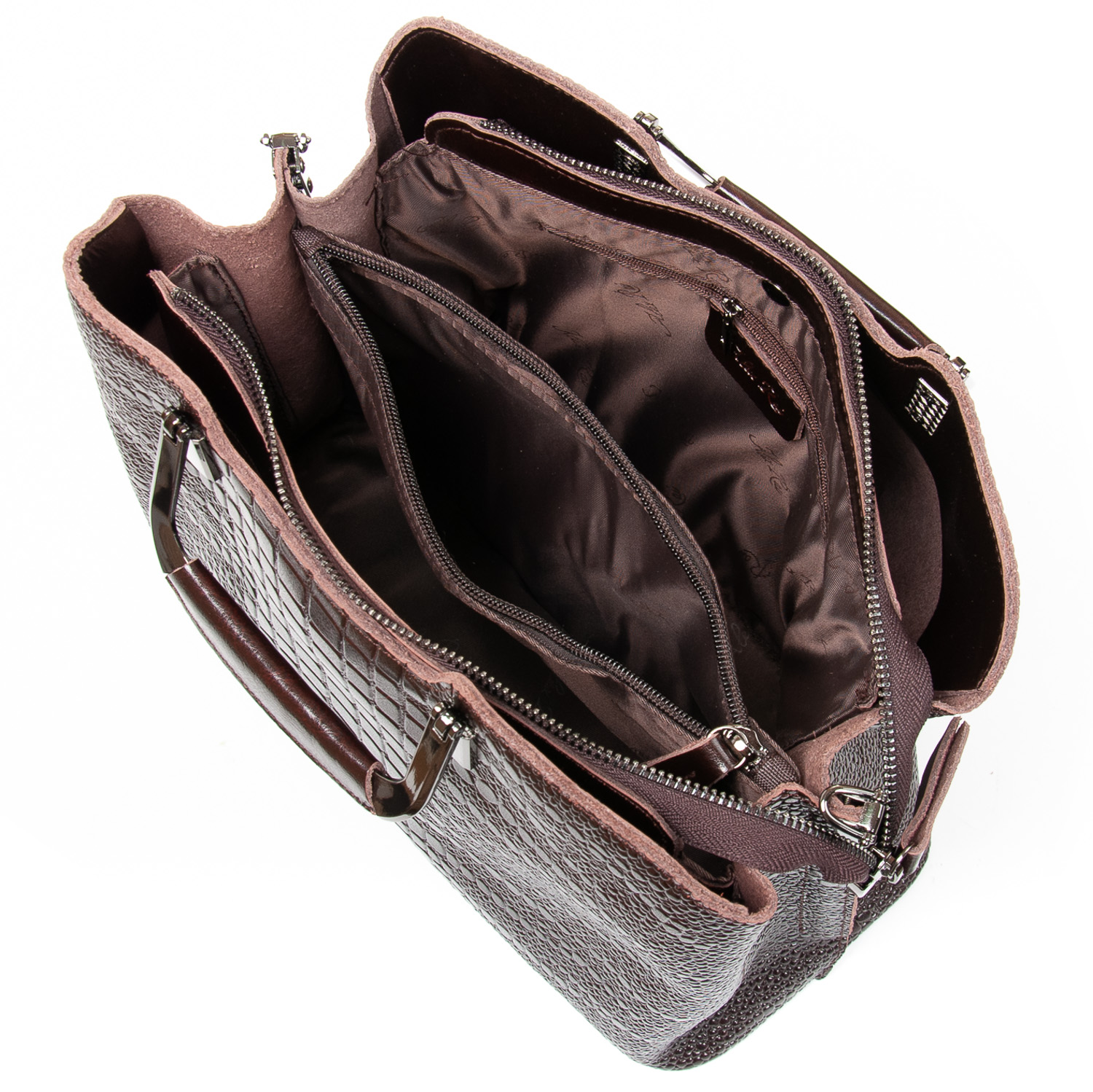 Три отделения: центральное закрывается на молнию, а боковые на магнитные кнопки. Внутри центральное отделение разделено карманом-перегородкой на молнии, также есть двойной открытый карман и карман на молнии. Литые металлические ручки с кожаными вставками. Дно сумки жесткое, с металлическими ножками.