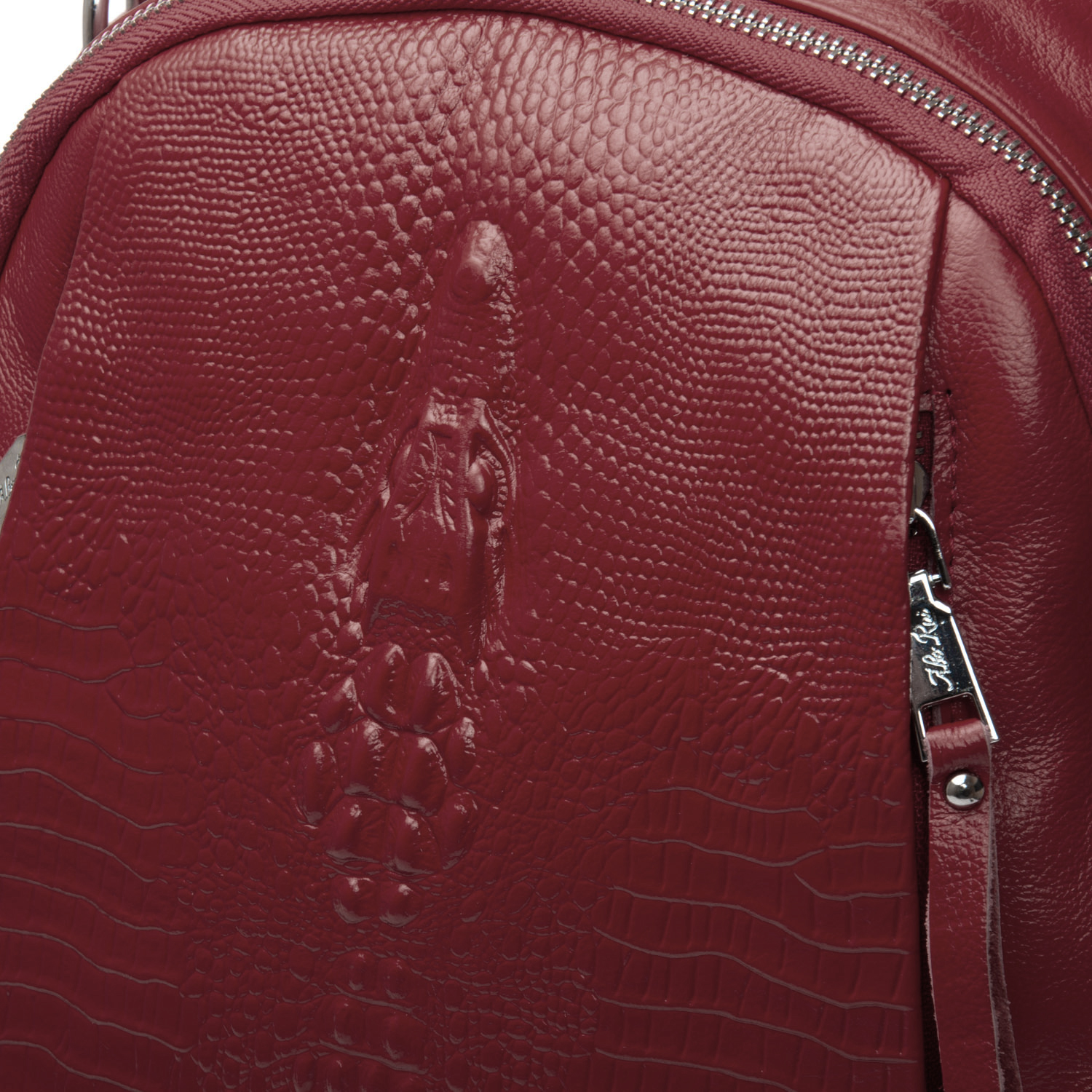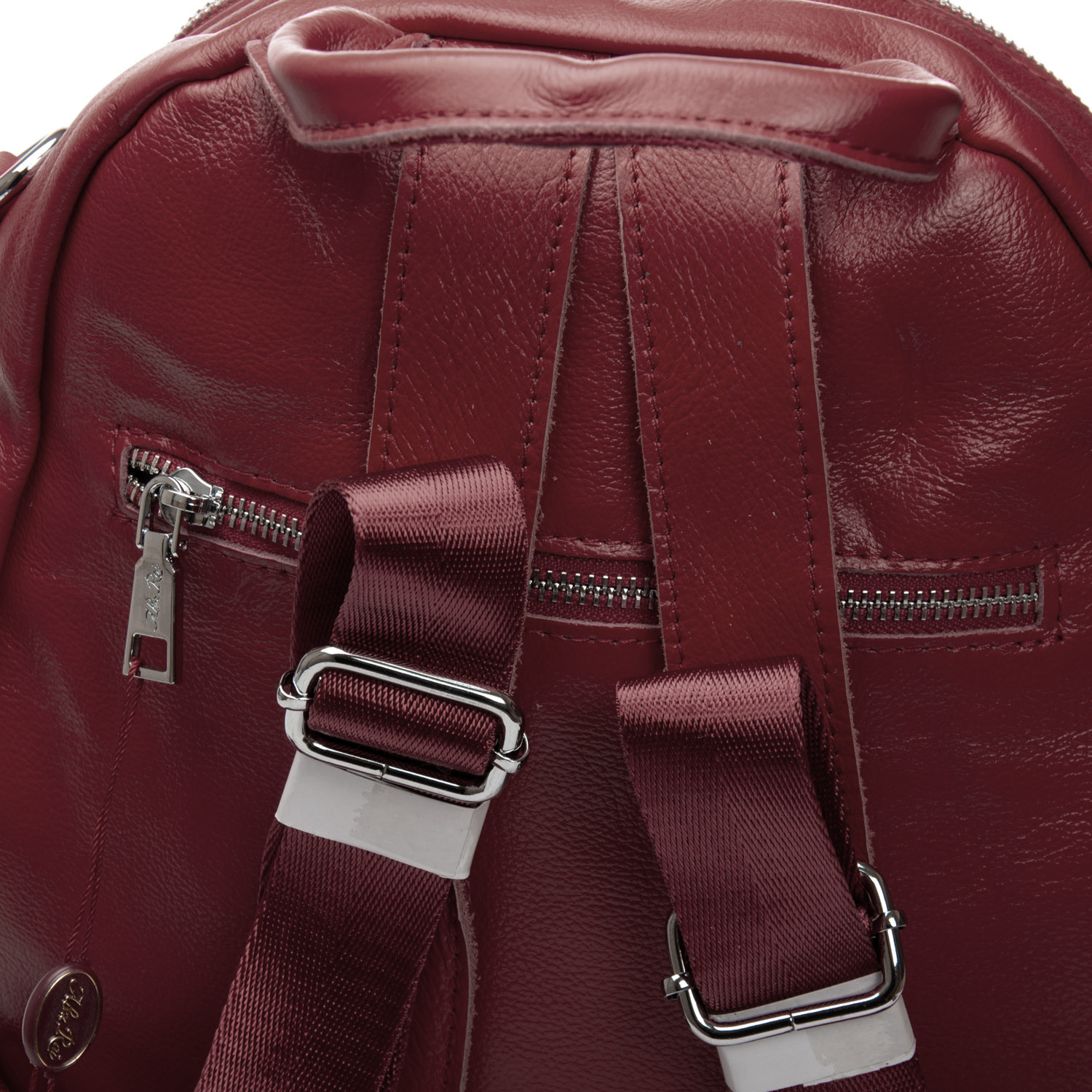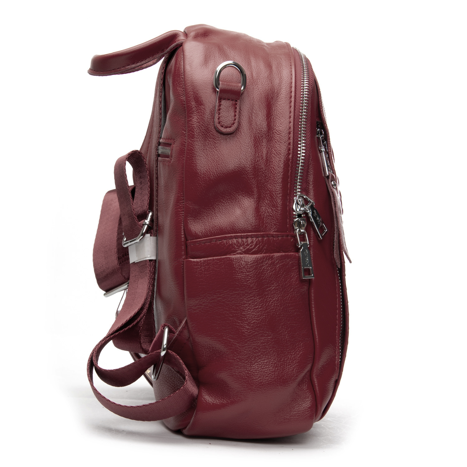 Изготовлена из натуральной мягкой кожи. Можно носить на плече на широком ремне. Закрывается на молнию. Внутри находится основное и дополнительное отделение, разделенное карманом-перегородкой на молнии, открытый карман и карман на молнии. Снаружи рюкзака на фасаде и обратной стороне расположены карманы на молнии. На торцах рюкзака есть небольшие открытые карманы.