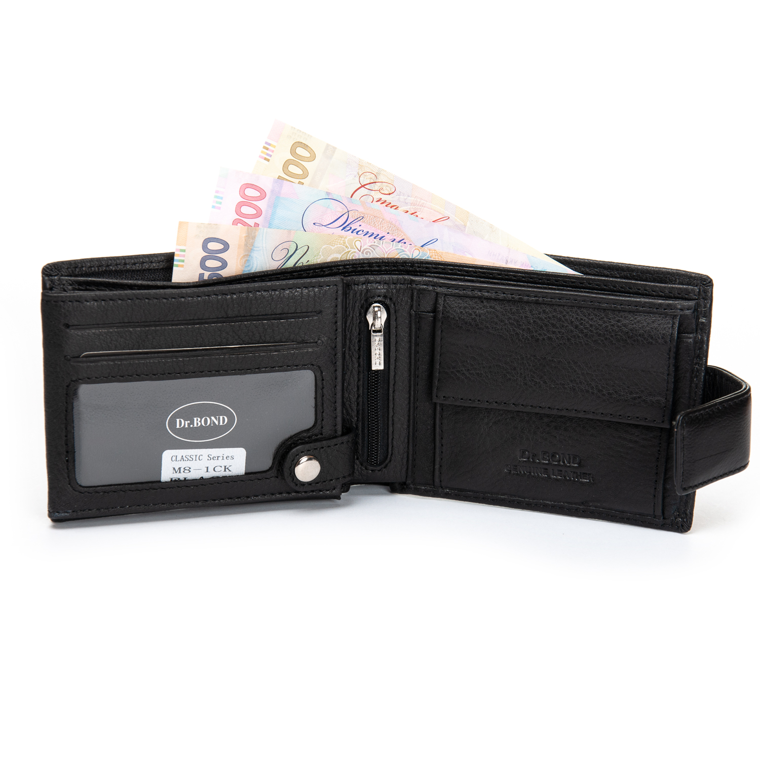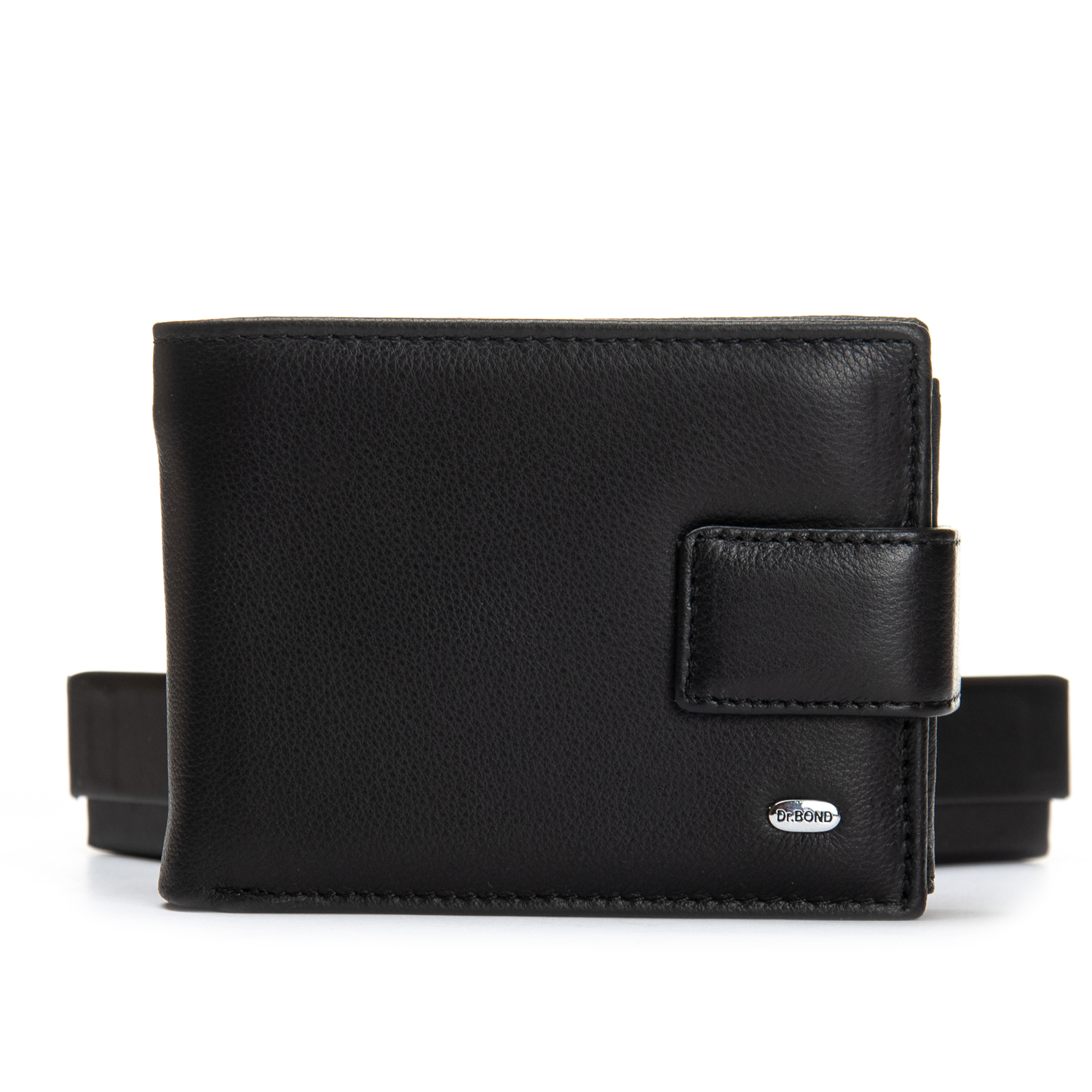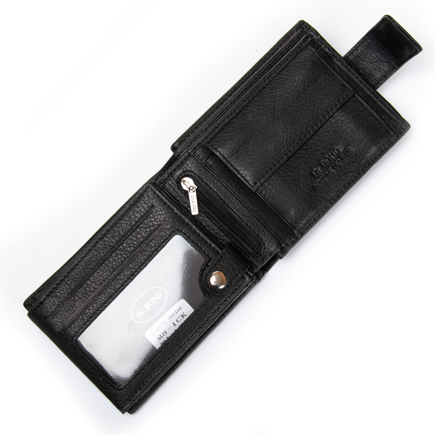 Мужской кожаный кошелек Dr.Bond. Изготовлен из мягкой натуральной кожи. Закрывается клапаном со скрытым магнитом. Кожаные перегордки в отделениях для банкнот. Для банкнот есть два открытых отделения и одно отделение на молнии. На откидном блоке находятся восемь карманов для визитных карт и два больших прозрачных кармана. Также есть карман на молнии и монетница на кнопке.