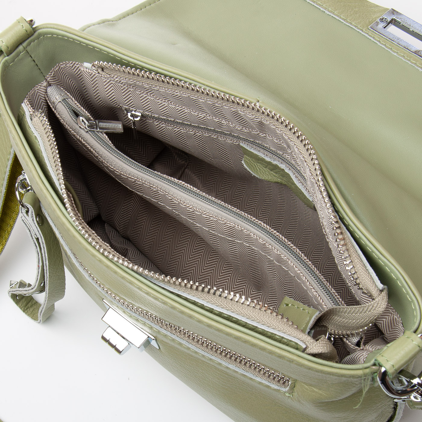 Женская сумка Alex Rai. Изготовлена из натуральной мягкой кожи. Под клапаном дополнительно закрывается на молнию. Внутри сумки находится двойное отделение, разделенное карманом-перегородкой на молнии, боковой открытый карман и карман на молнии. Снаружи сумки на фасаде и обратной стороне расположены карманы на молнии. Дно сумки уплотненное, с металлическими ножками.