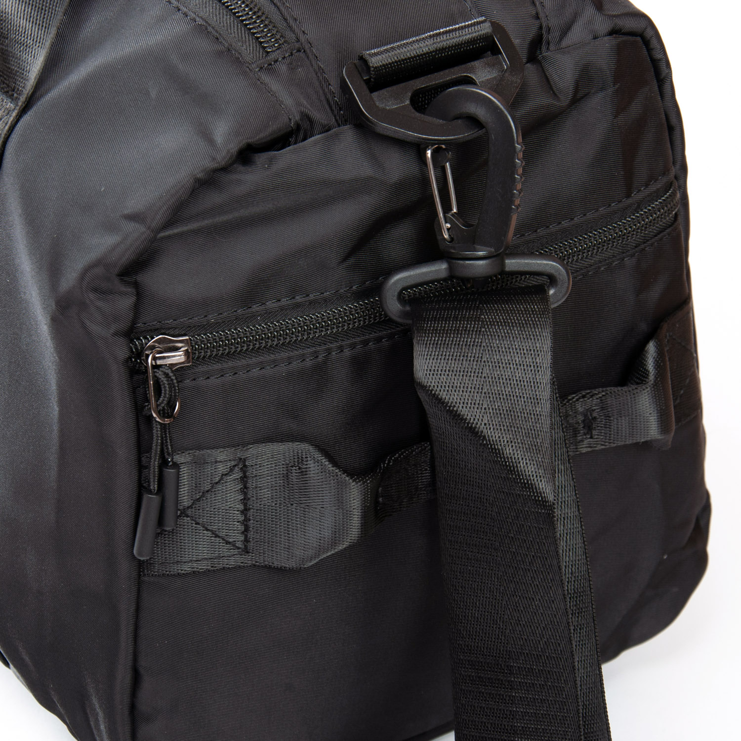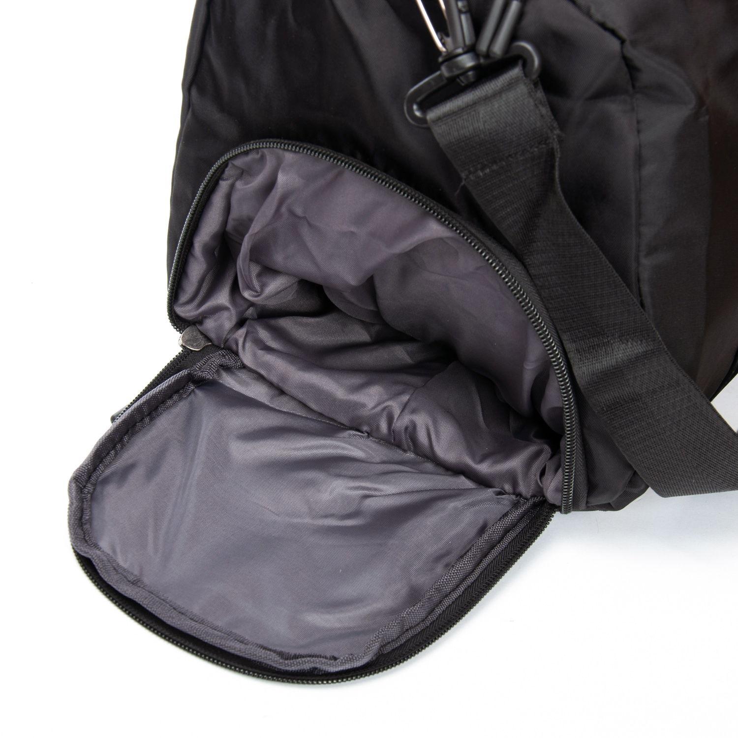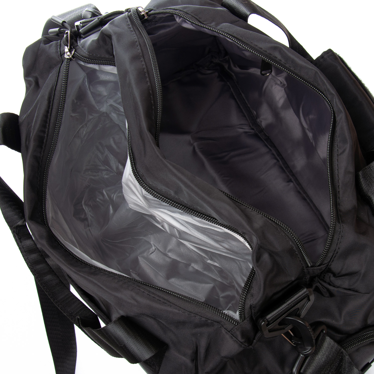 Одно отделение, закрывается на молнию. Внутри отделения есть большой боковой карман на молнии. Снаружи также расположен большой карман-отделение на молнии с герметичной подкладкой. На фасаде находится один открытый карман. На обратной стороне есть крепление на ручку чемодана. На торцах сумки есть два кармана на молнии, один из которых предназначен для обуви.