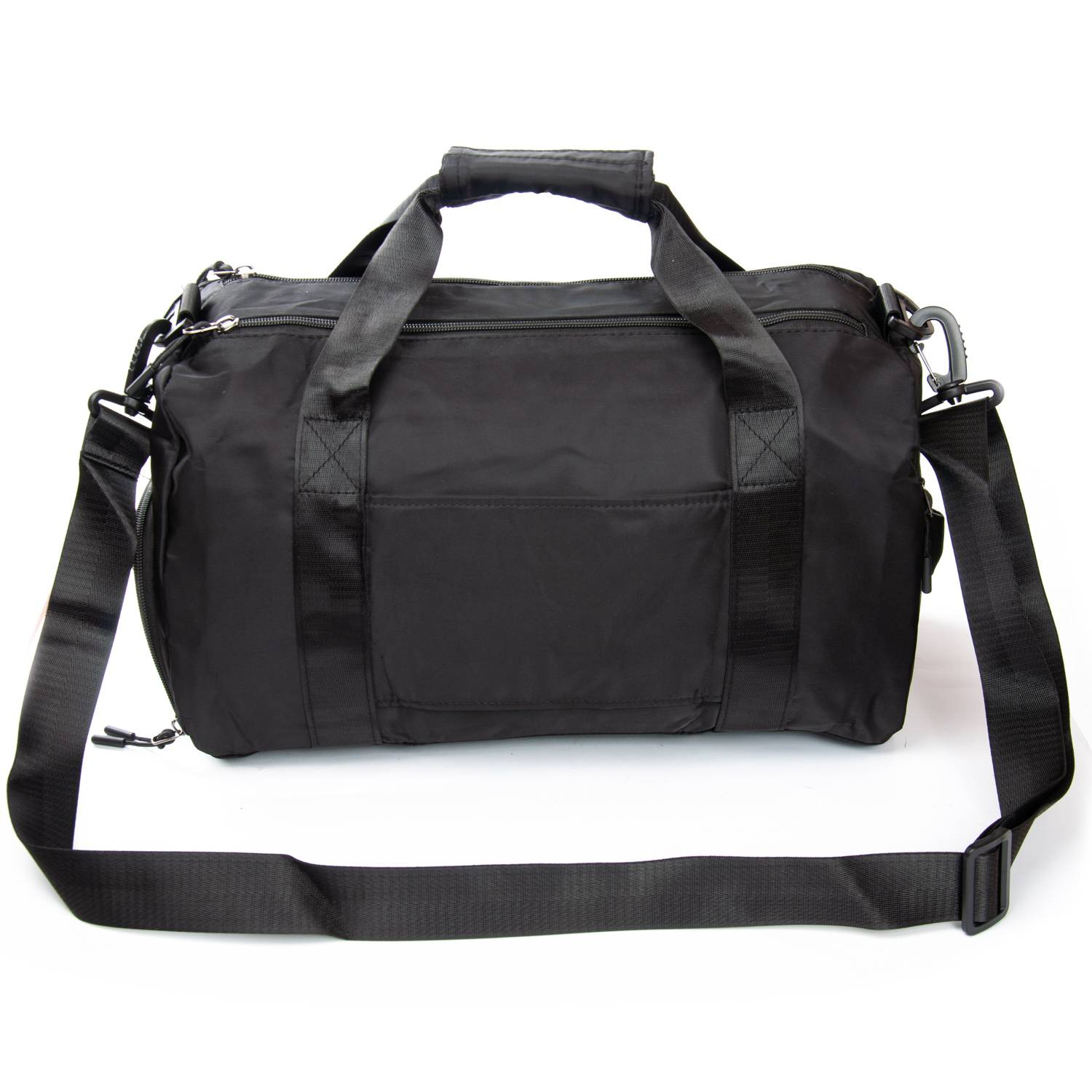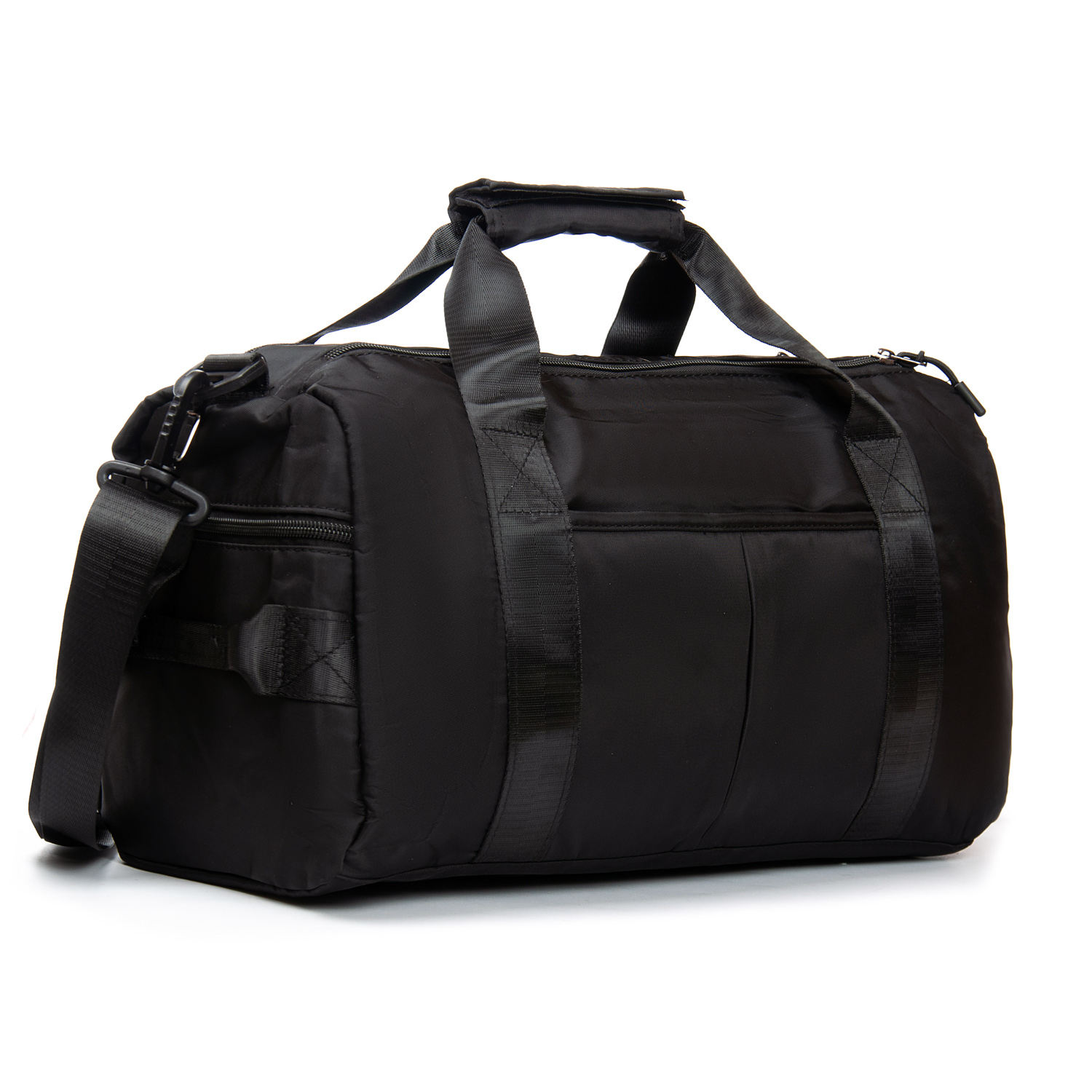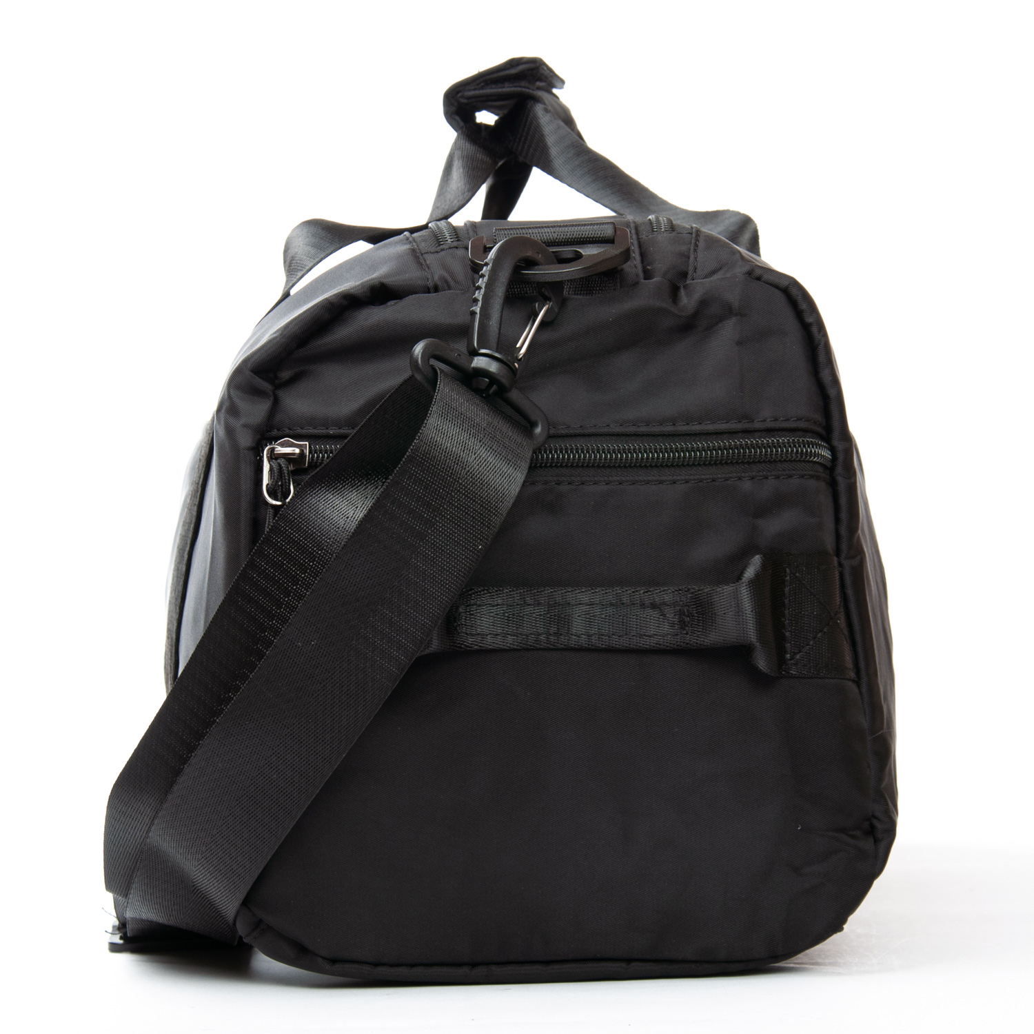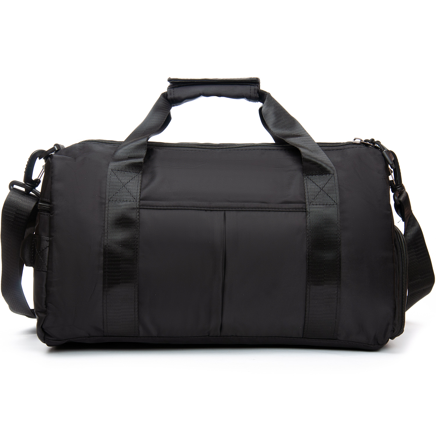 Одно отделение, закрывается на молнию. Внутри отделения есть большой боковой карман на молнии. Снаружи также расположен большой карман-отделение на молнии с герметичной подкладкой. На фасаде находится один открытый карман. На обратной стороне есть крепление на ручку чемодана. На торцах сумки есть два кармана на молнии, один из которых предназначен для обуви.