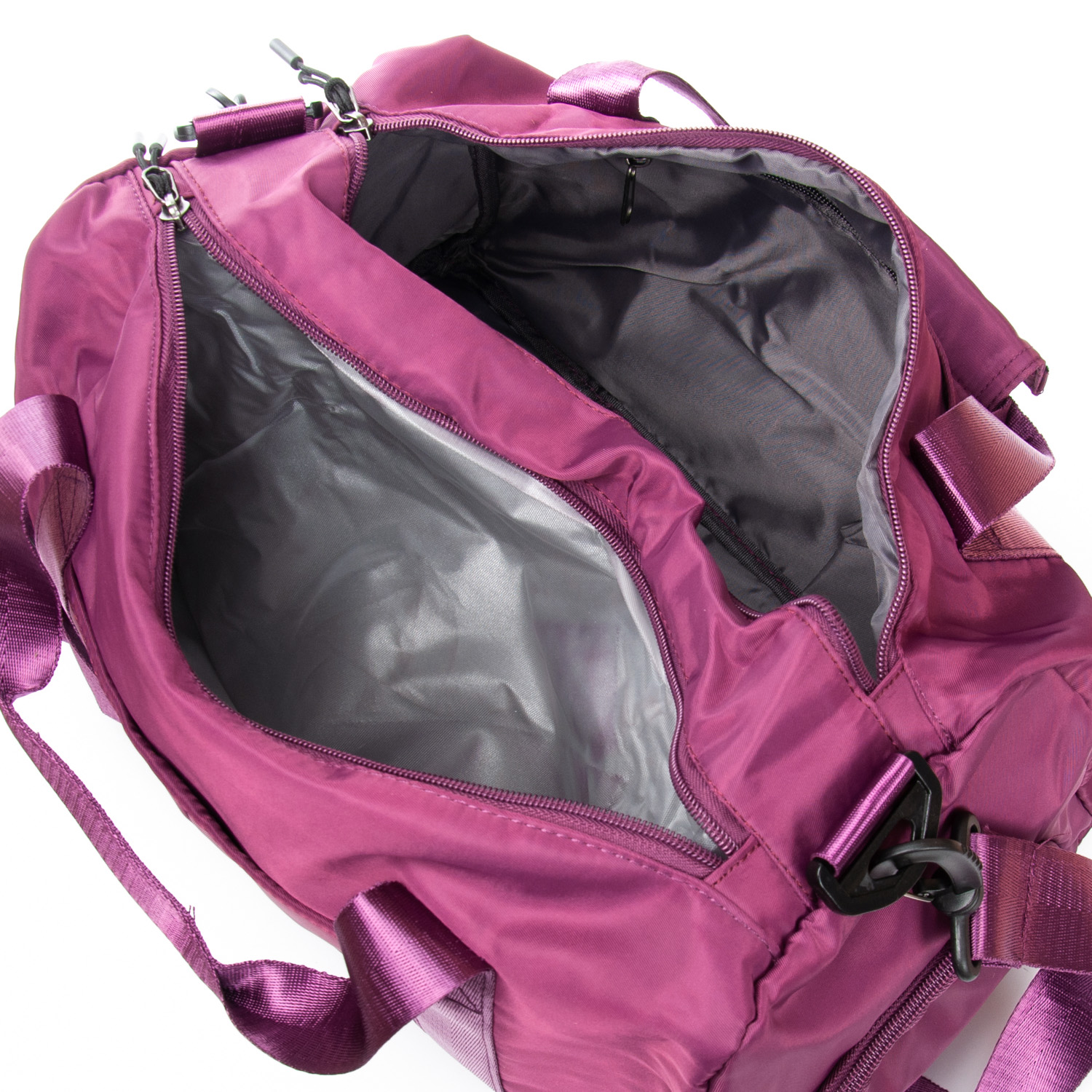 Одно отделение, закрывается на молнию. Внутри отделения есть большой боковой карман на молнии. Снаружи также расположен большой карман-отделение на молнии с герметичной подкладкой. На фасаде находится один открытый карман. На обратной стороне есть крепление на ручку чемодана. На торцах сумки есть два кармана на молнии, один из которых предназначен для обуви.