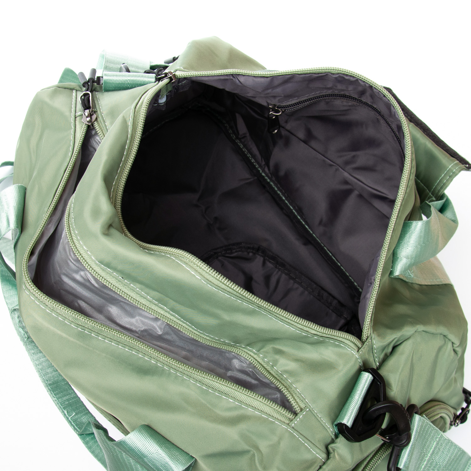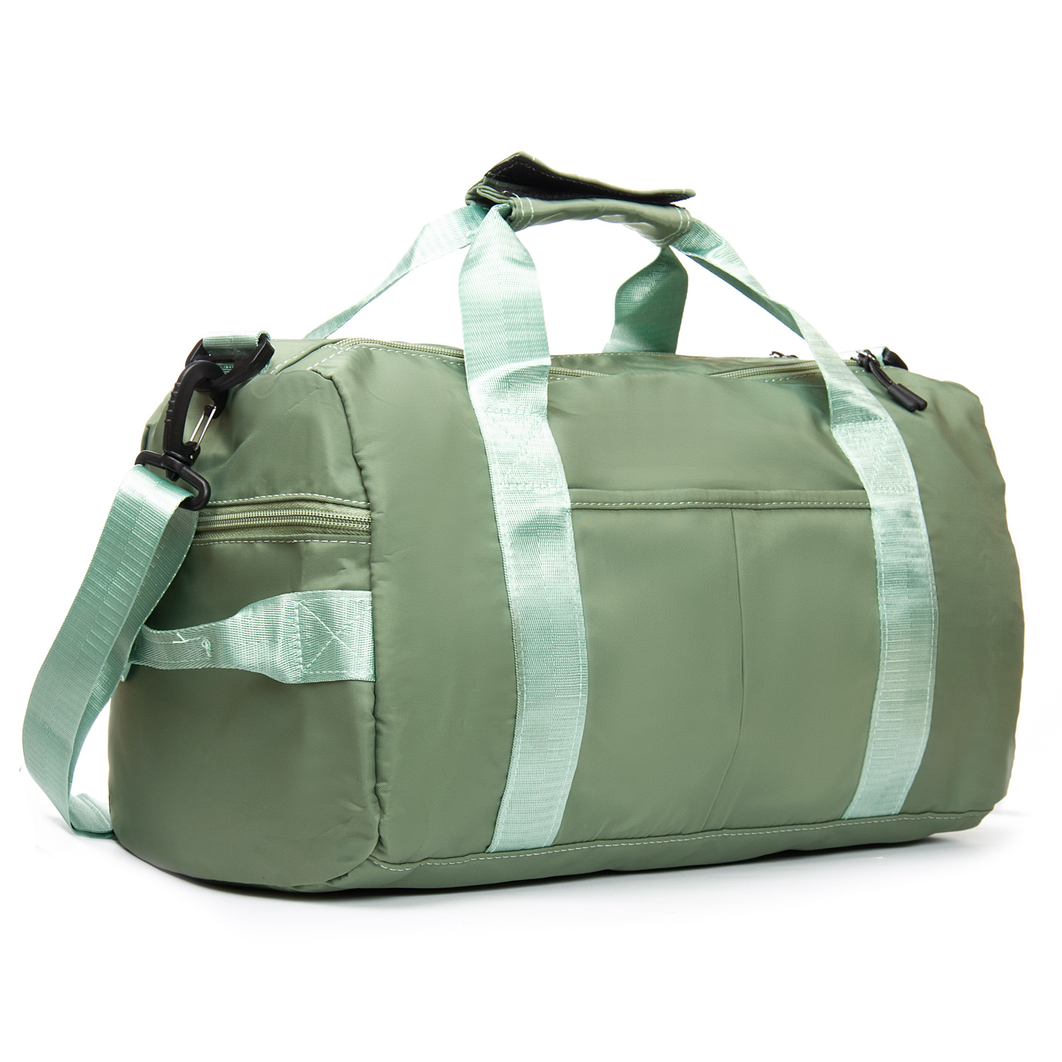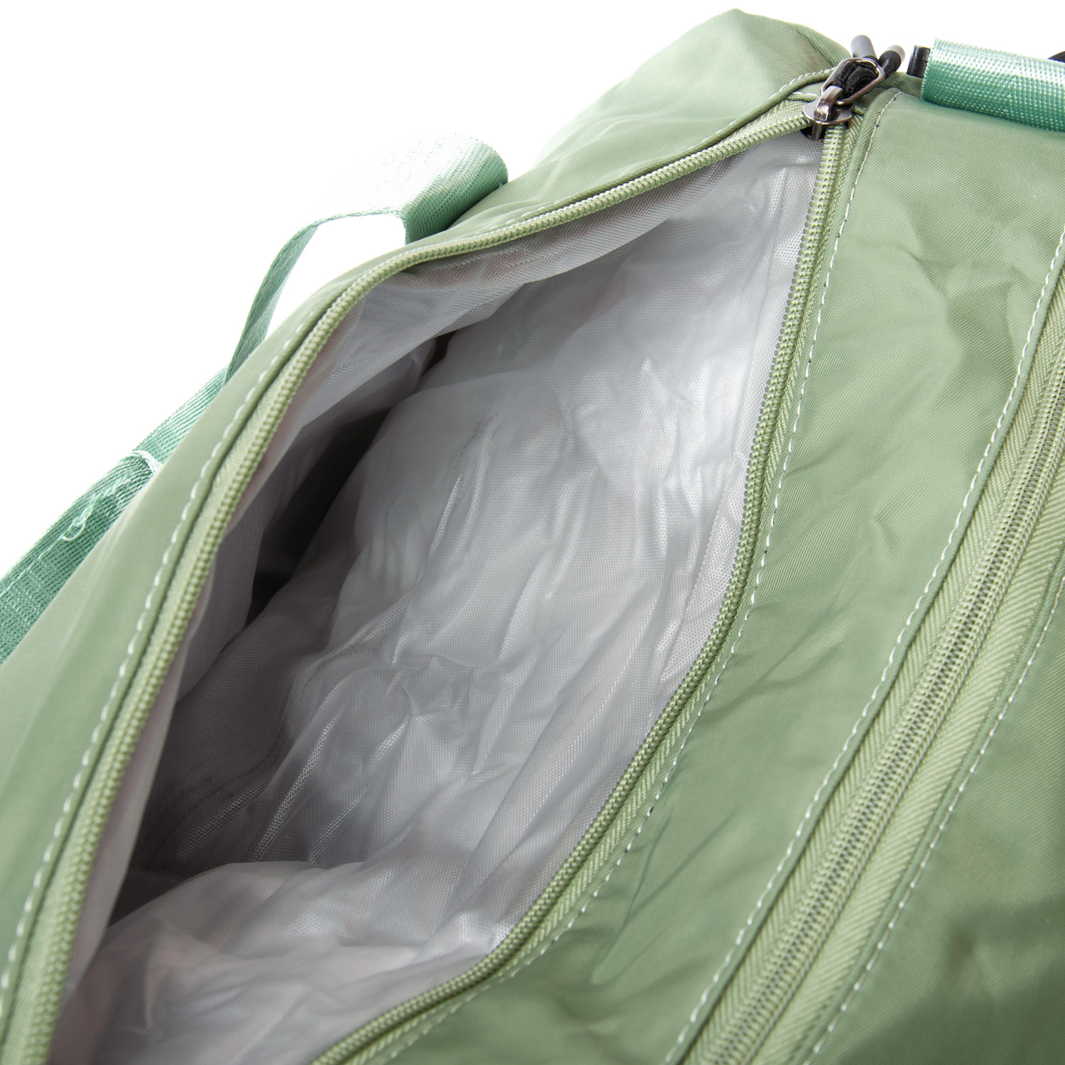 Одно отделение, закрывается на молнию. Внутри отделения есть большой боковой карман на молнии. Снаружи также расположен большой карман-отделение на молнии с герметичной подкладкой. На фасаде находится один открытый карман. На обратной стороне есть крепление на ручку чемодана. На торцах сумки есть два кармана на молнии, один из которых предназначен для обуви.
