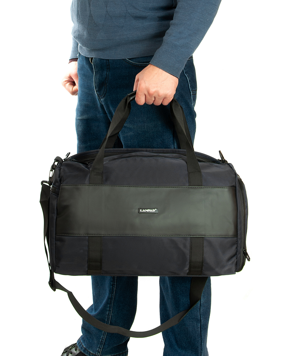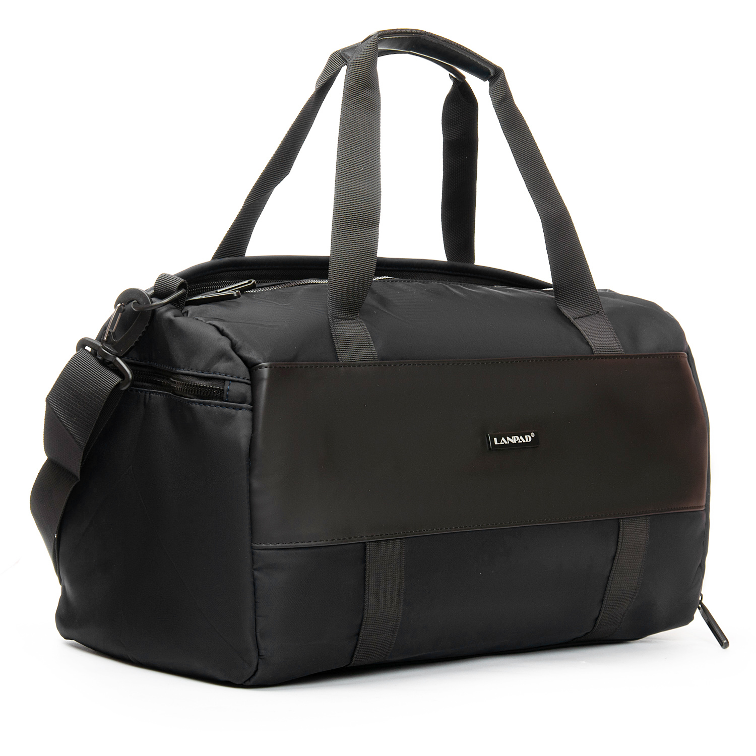 Мужская дорожная/спортивная сумка Lanpad. Одно отделение, закрывается на молнию. Внутри отделения есть карман на молнии и двойной открытый карман. На обратной стороне расположен большой карман на молнии с герметичной подкладкой. На торцах сумки находятся карман для обуви и карман на молнии для вещей.