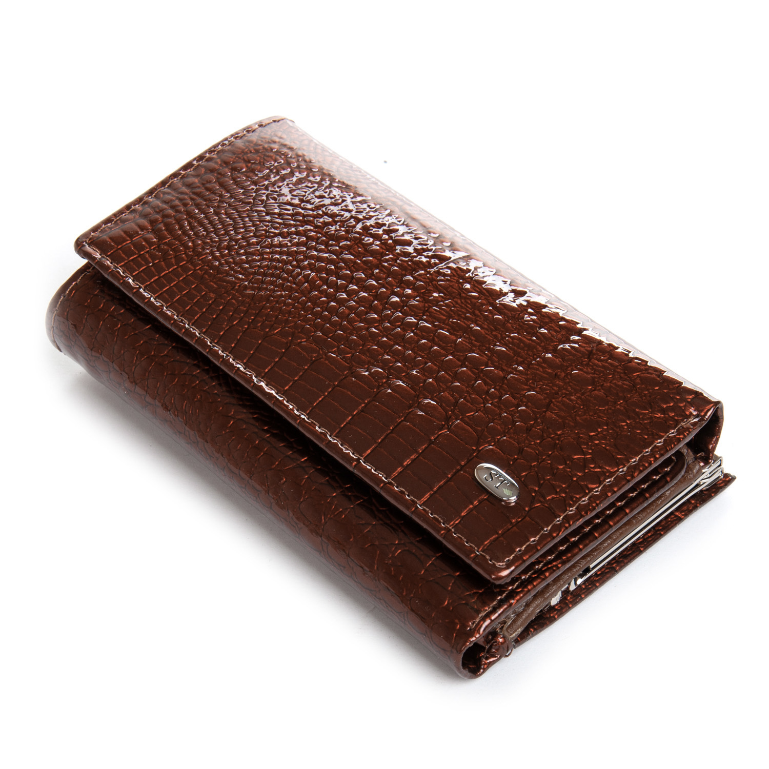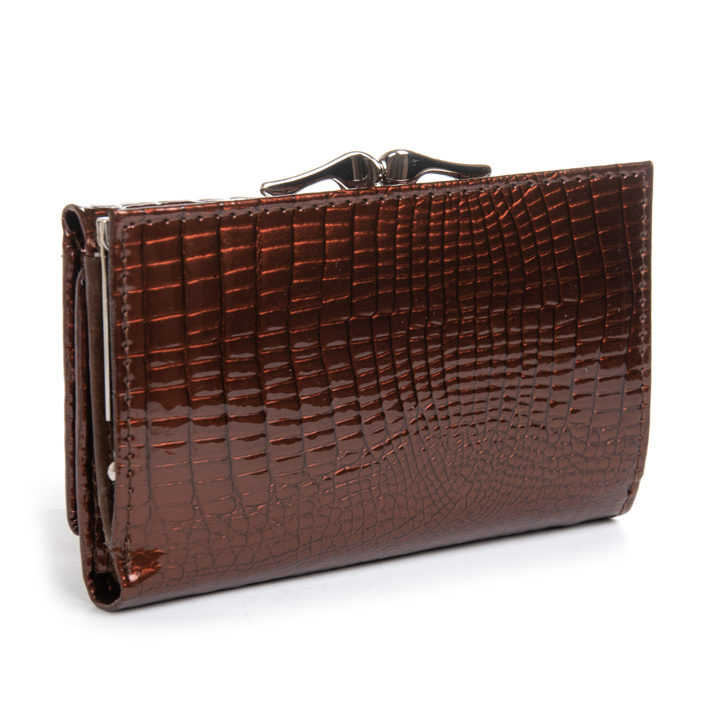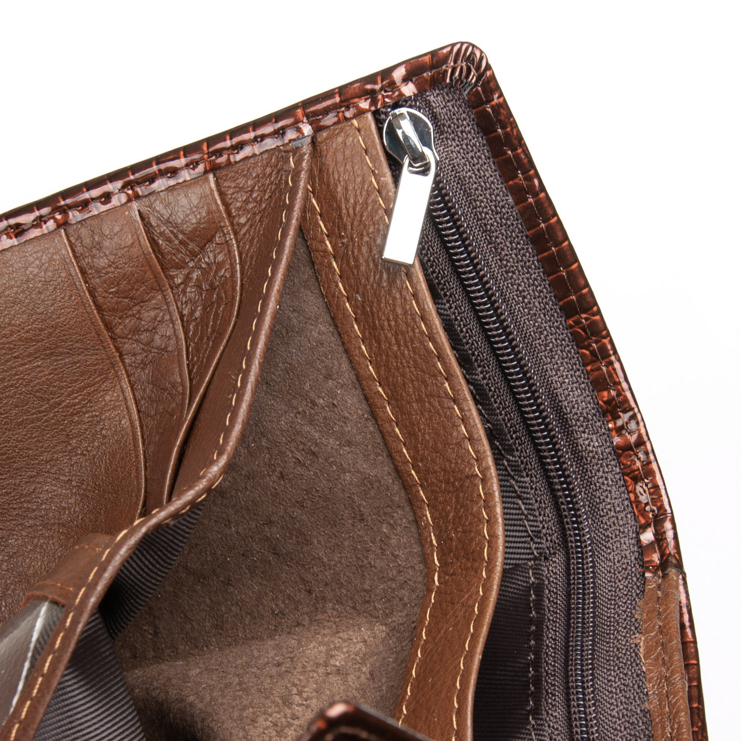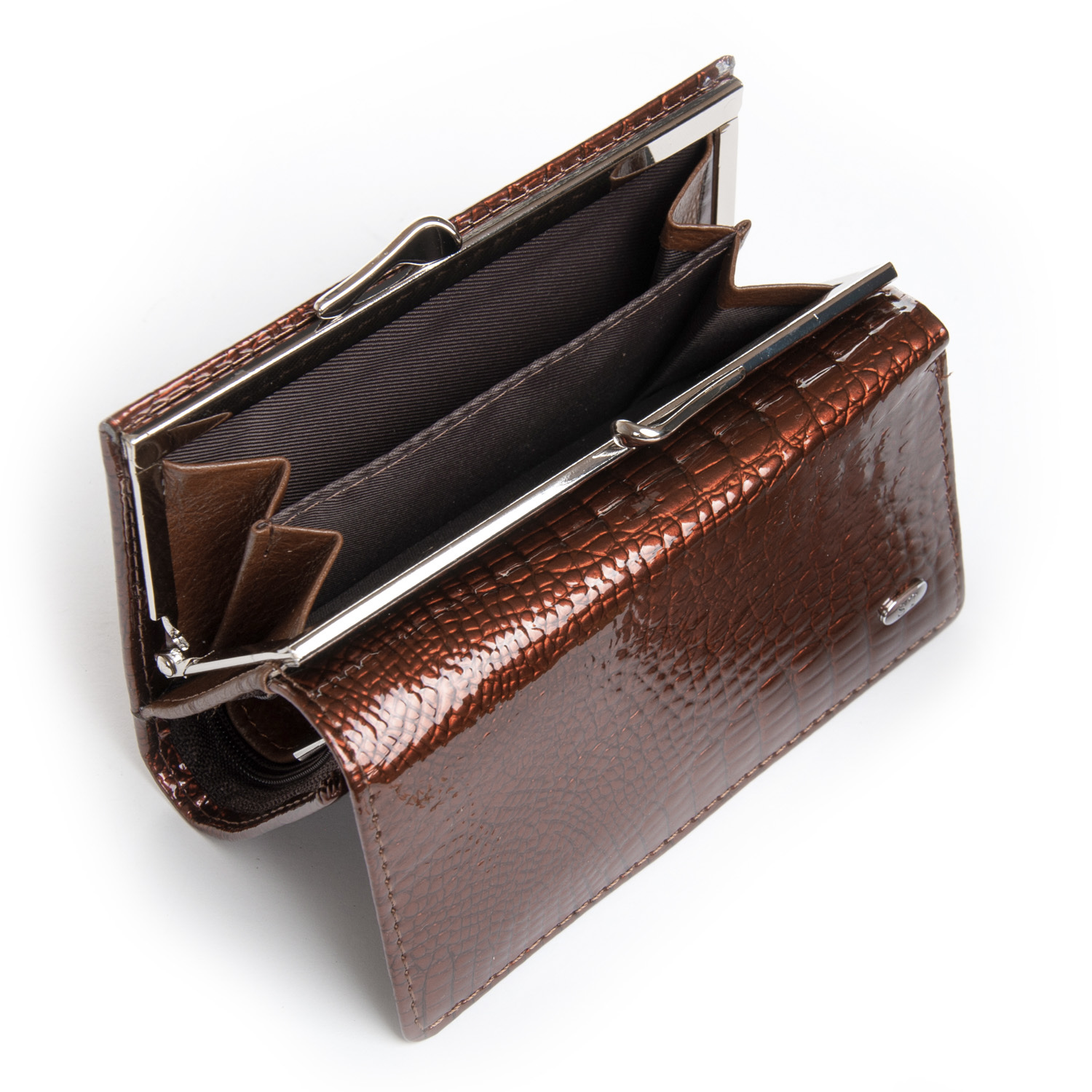 Наружная часть - рельефная лаковая кожа серии Croco, внутренняя часть - натуральная мягкая кожа. Внутри находятся 2 открытых отделения для банкнот и одно отделение на молнии, 7 карманов для визитных карт (один из них прозрачный). Снаружи кошелька на торце есть карман-монетница на защелке.