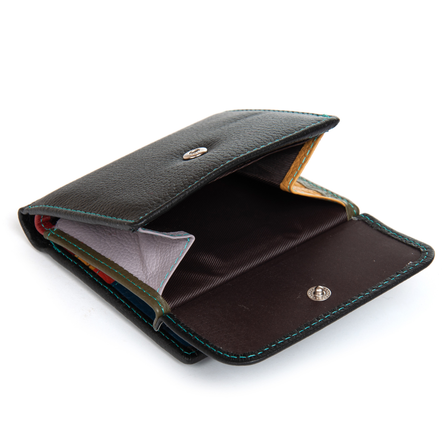 Внутри находятся 2 открытых отделения для банкнот, разделенные кожаной перегородкой и одно отделение на молнии, 5 карманов для визитных карт. Снаружи кошелька на фасаде расположен карман-монетница под клапаном на кнопке.