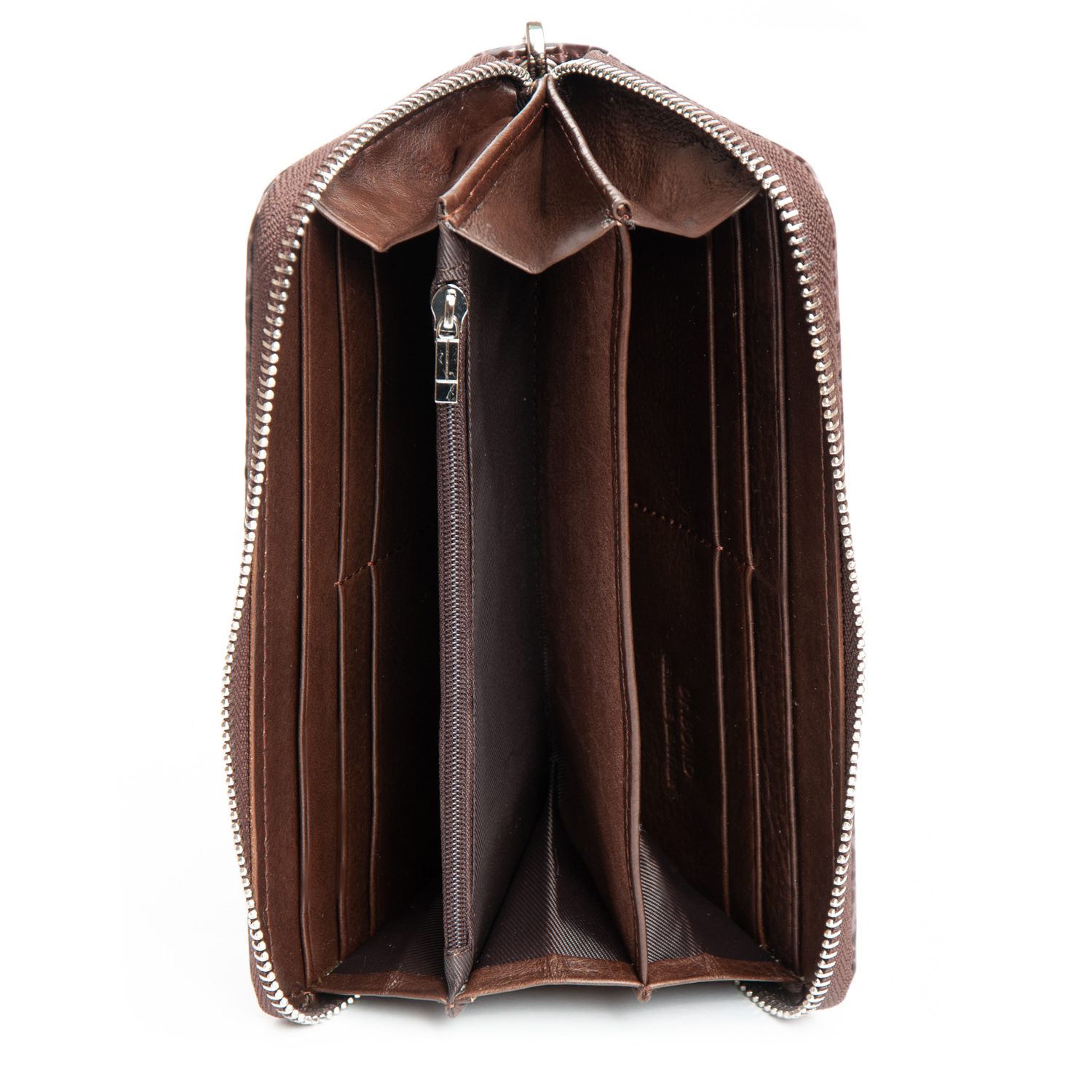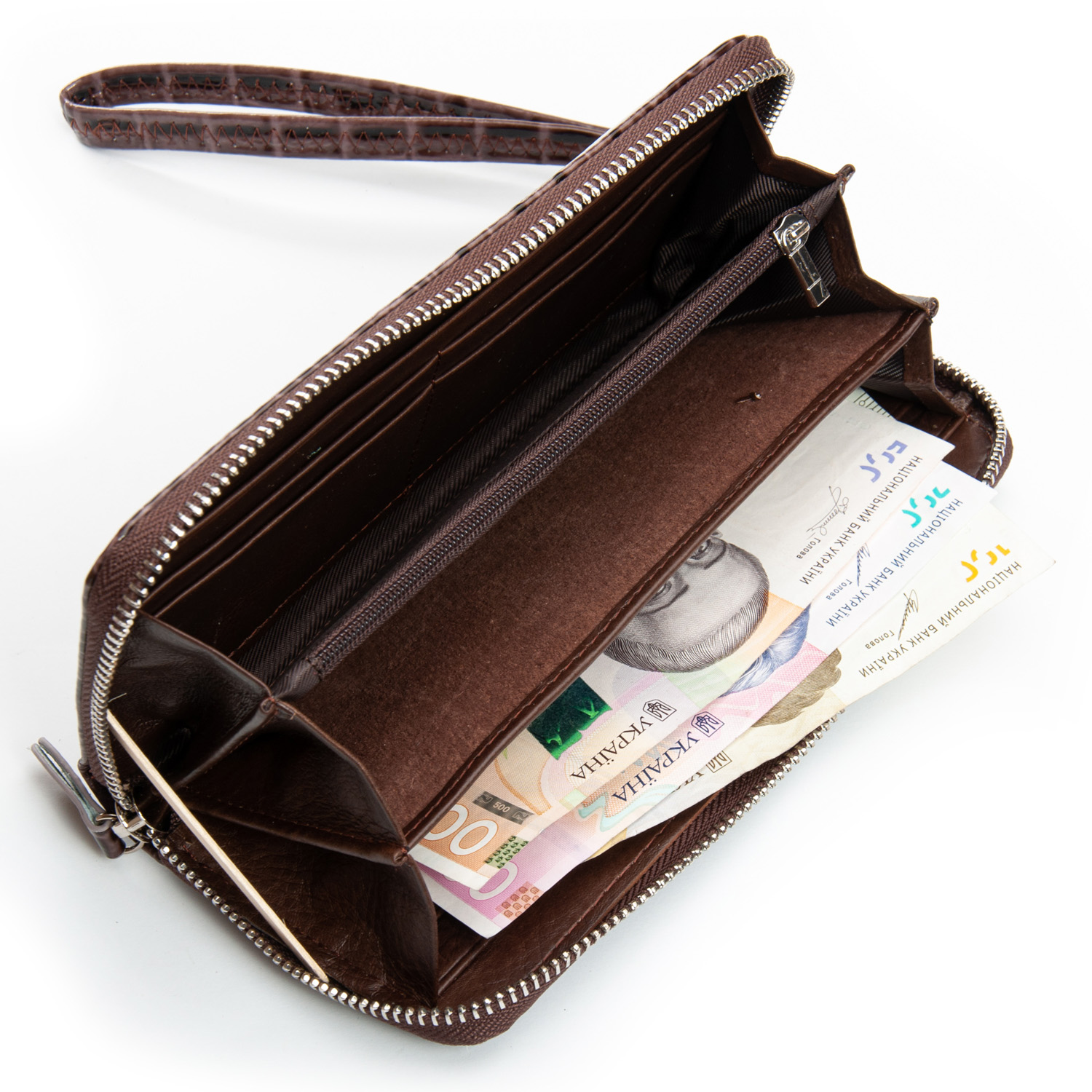 Внутри есть 3 отделения для банкнот, карман для мелочи на молнии, два больших открытых кармана и 8 карманов для визитных карт. В комплекте кистевой ремешок.
