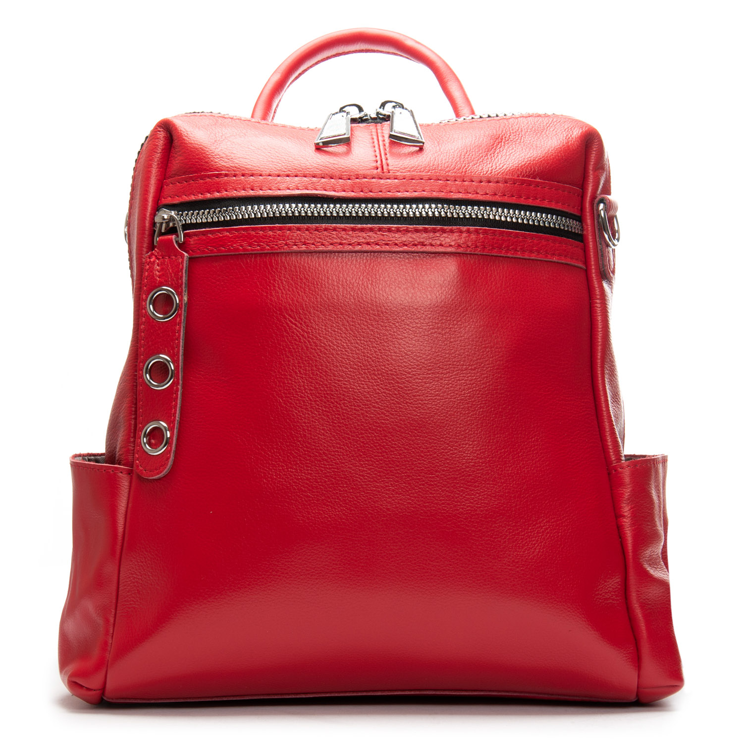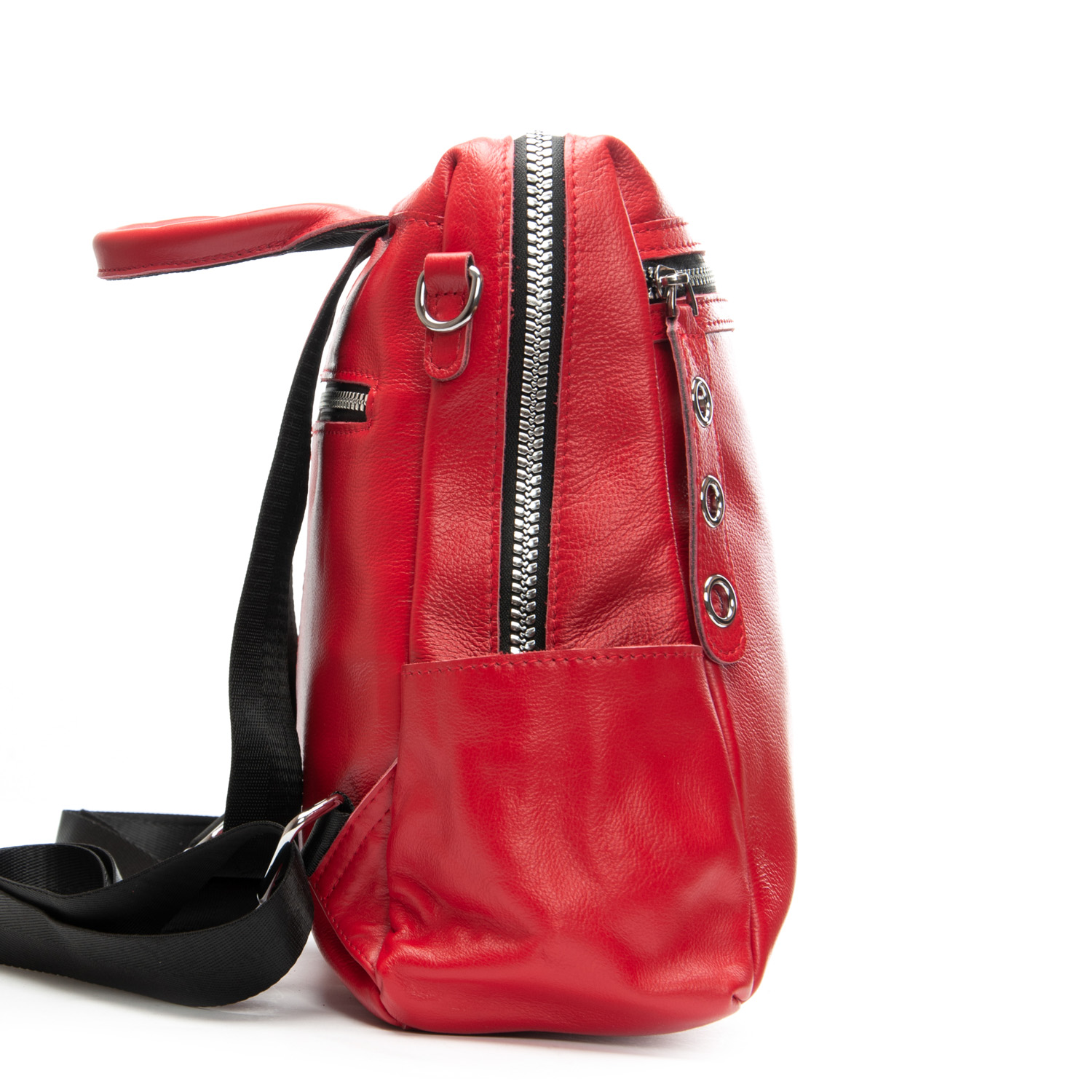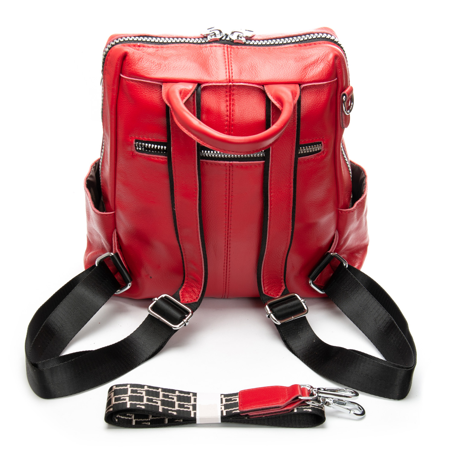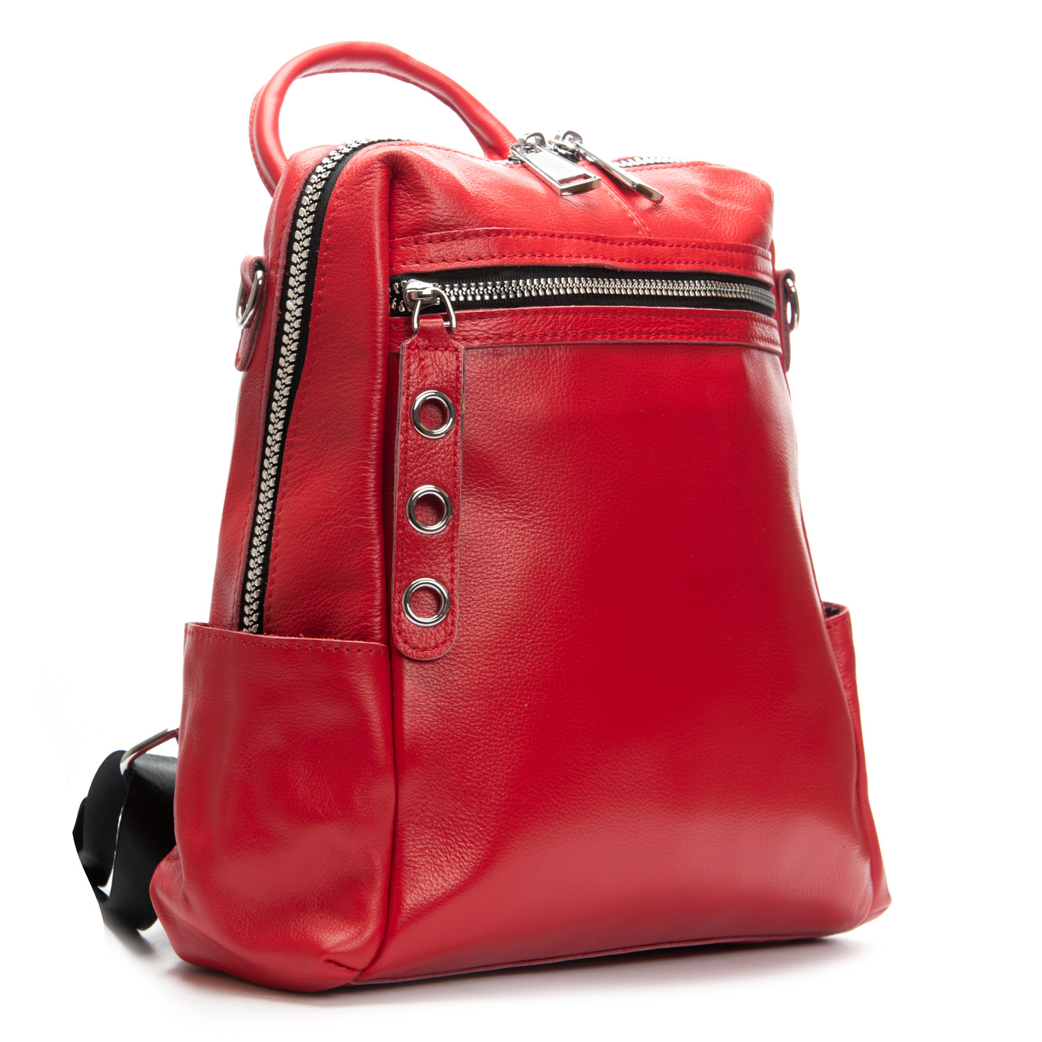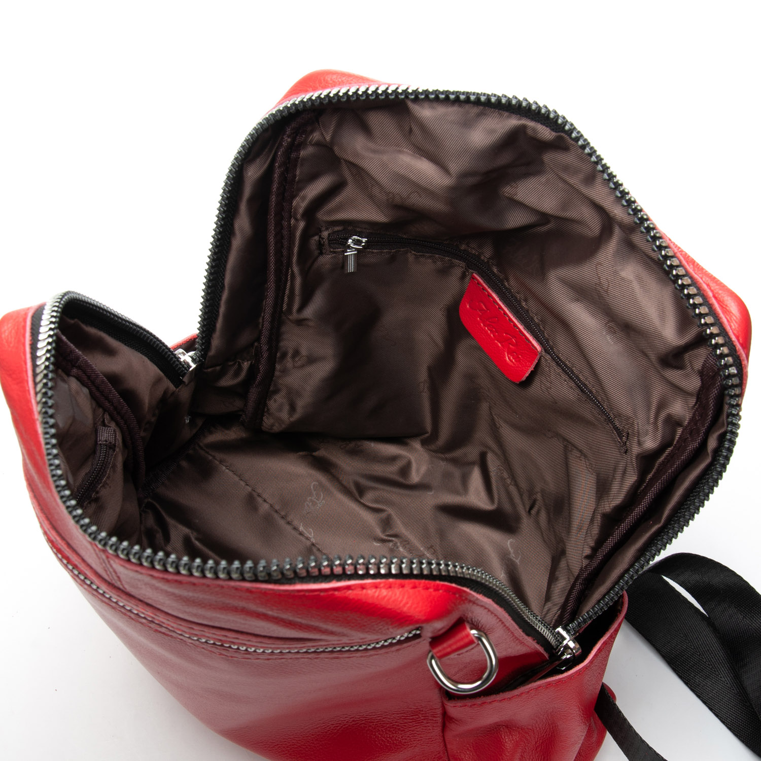 Можно носить на плече на широком ремне. Закрывается на молнию. Внутри находится основное и дополнительное отделение, разделенное карманом-перегородкой на молнии и карман на молнии. Снаружи рюкзака на фасаде и обратной стороне расположены карманы на молнии. На торцах рюкзака есть небольшие открытые карманы. Плечевые лямки регулируются по длине.
