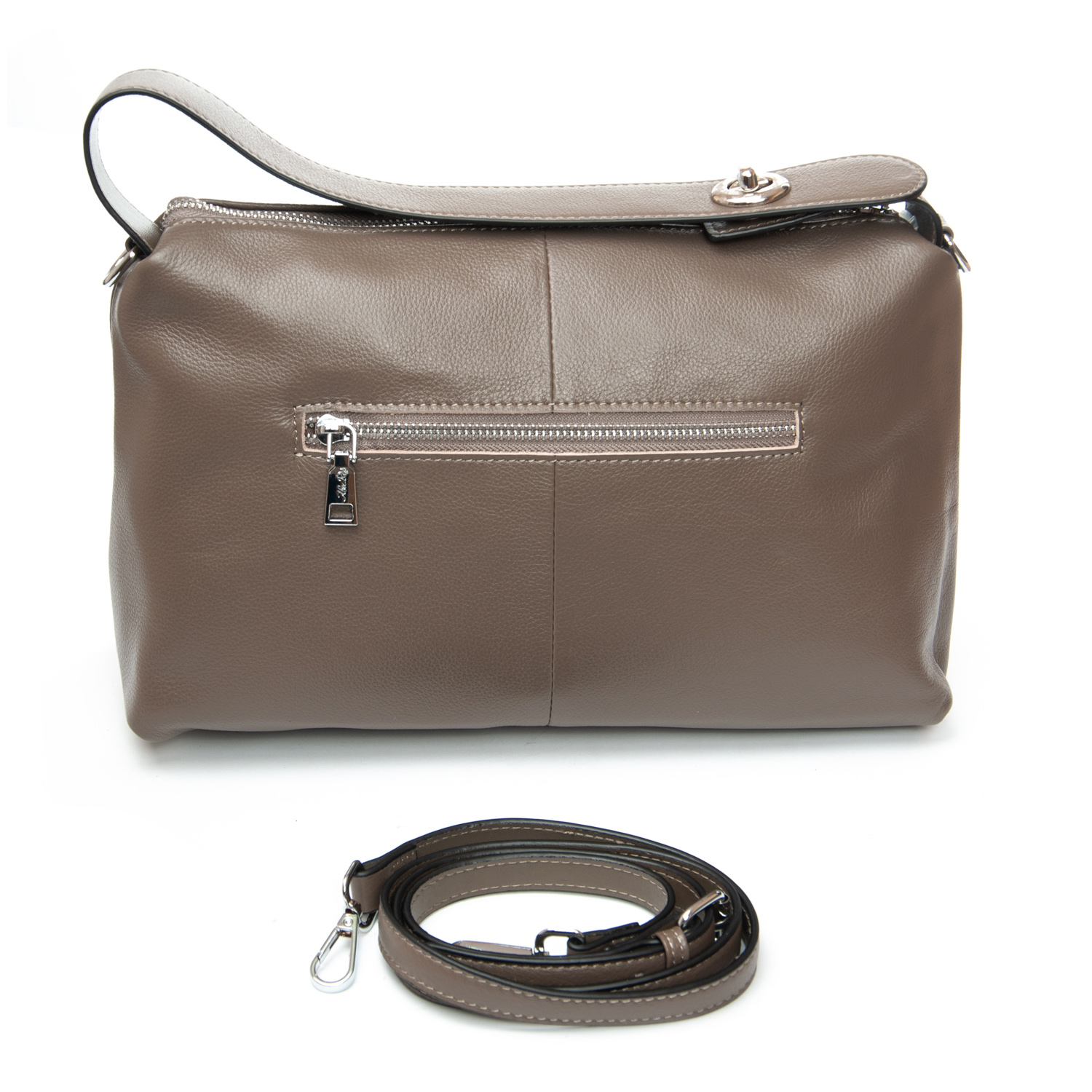Закрывается на молнию. Внутри находится одно отделение, в котором есть карман на молнии и открытый карман. Снаружи сумки на обратной стороне расположен большой карман на молнии. Уплотненное дно.