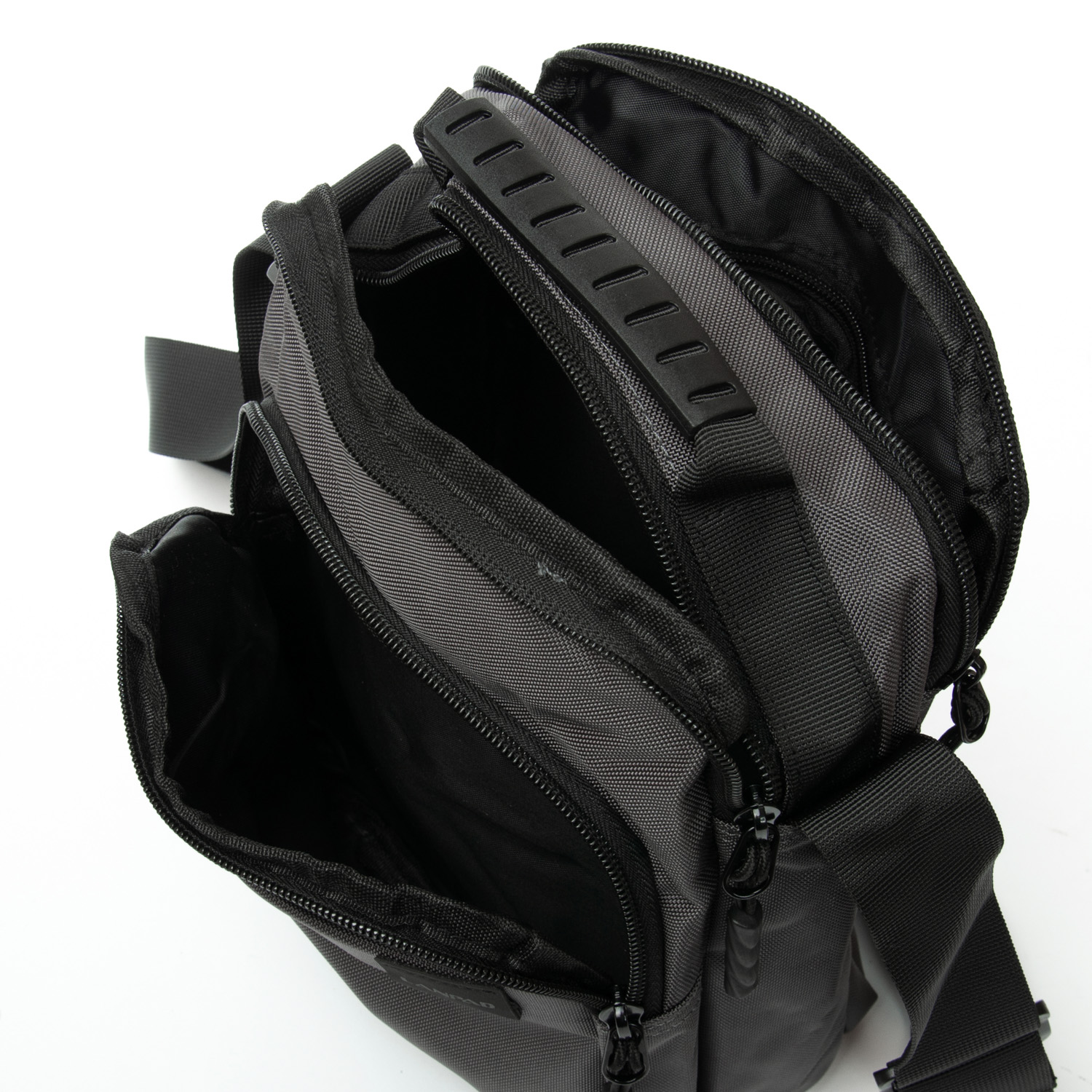 Два больших отделения, закрываются на молнии. Внутри одного отделения есть боковой карман на молнии, а во втором есть открытый карман. На фасаде находятся два кармана на молнии. На обратной стороне сумки есть один карман на молнии.