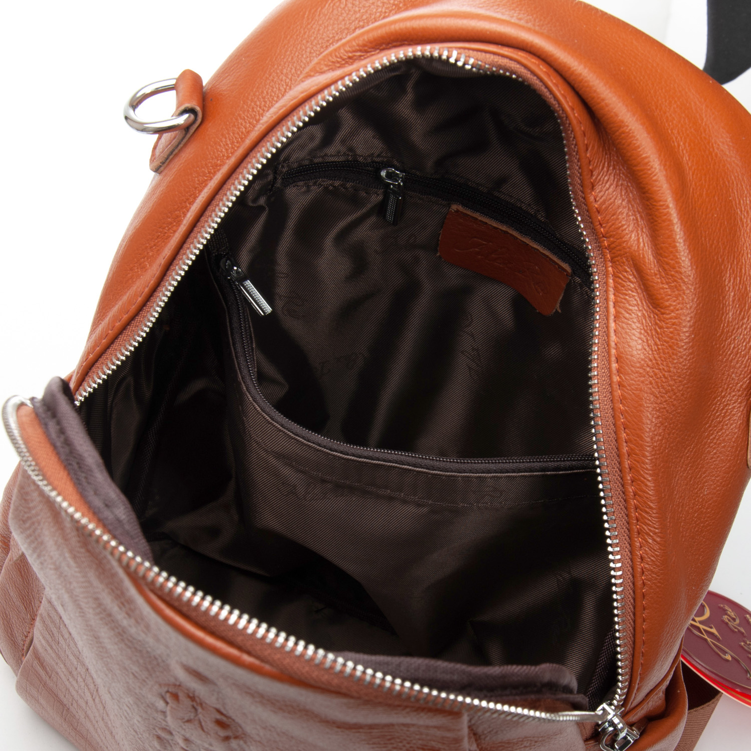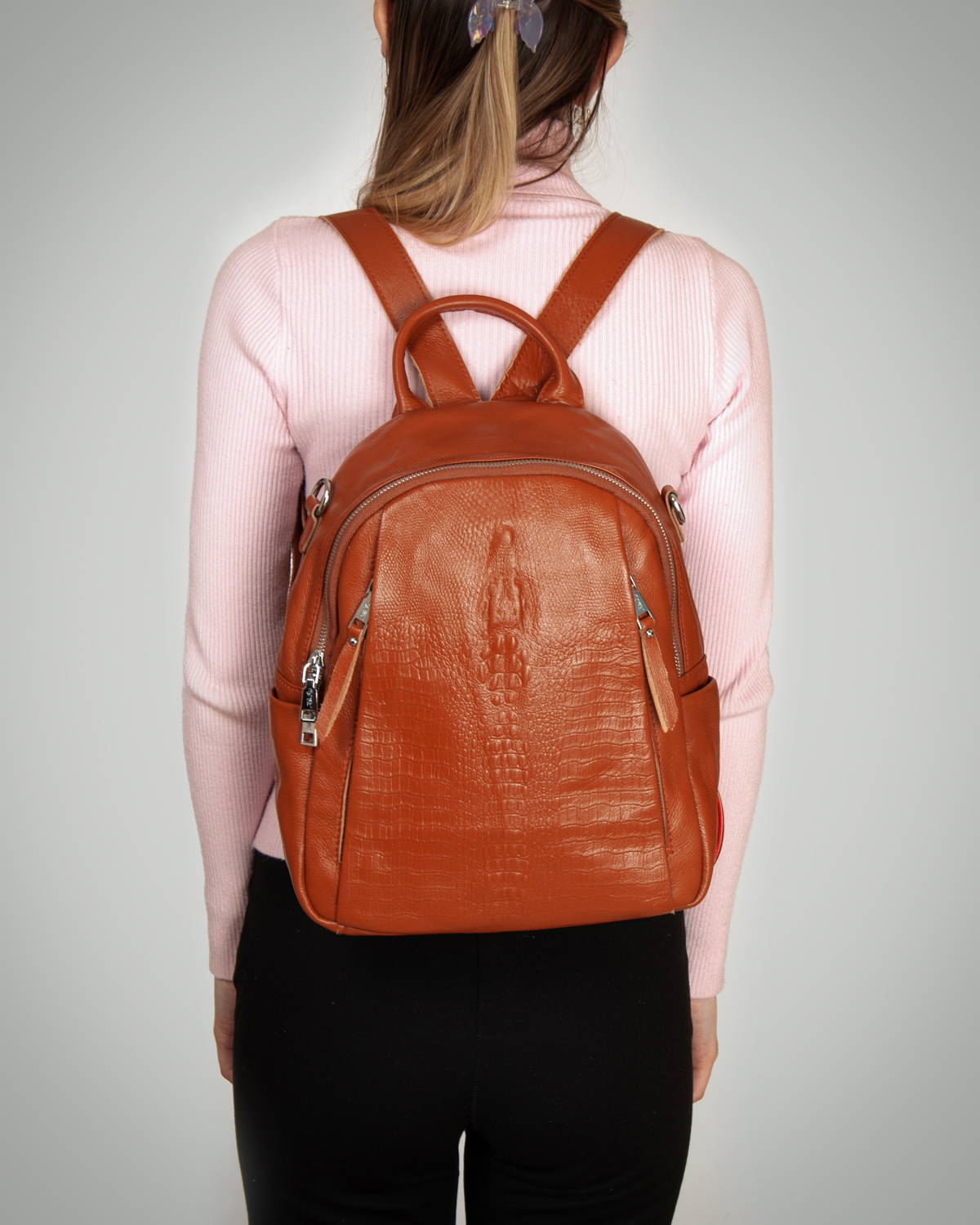 Изготовлена из натуральной мягкой кожи. Можно носить на плече на широком ремне. Закрывается на молнию. Внутри находится основное и дополнительное отделение, разделенное карманом-перегородкой на молнии, открытый карман и карман на молнии. Снаружи рюкзака на фасаде и обратной стороне расположены карманы на молнии. На торцах рюкзака есть небольшие открытые карманы.