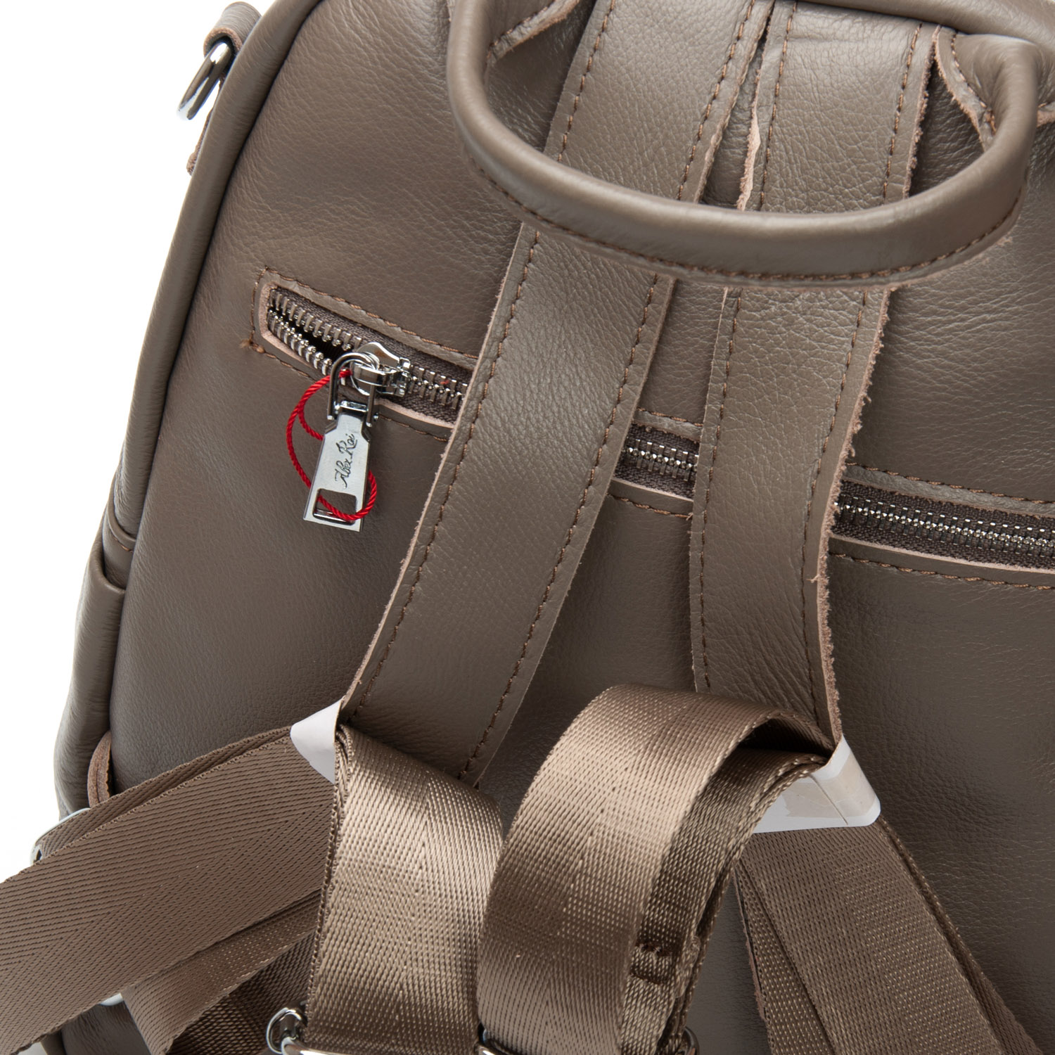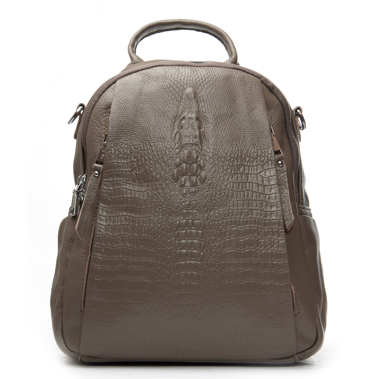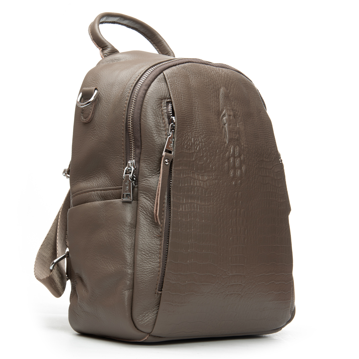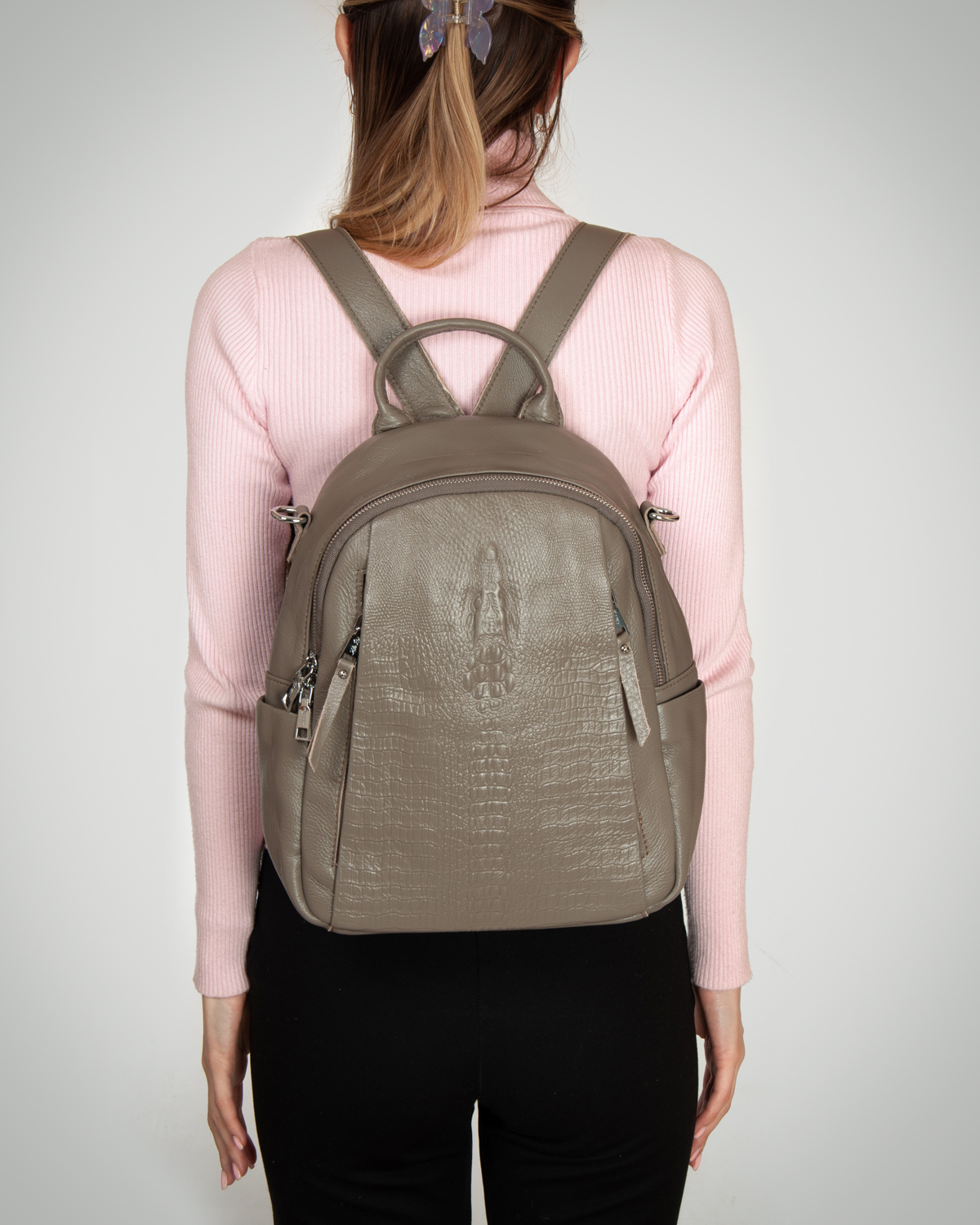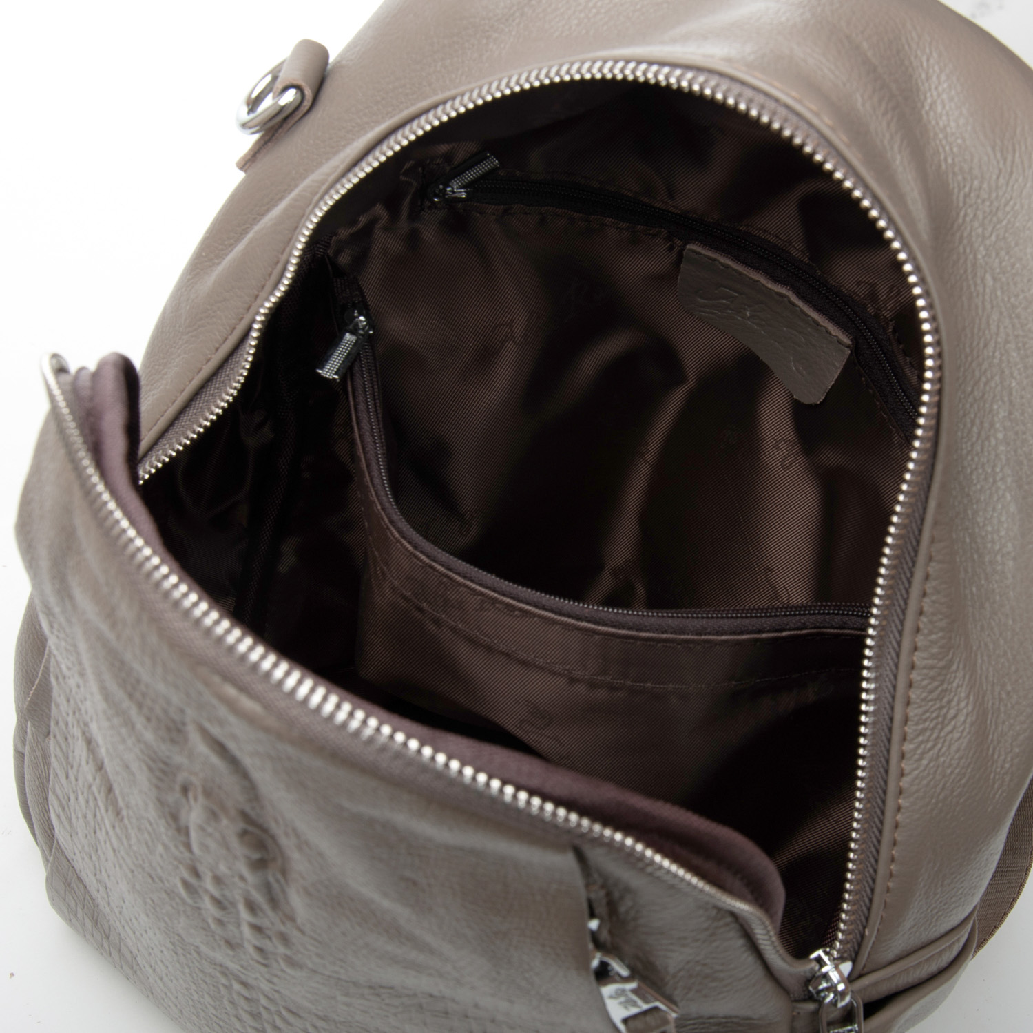 Изготовлена из натуральной мягкой кожи. Можно носить на плече на широком ремне. Закрывается на молнию. Внутри находится основное и дополнительное отделение, разделенное карманом-перегородкой на молнии, открытый карман и карман на молнии. Снаружи рюкзака на фасаде и обратной стороне расположены карманы на молнии. На торцах рюкзака есть небольшие открытые карманы.