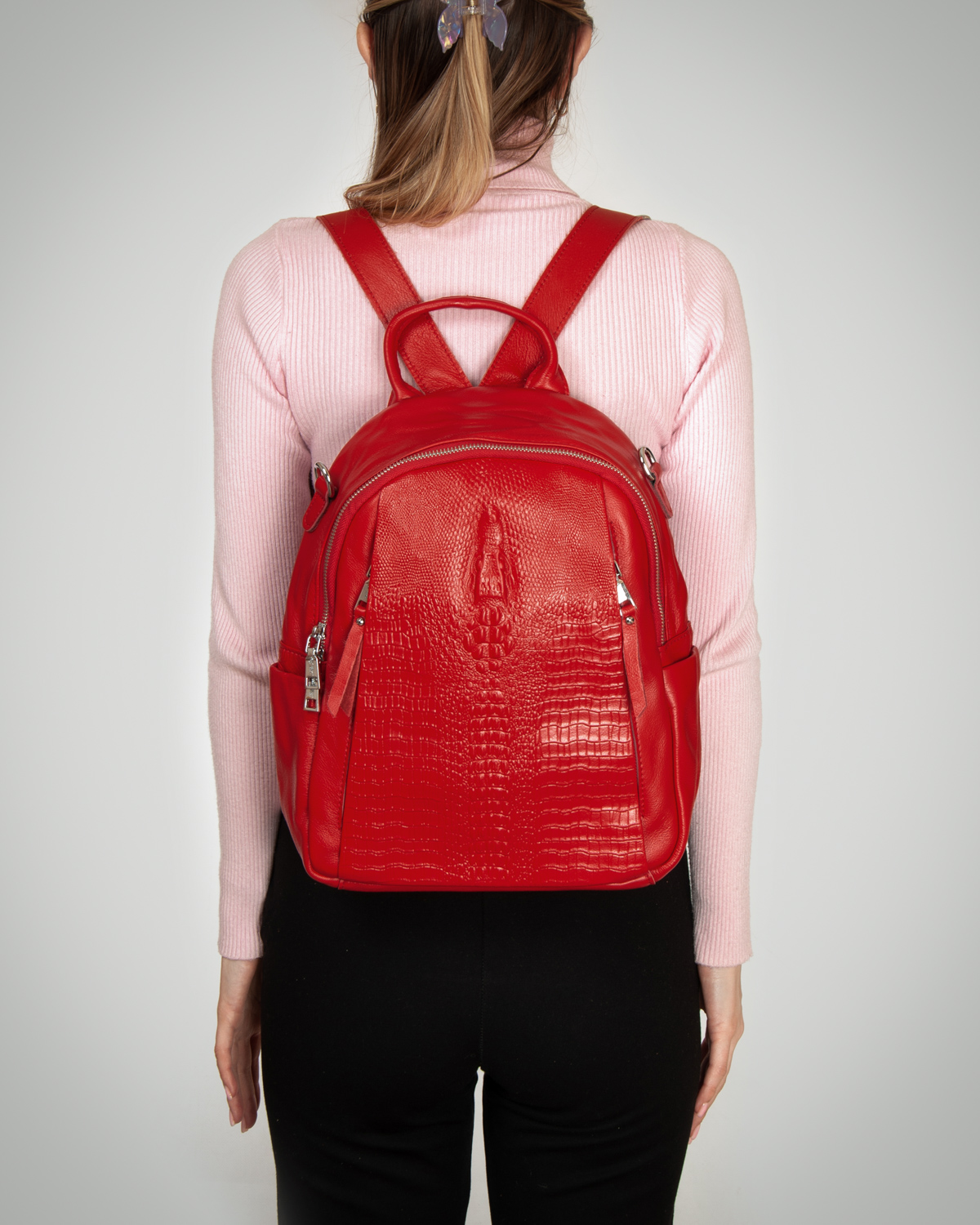 Изготовлена из натуральной мягкой кожи. Можно носить на плече на широком ремне. Закрывается на молнию. Внутри находится основное и дополнительное отделение, разделенное карманом-перегородкой на молнии, открытый карман и карман на молнии. Снаружи рюкзака на фасаде и обратной стороне расположены карманы на молнии. На торцах рюкзака есть небольшие открытые карманы.