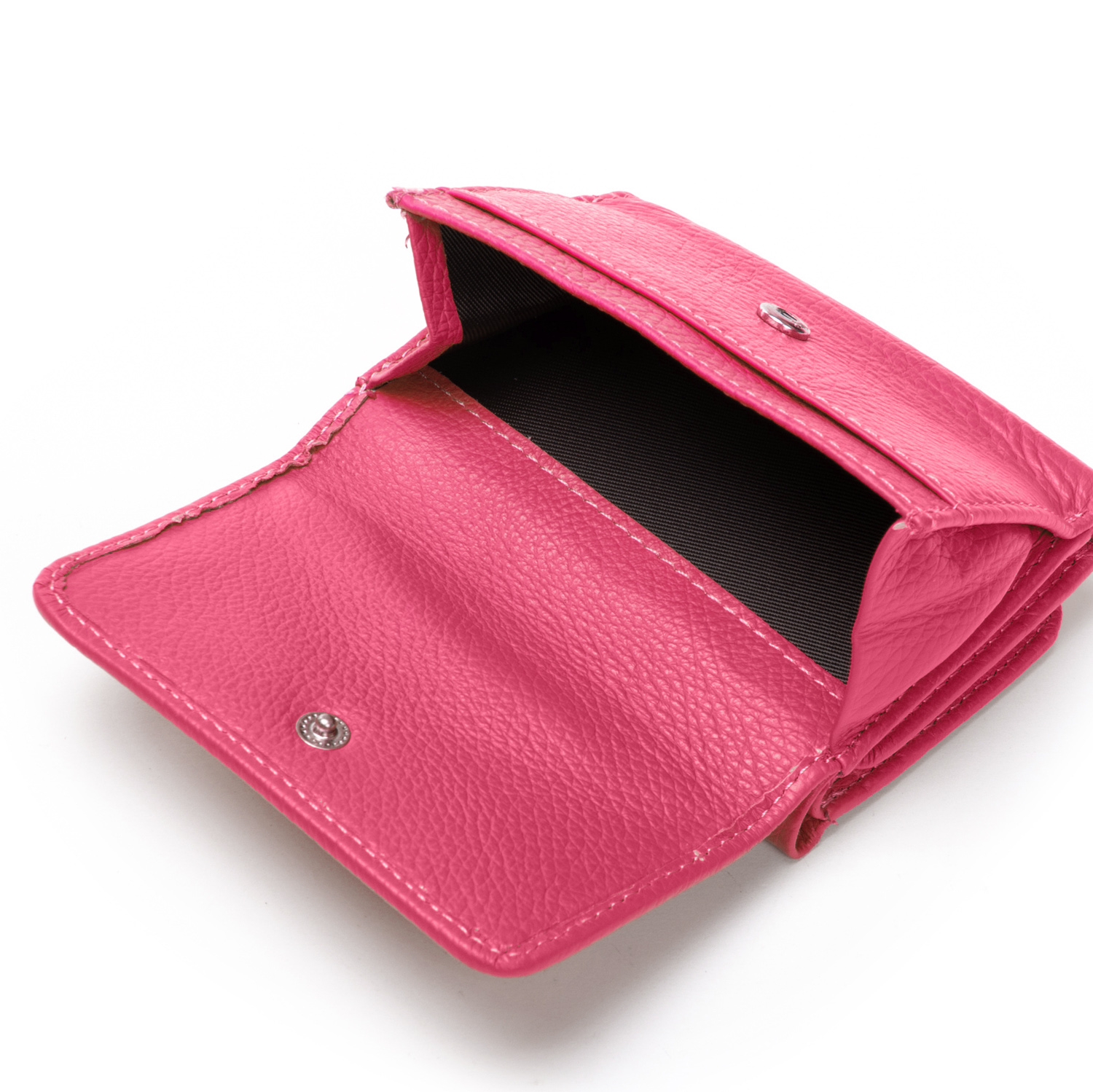 Внутри находятся два больших открытых отделения для банкнот (разделены кожаной перегородкой) и 7 карманов для визитных карт, один из которых выполнен прозрачным. Снаружи кошелька на обратной стороне есть монетница на кнопке.