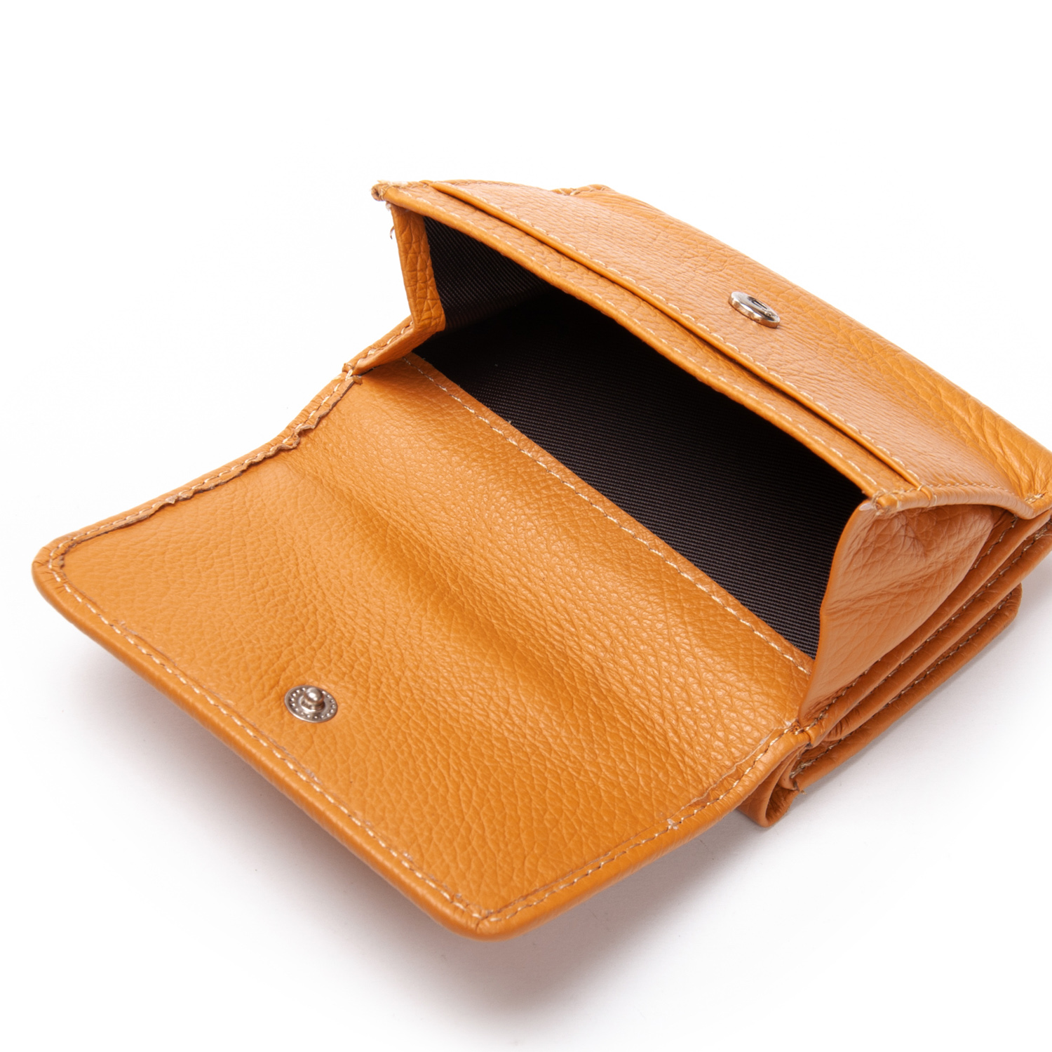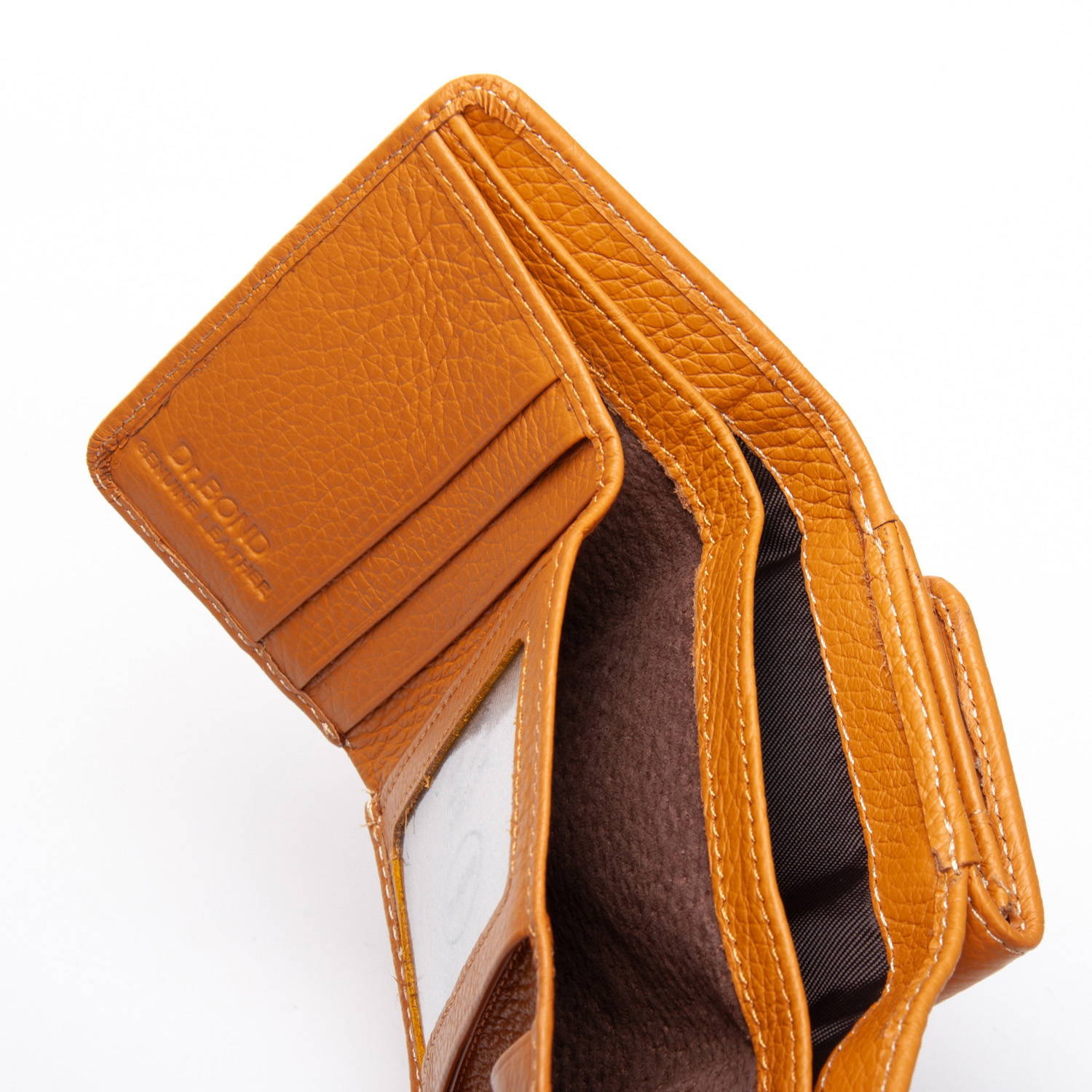Внутри находятся два больших открытых отделения для банкнот (разделены кожаной перегородкой) и 7 карманов для визитных карт, один из которых выполнен прозрачным. Снаружи кошелька на обратной стороне есть монетница на кнопке.