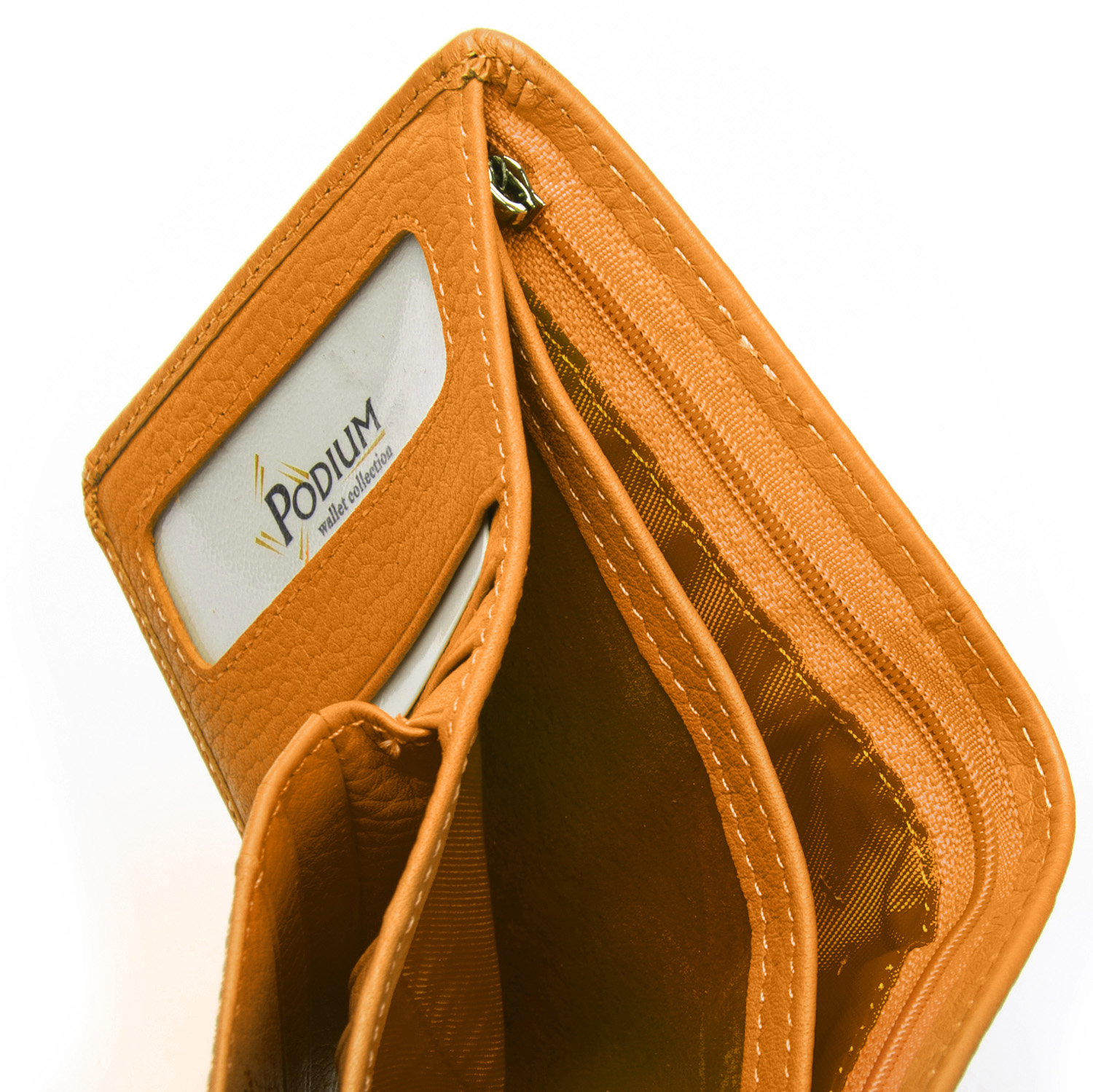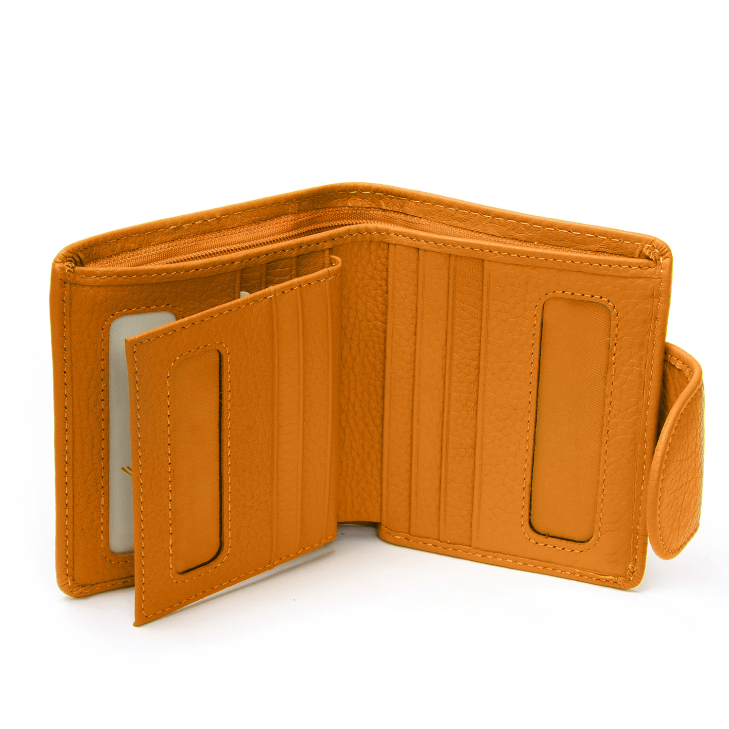 Внутри находятся два больших открытых отделения для банкнот (разделены кожаной перегородкой) и одно отделение на молнии. Также есть 12 карманов для визитных карт, 4 из которых выполнены прозрачными. Снаружи кошелька на обратной стороне есть монетница на кнопке.
