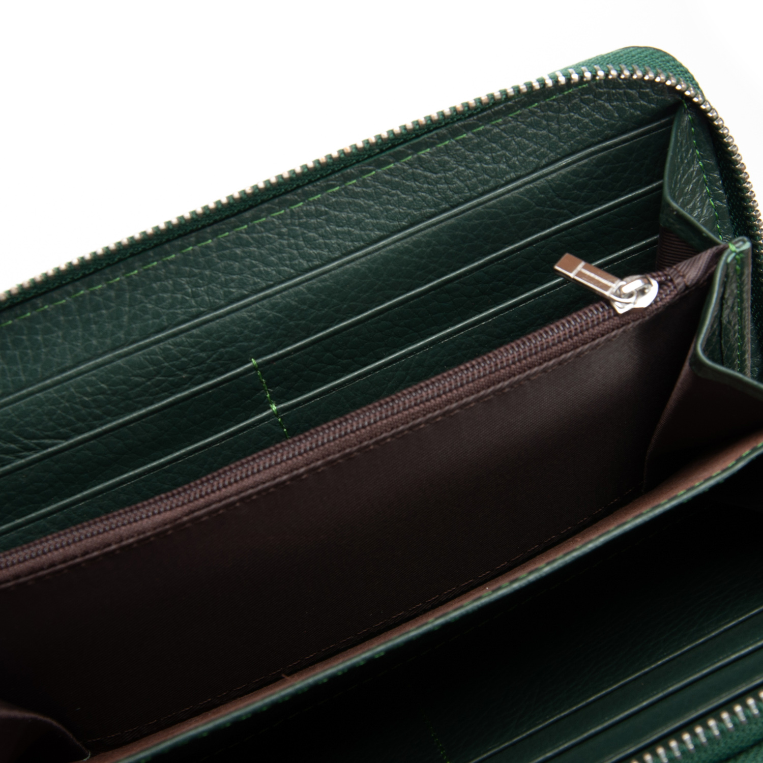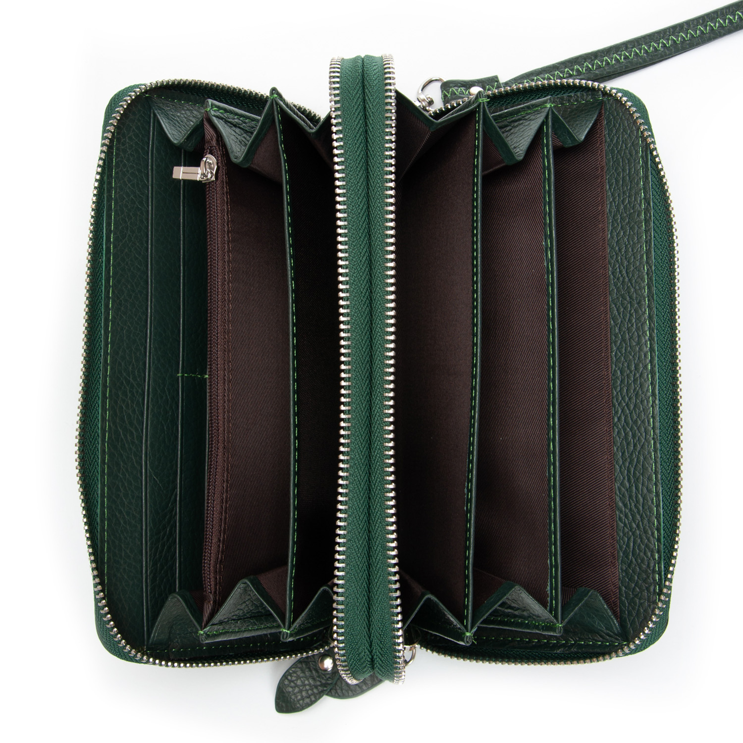 Два отделения, закрываются на молнию. Внутри каждого отделения есть 3 кармана для банкнот. В переднем отделении также находится карман для мелочи на молнии, два больших открытых кармана и 8 карманов для визитных карт.