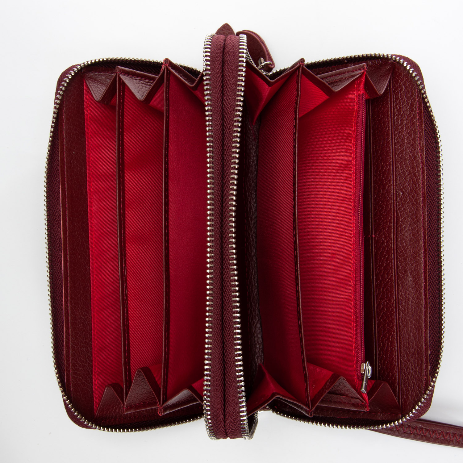 Два отделения, закрываются на молнию. Внутри каждого отделения есть 3 кармана для банкнот. В переднем отделении также находится карман для мелочи на молнии, два больших открытых кармана и 8 карманов для визитных карт.