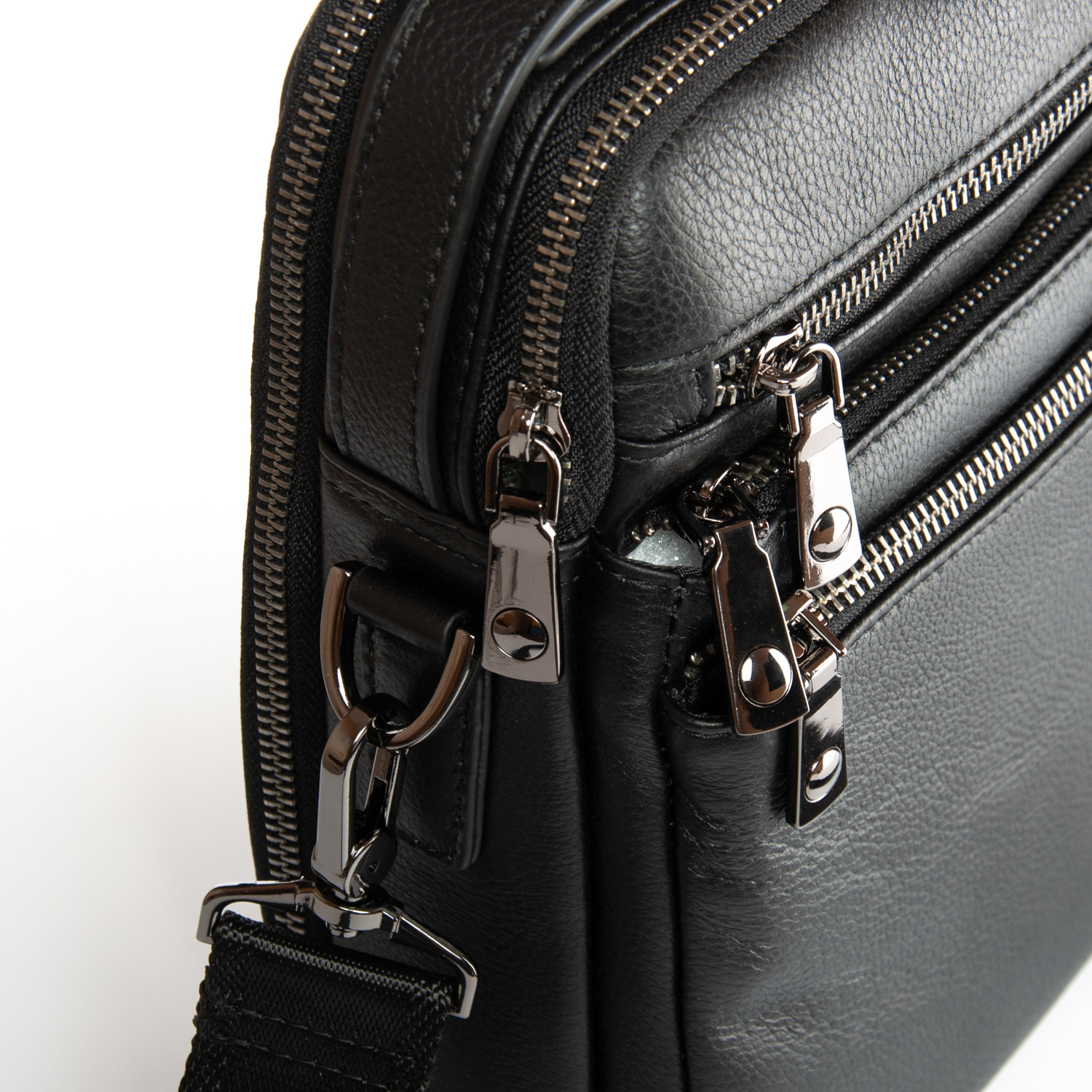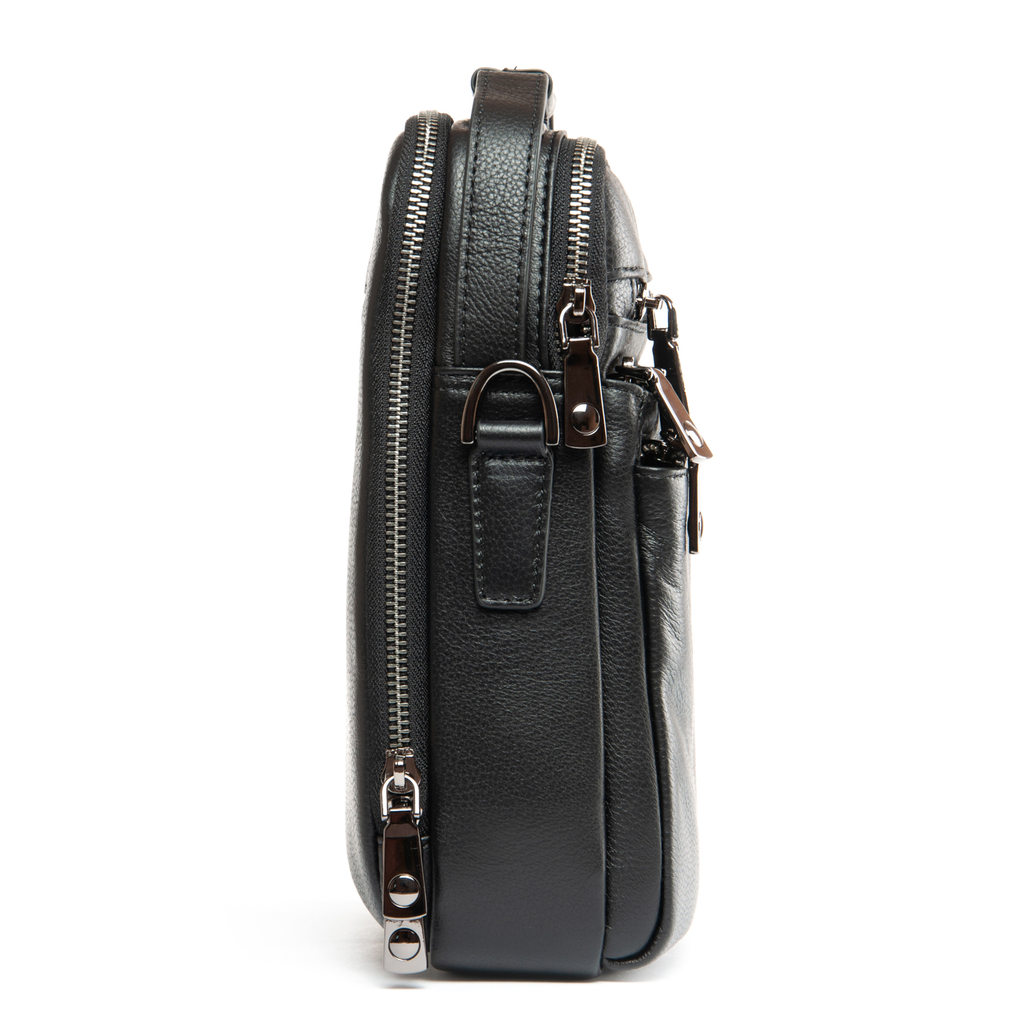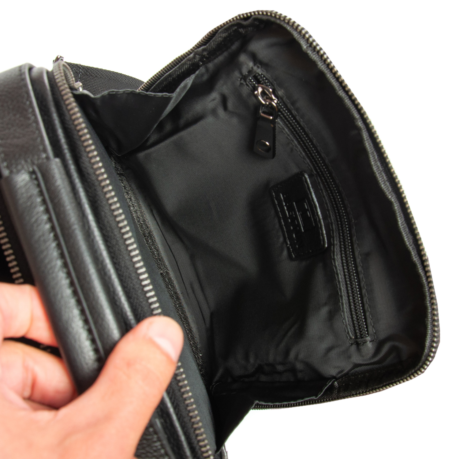 Изготовлена из мягкой натуральной кожи. Два отделения, закрываются на молнию. Внутри отделений есть открытый карман и боковой карман на молнии. На фасаде находятся три кармана на молнии, а на обратной стороне сумки есть один карман на молнии.