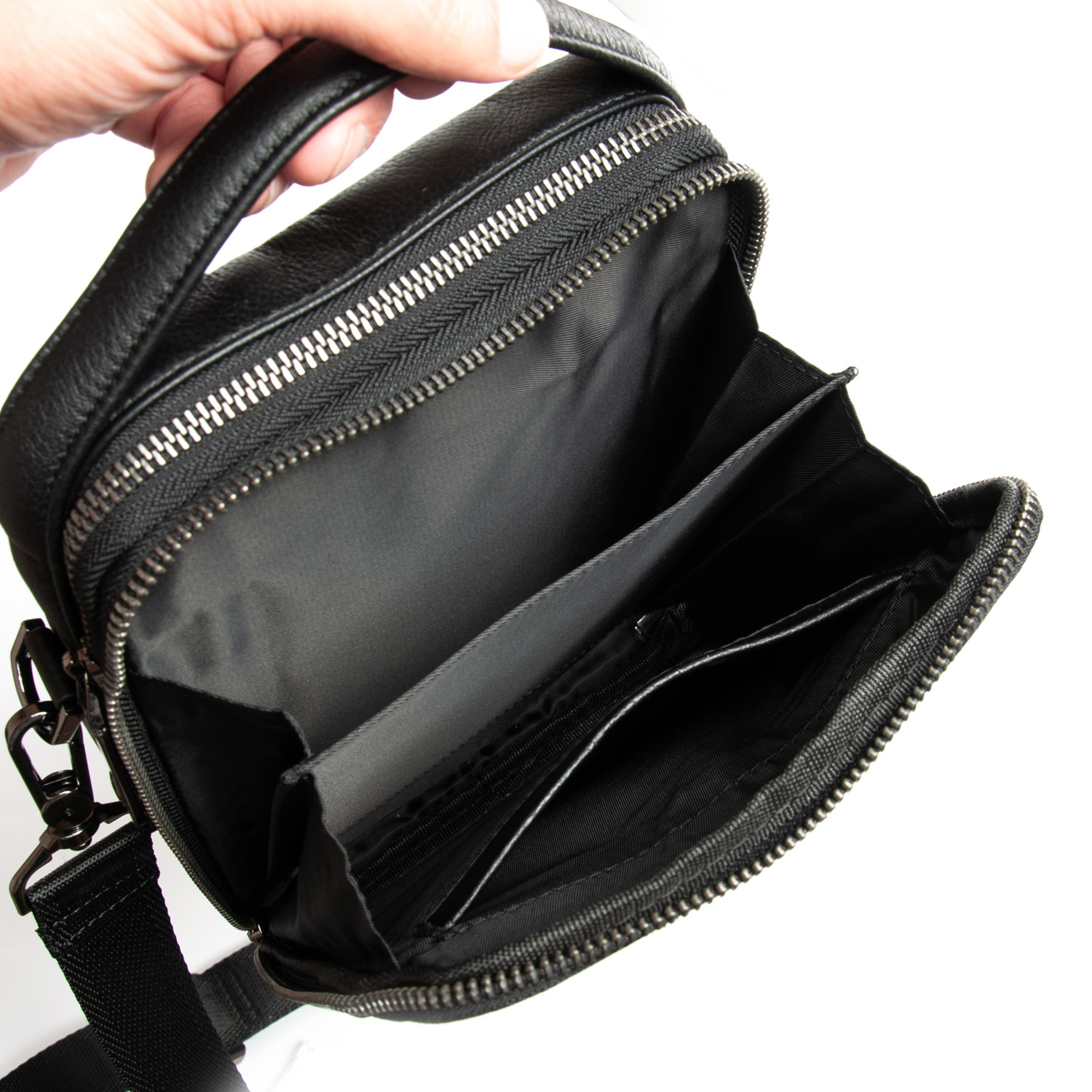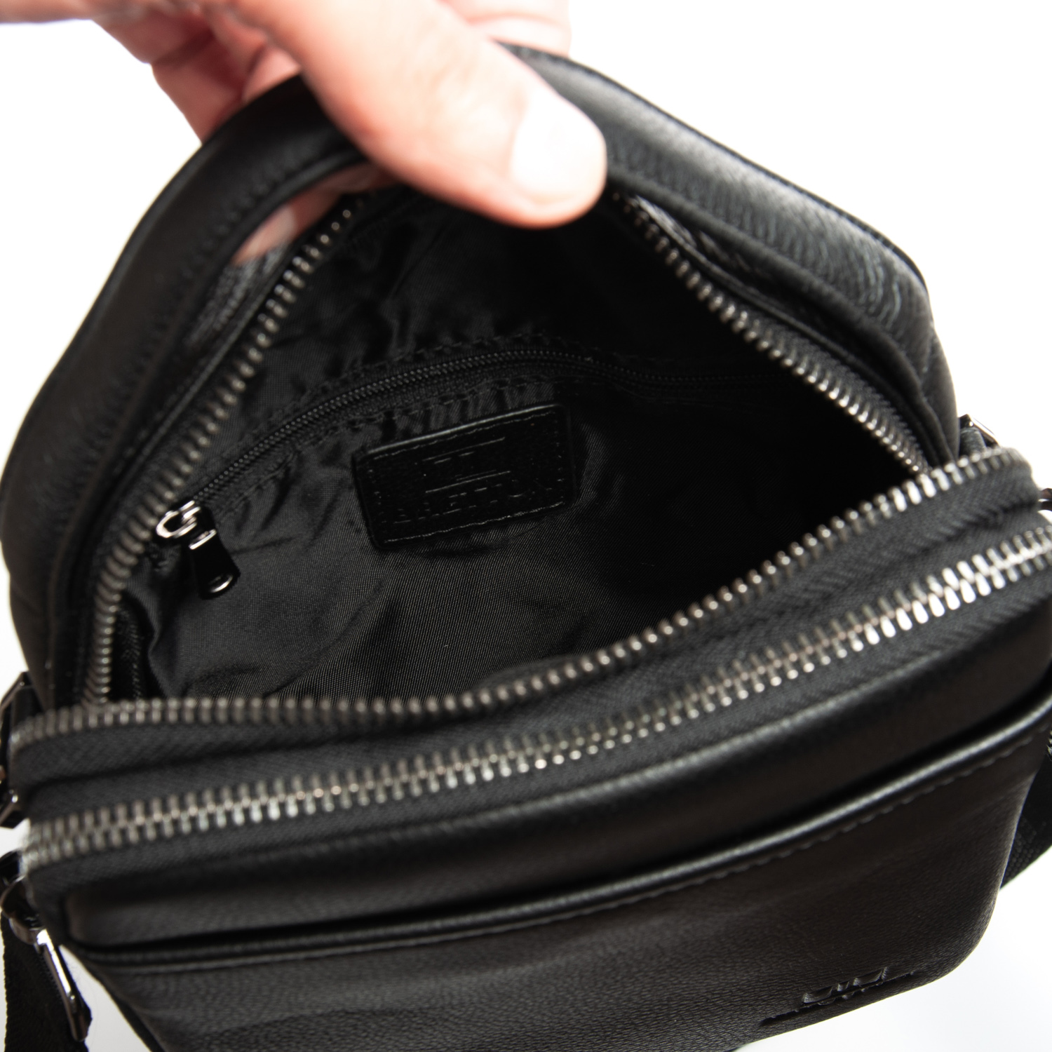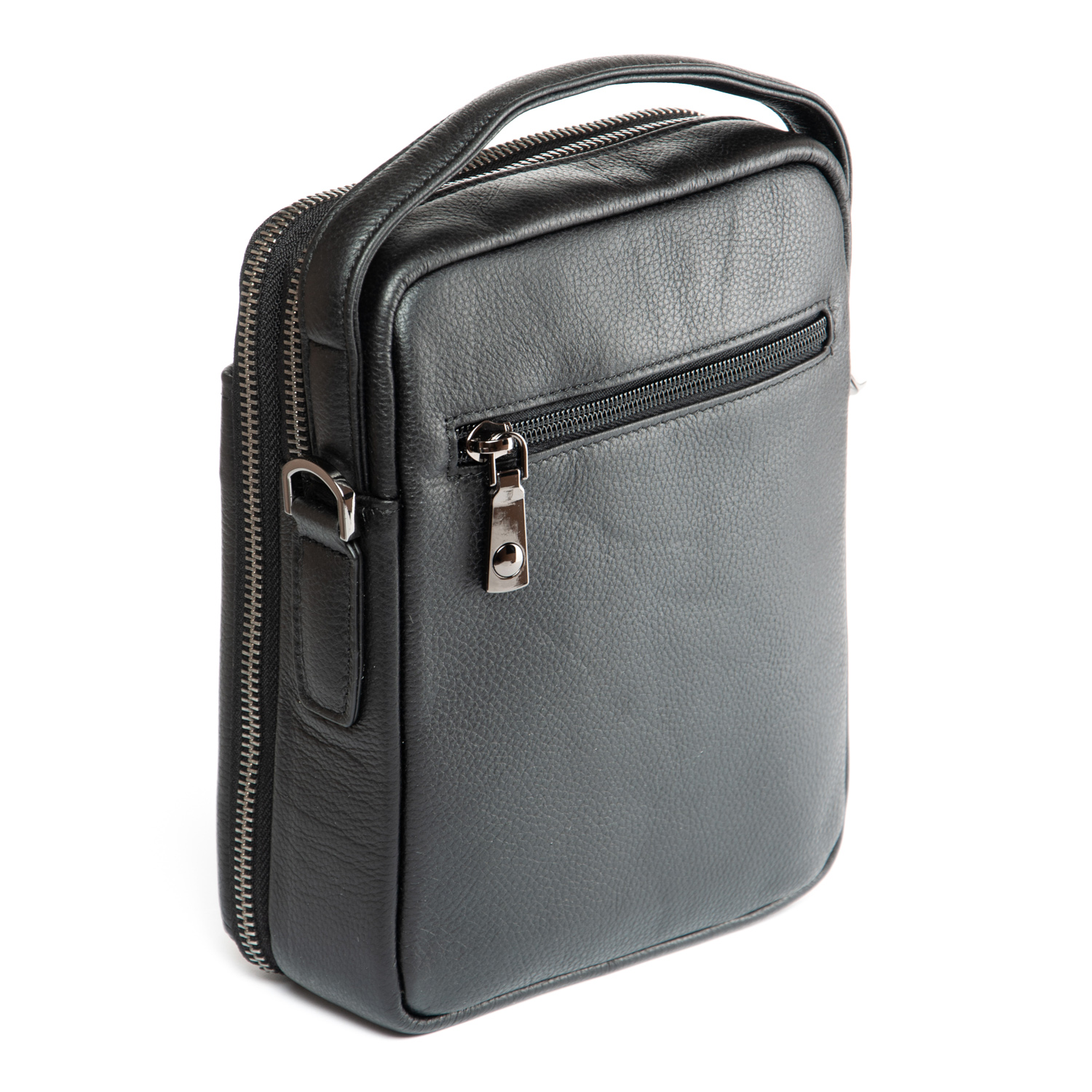Изготовлена из мягкой натуральной кожи. Два отделения, закрываются на молнию. Внутри отделений есть открытый карман и боковой карман на молнии. Переднее отделение дополнительно разделено перегородкой. На фасаде находится кармана на магнитной кнопке, а на обратной стороне сумки есть один карман на молнии.