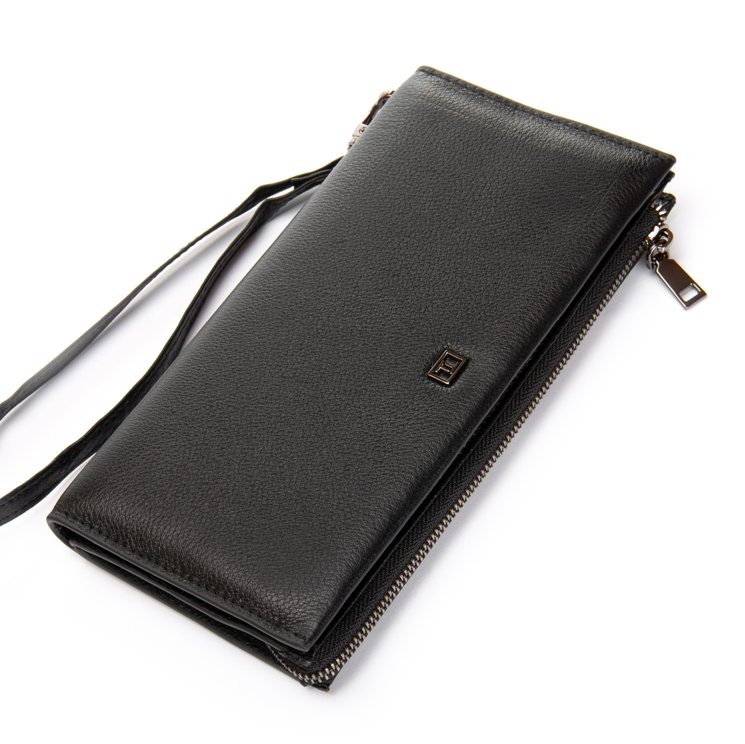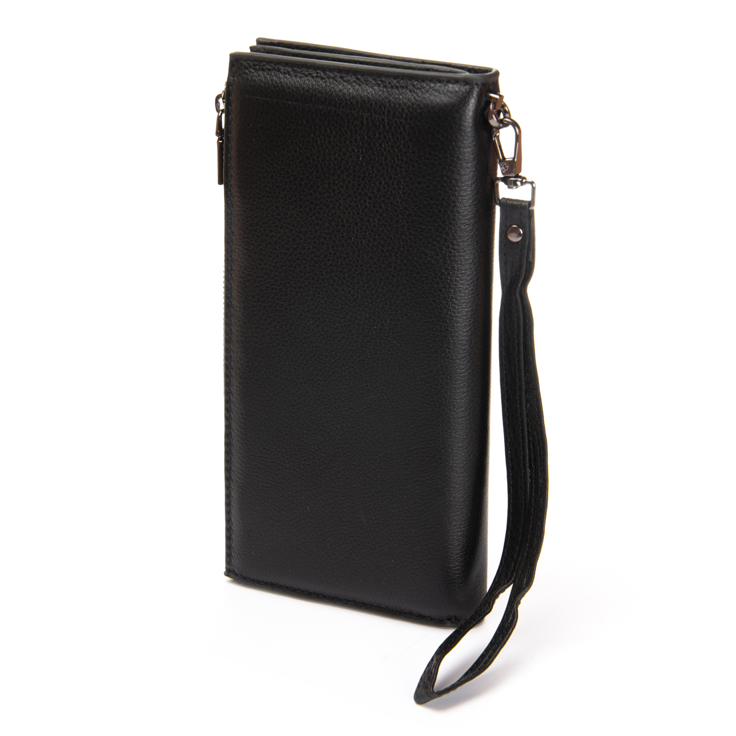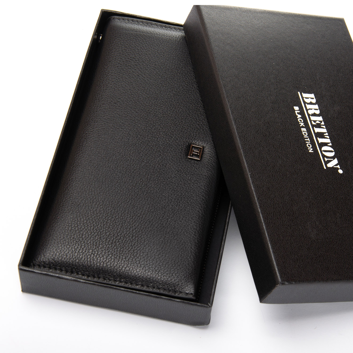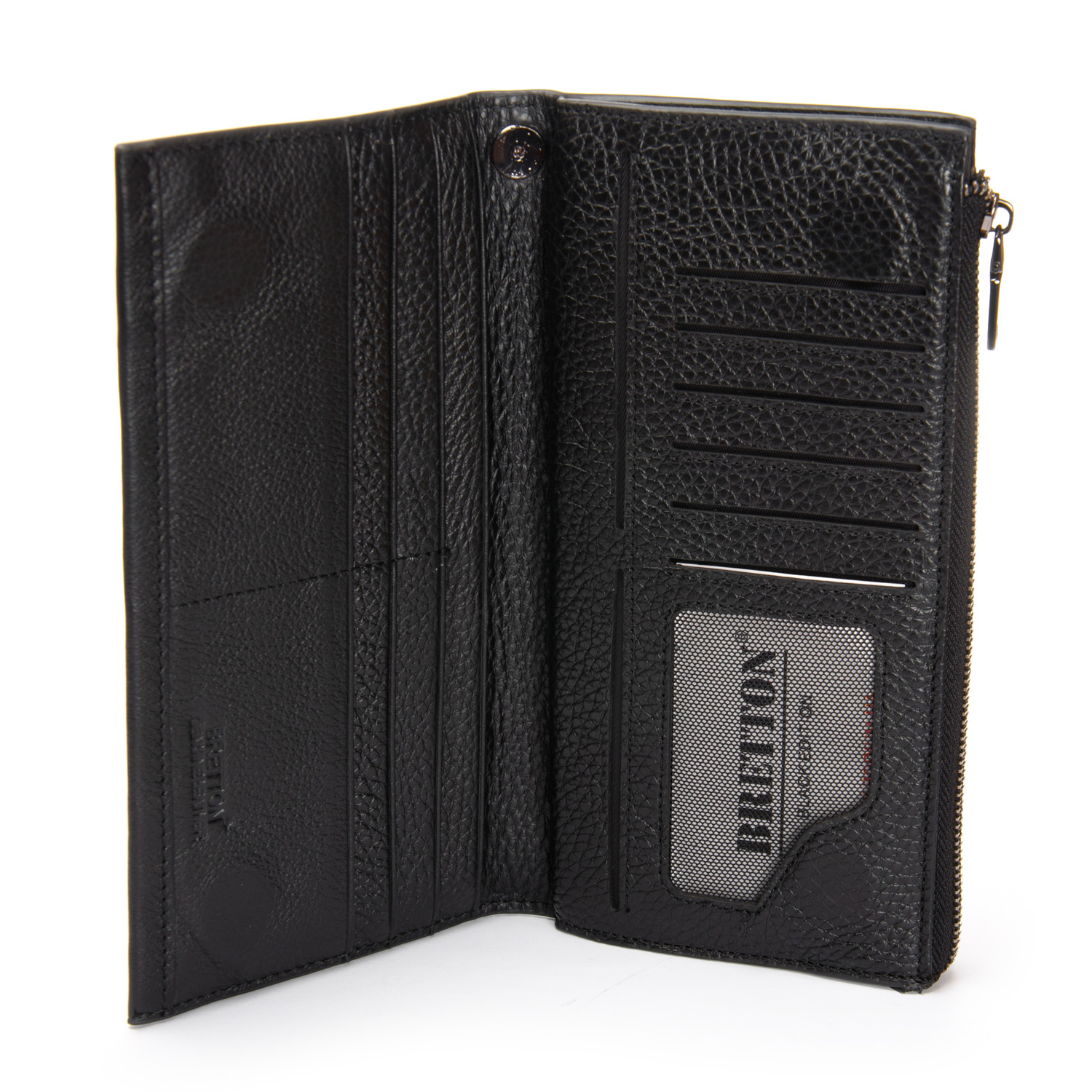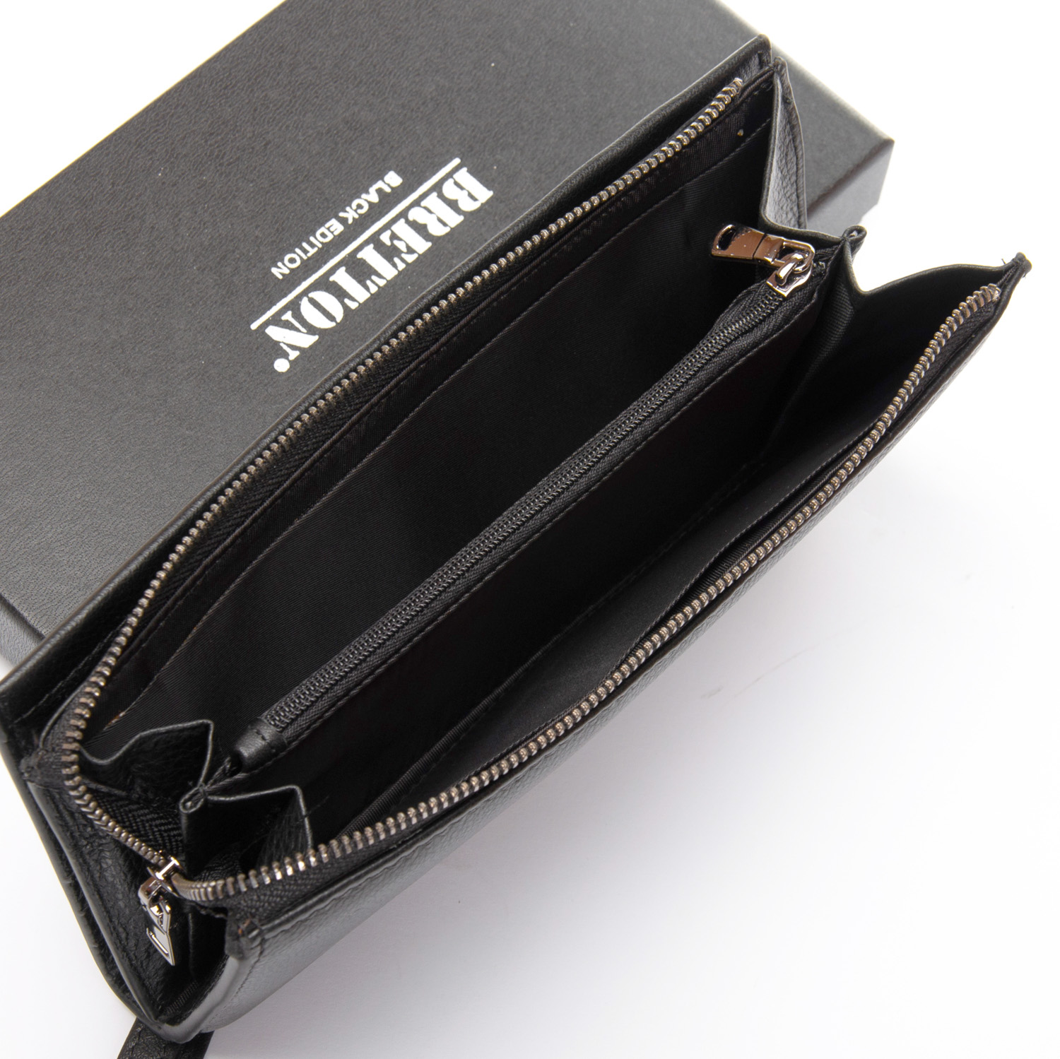 Чоловічий великий шкіряний кошелек-барсетка Bretton, серія Black Edition. Виготовлений з м'якої натуральної шкіри. Два відділення. Відділення для банкнот з подвійною кишенею і монетніцей на блискавці закривається на блискавку. Друге відділення закривається на магнітні кнопки. Усередині є 14 кишень для візитних карт і 2 великих відкритих кишені. У комплекті є знімний кистьовий ремінь. Розмір (см.) 20,5*10,5*3,5