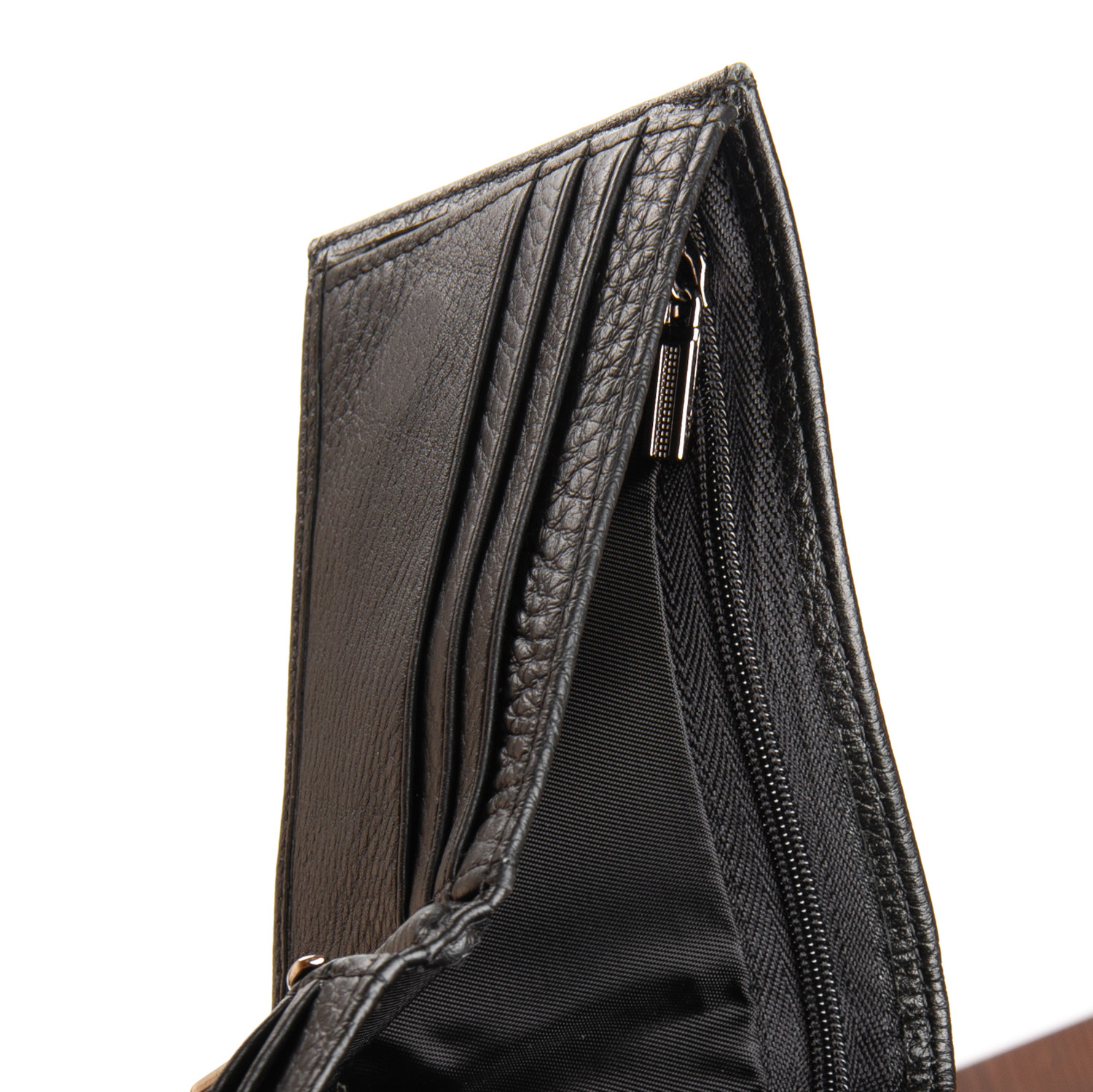 Виготовлений з м'якої натуральної шкіри. Усередині одно відкрите і одно на блискавці відділення для банкнотів, 6 кишень для візитних карт. Зовні знаходиться 3 кишені для карт.