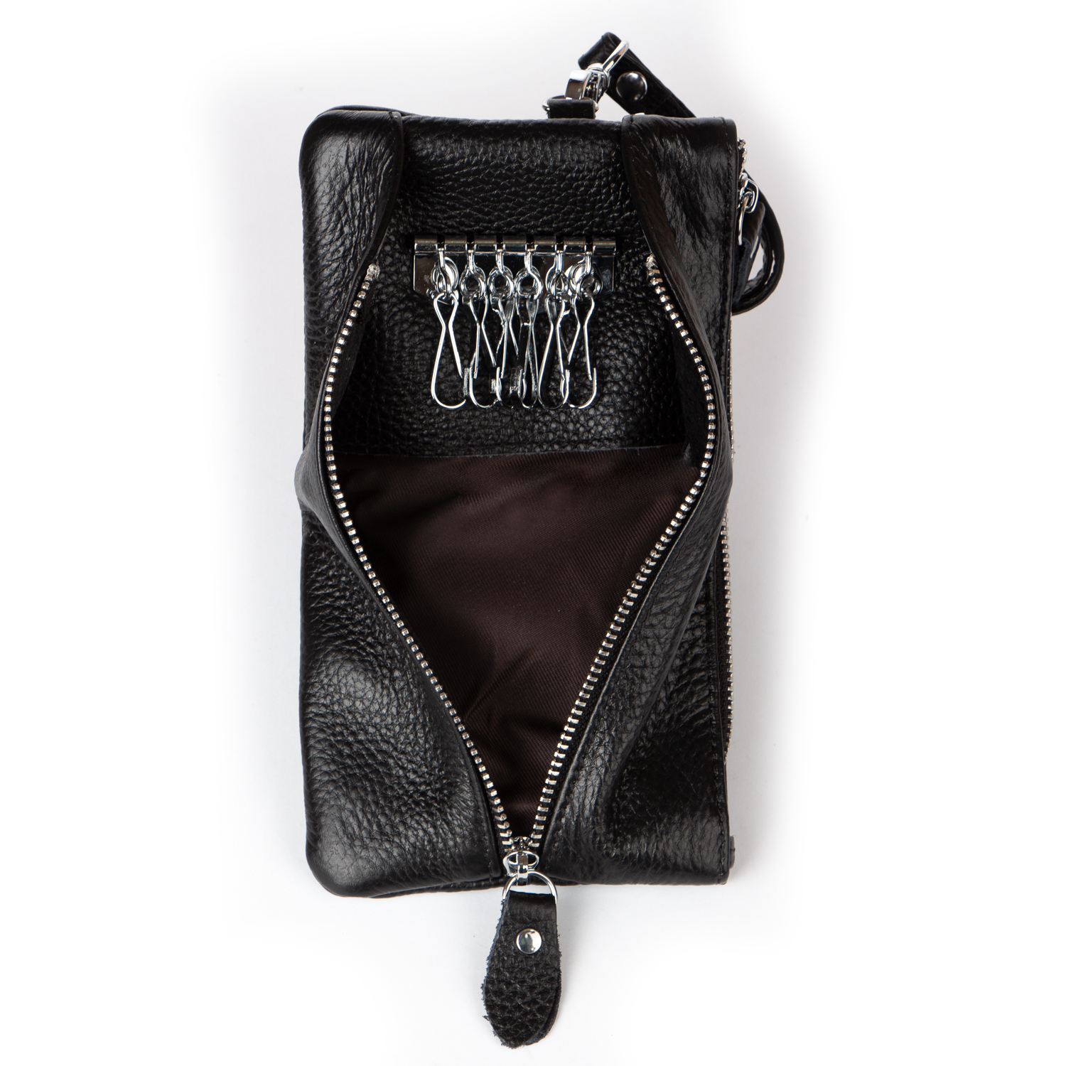 Жіноча шкіряна косметичка – ключниця. Виготовлена ​​з м'якої шкіри. Закривається на блискавку. Одне відділення з боковою відкритою кишенею. На фасаді є велика ключниця на блискавці, а на звороті кишеня на блискавці.