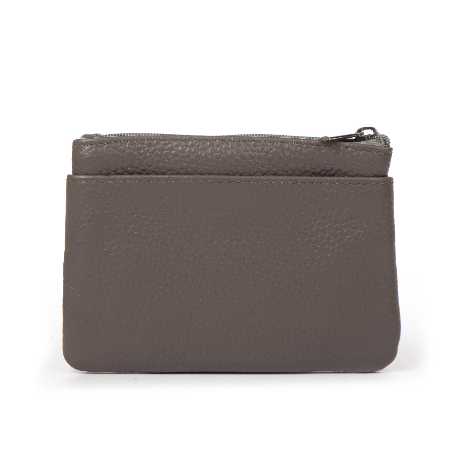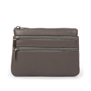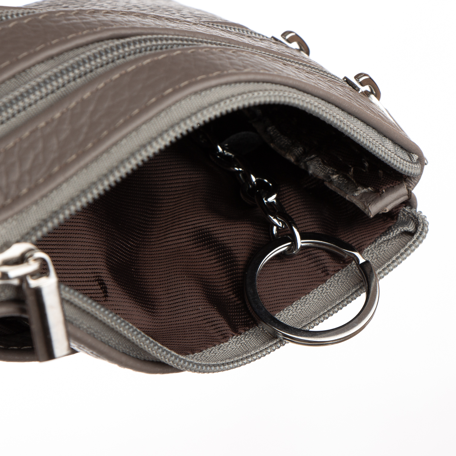 Жіноча шкіряна косметичка – ключниця. Одне відділення для ключів закривається на блискавку. На фасаді розташовані дві кишені на блискавці, а на звороті одна відкрита кишеня.