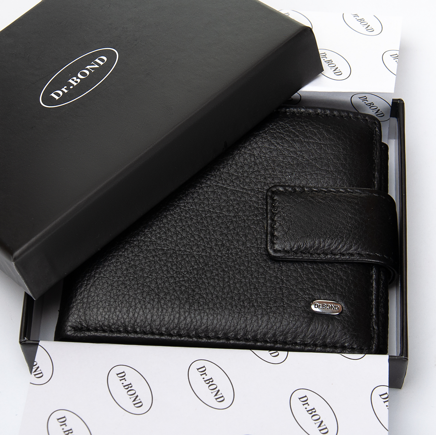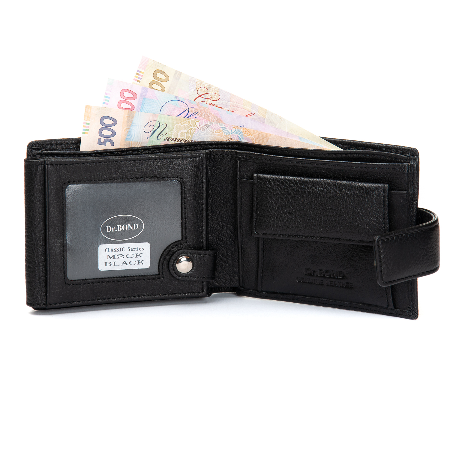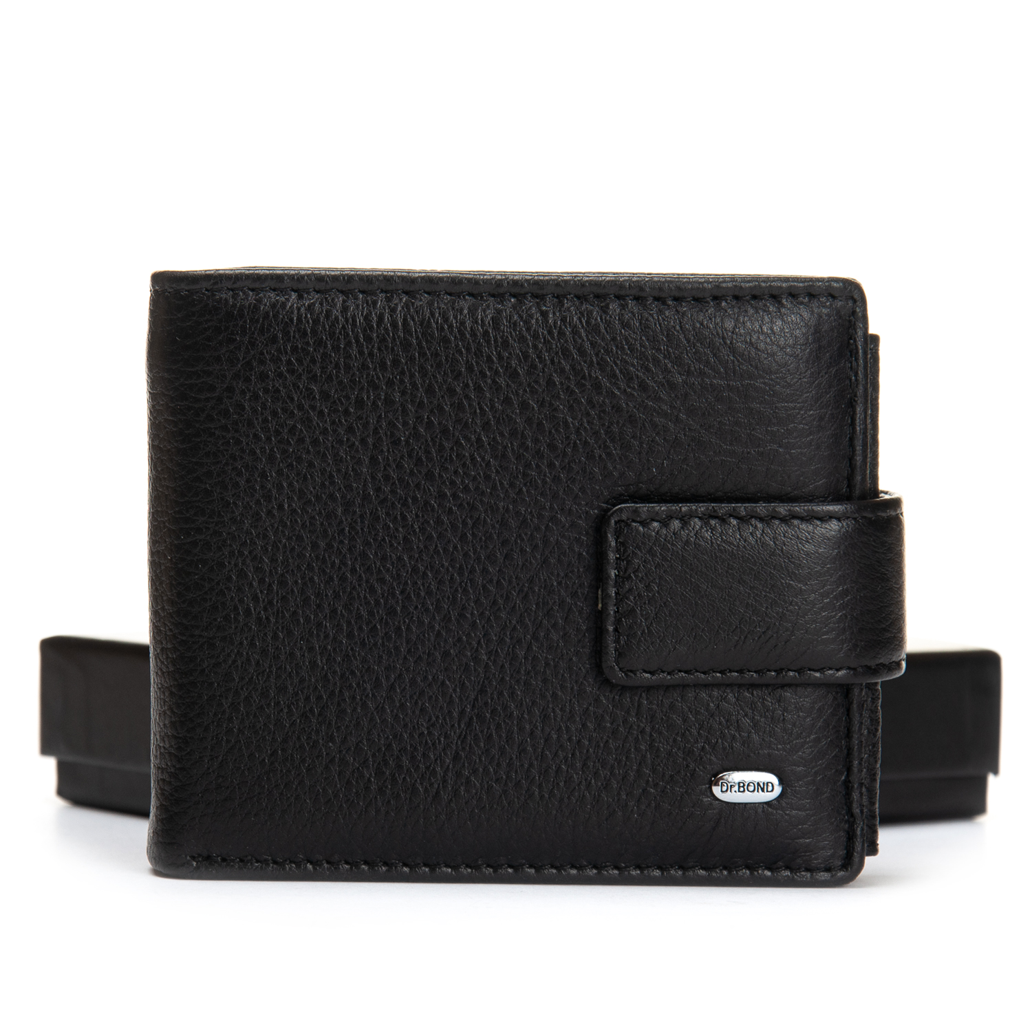 Шкіряне чоловіче портмоне Dr.Bond з натуральної шкіри. Закривається клапаном на прихованому магніті. Усередині знаходиться 3 відділення під банкноти, одне з яких закривається на блискавку. Великий відкидний блок з прозорими кишенями під документи або картки. Також є три кишені для візитних карток. Монетниця на кнопке.